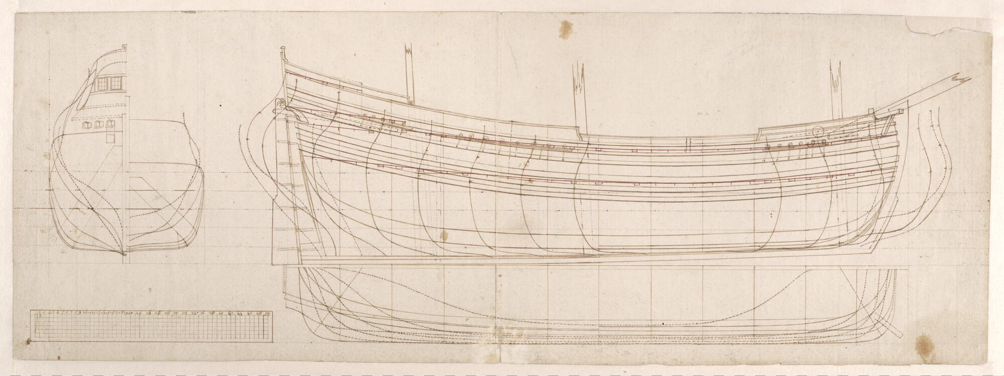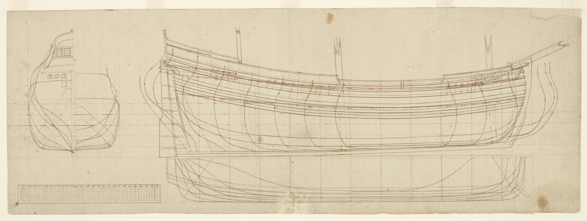 Spantenraam, waterlijnen, zijaanzicht, vooraanzicht en achteraanzicht van een fluitschip.