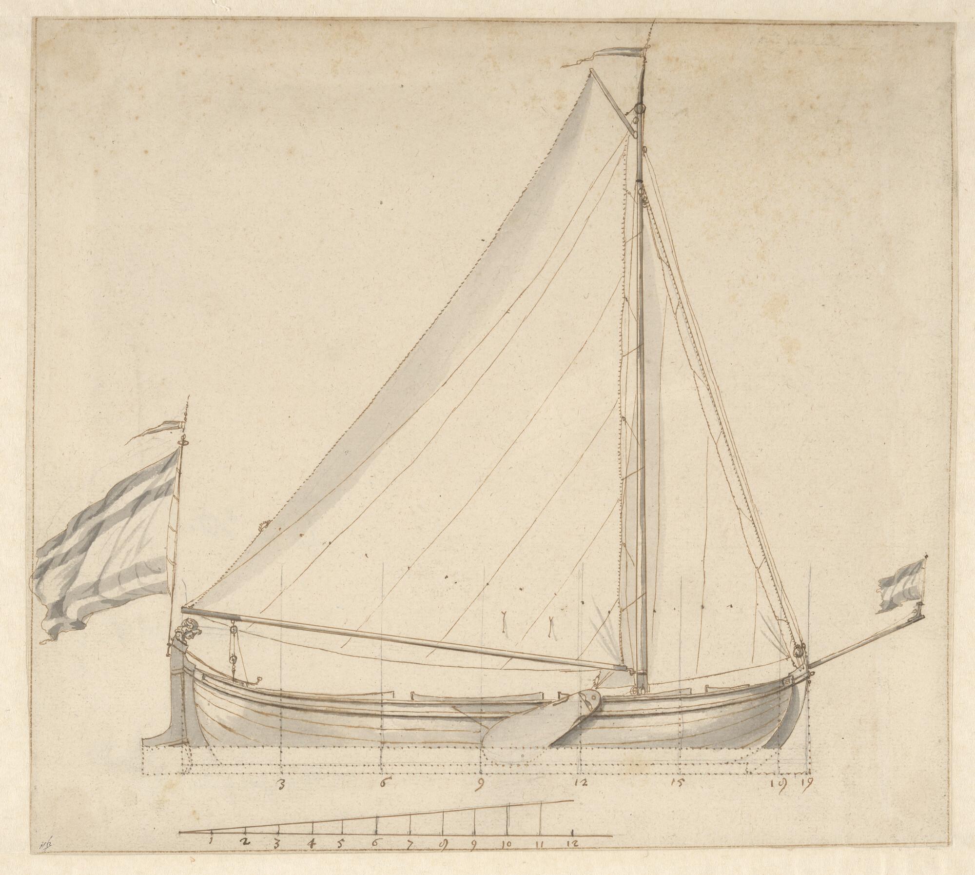 Zijaanzicht van een kopjacht van 19 voet, zes riems en bezaantuig.