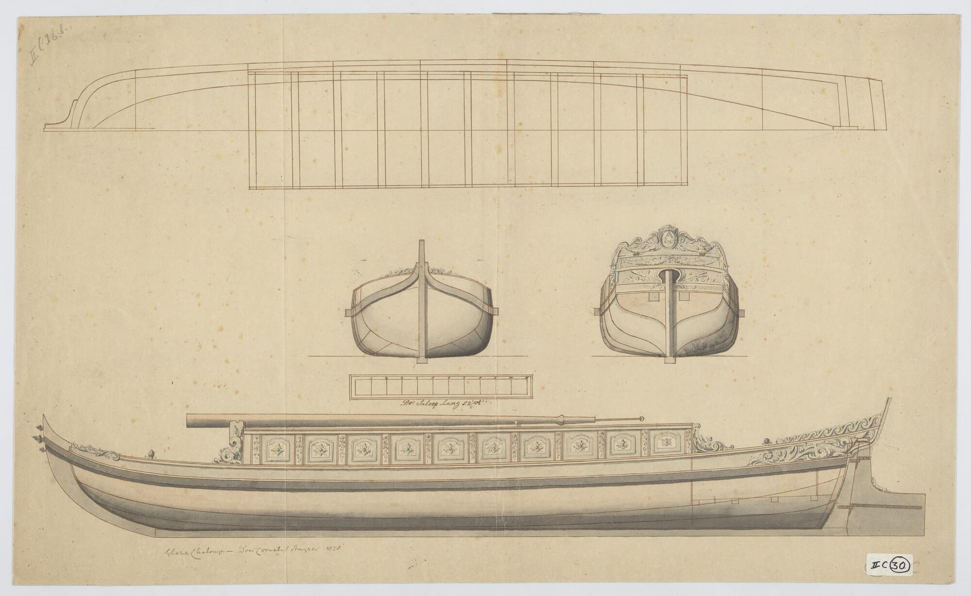 Zijaanzicht, vooraanzicht, achteraanzicht, lijnentekening, bovenaanzicht van een trekjacht of glazen sloep met gestreken jaagmast. Lengte van het schip is 52½ voet. Op de spiegel het merkteken van de VOC kamer Amsterdam: VOC A.
