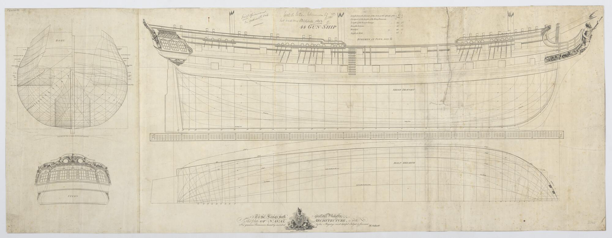 Lijnenplan van een Engels oorlogsschip van 44 stukken