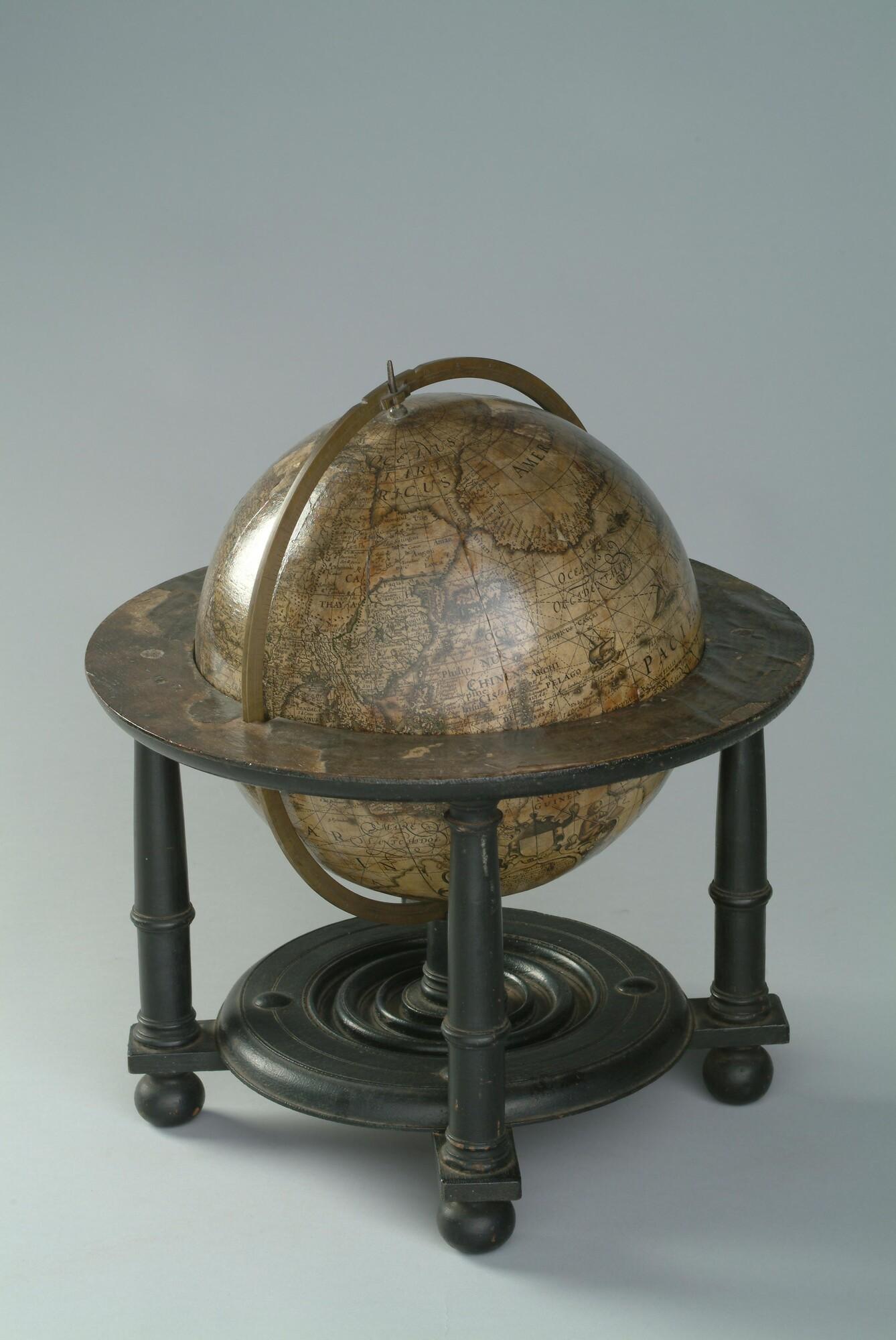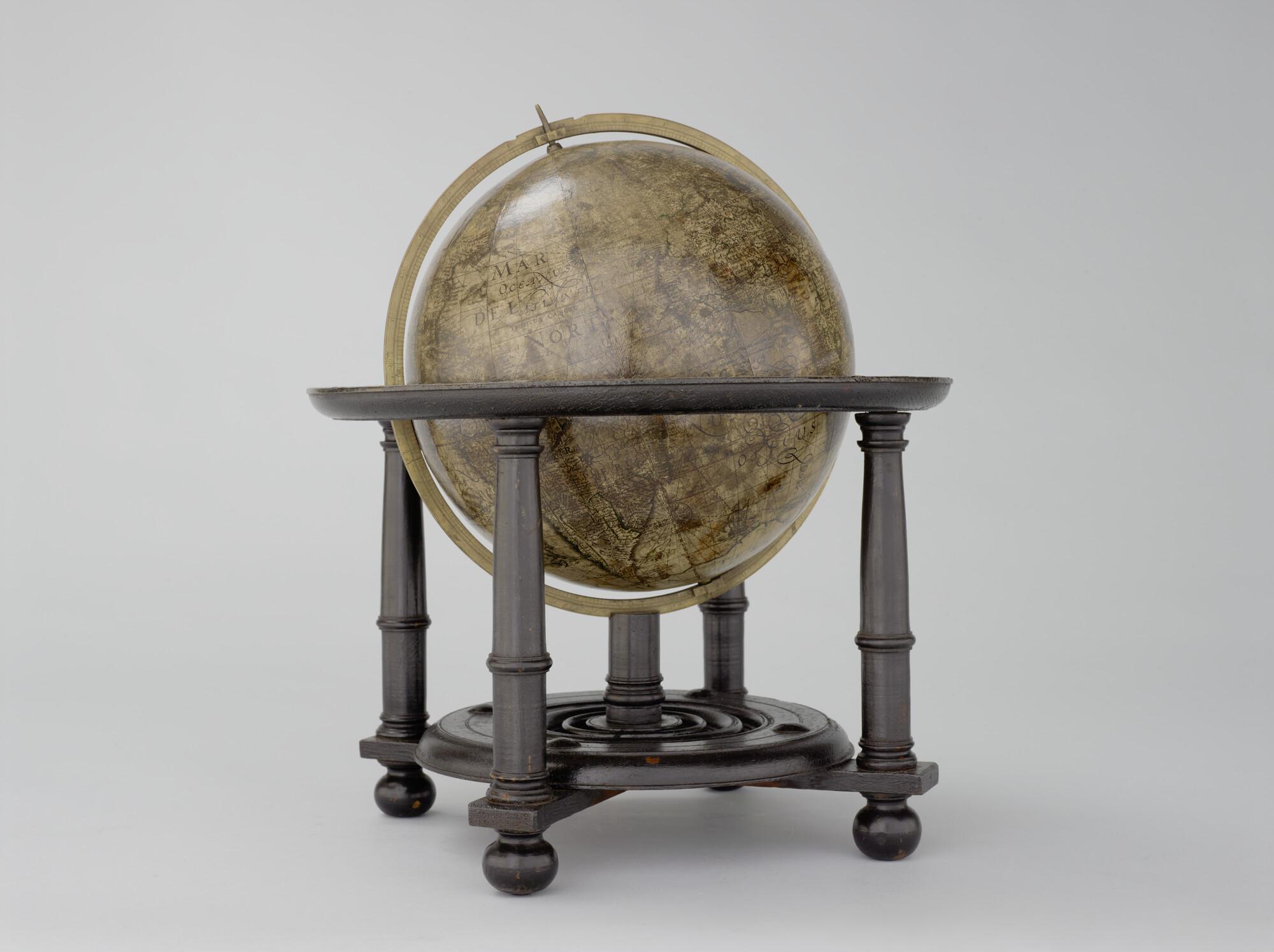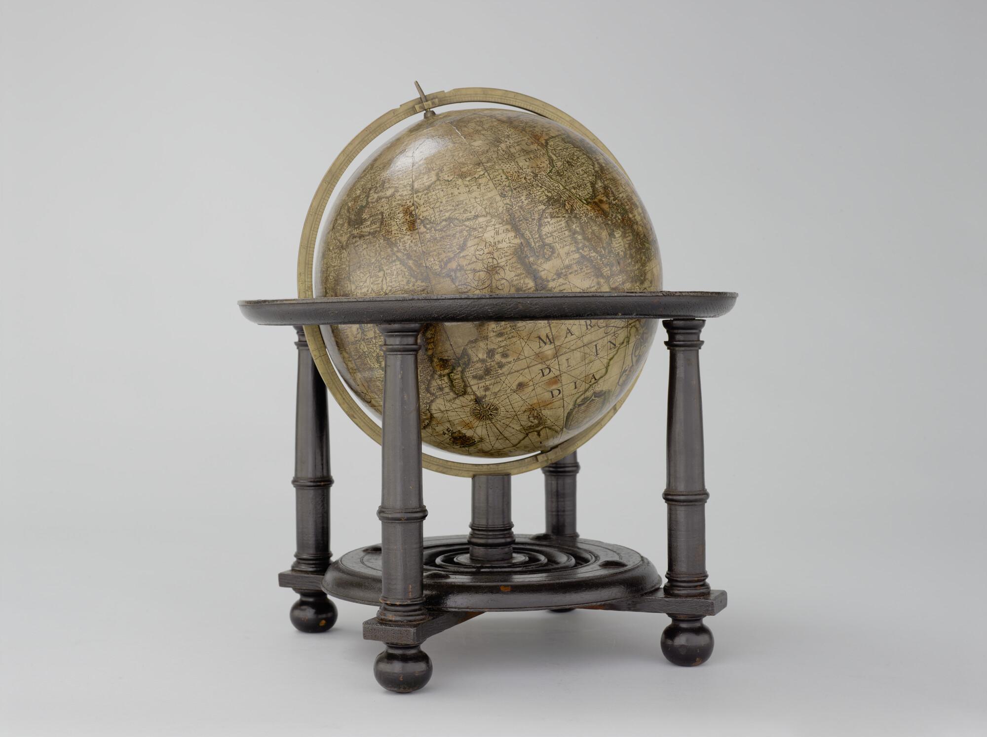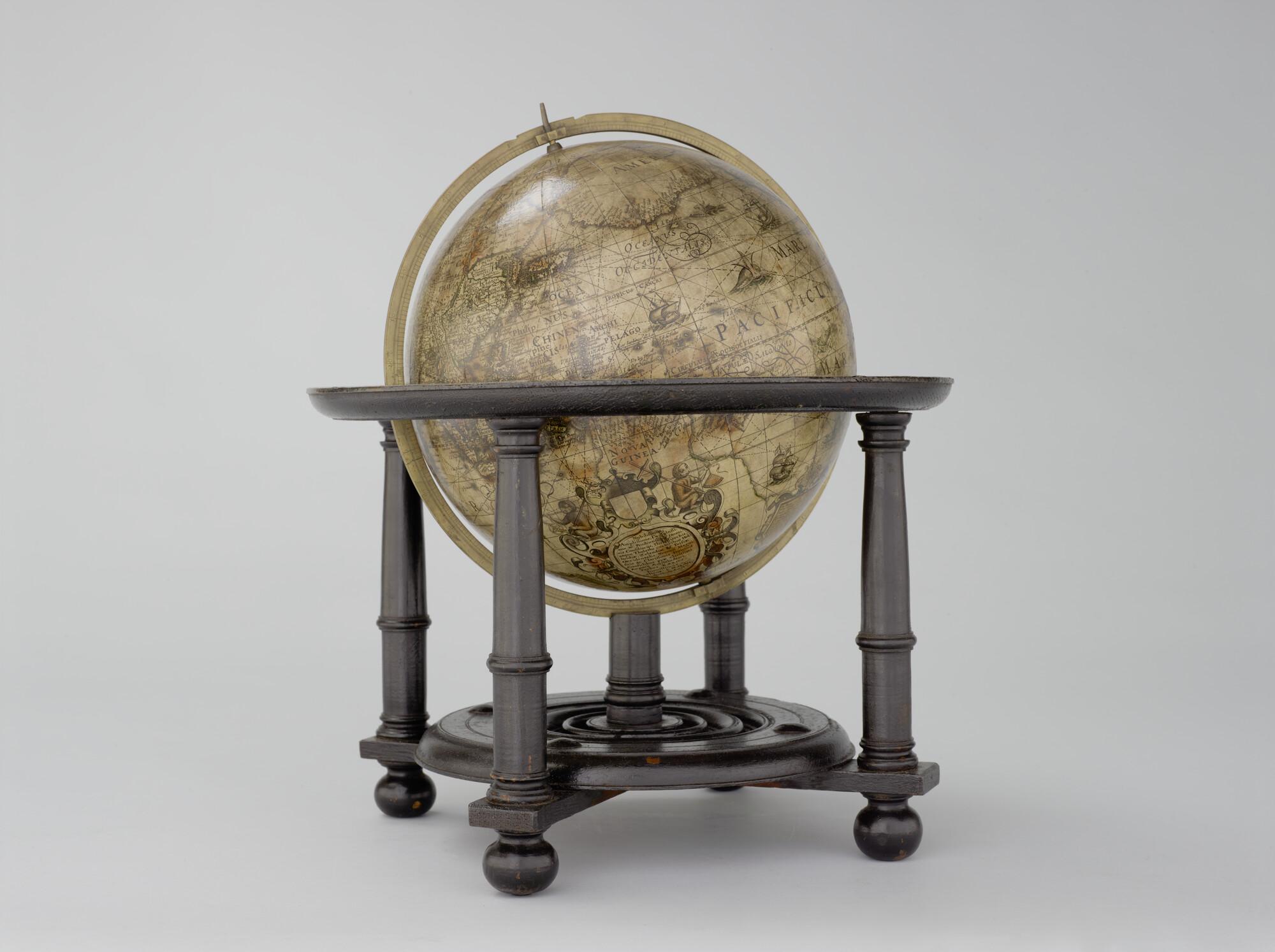 Aardglobe van 26,5 cm doorsnede door Pieter van den Keere en Petrus Plancius in de uitgave van Johannes Jansonius, 1645. Met opdracht aan de admiraliteiten van Holland, Zeeland en Westfriesland en de burgemeesters van Amsterdam (schaal 1:48.000.000).