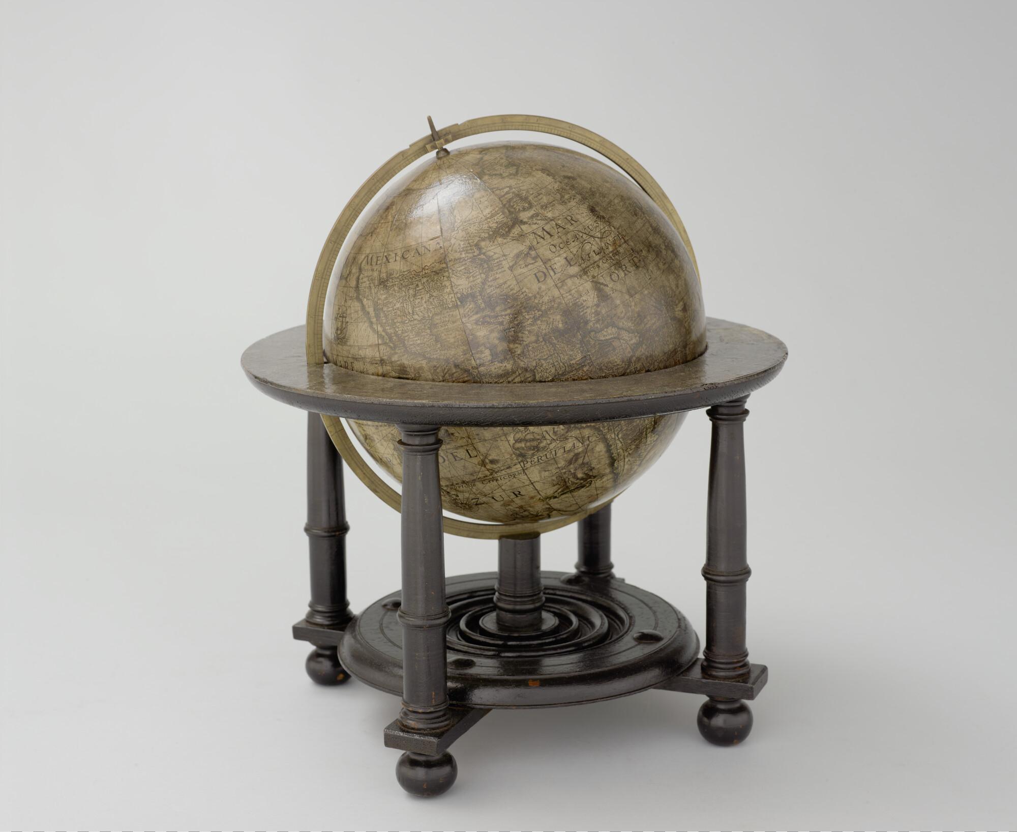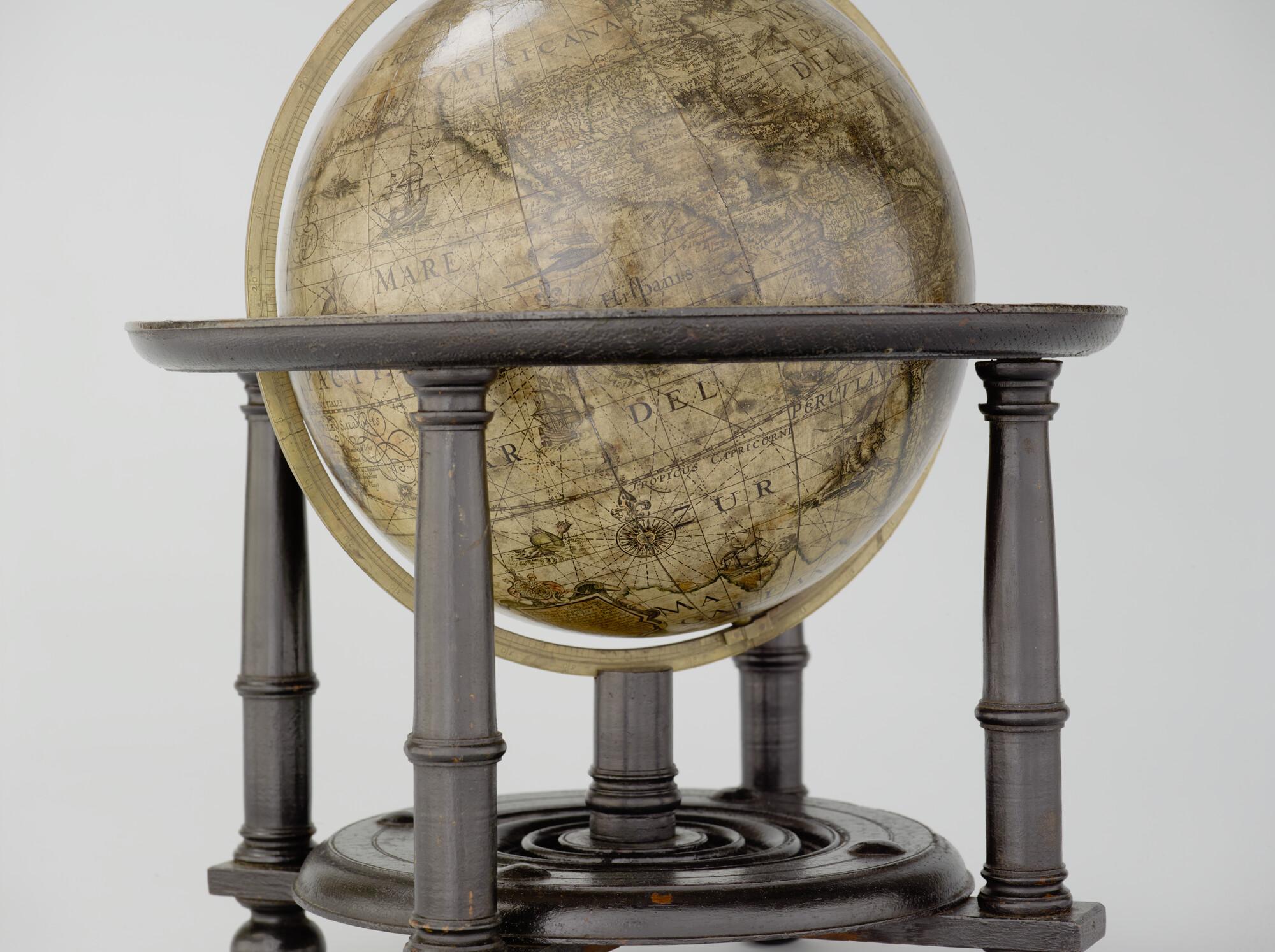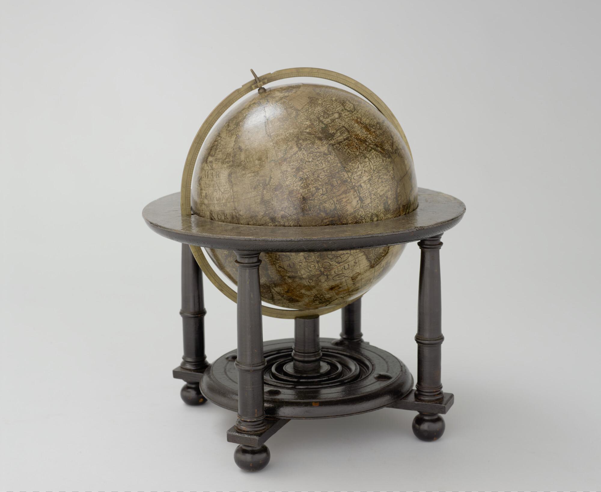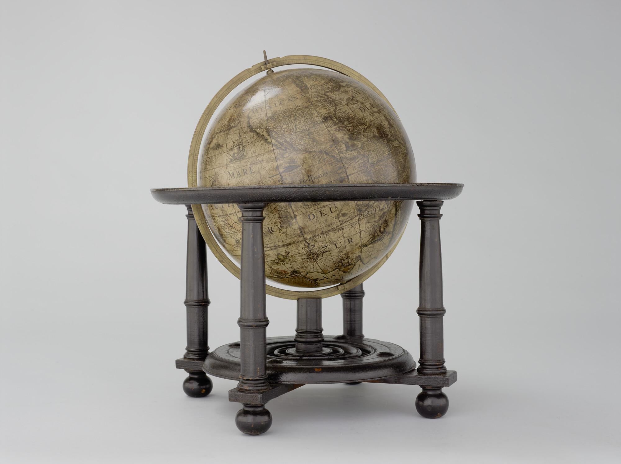 Aardglobe van 26,5 cm doorsnede door Pieter van den Keere en Petrus Plancius in de uitgave van Johannes Jansonius, 1645. Met opdracht aan de admiraliteiten van Holland, Zeeland en Westfriesland en de burgemeesters van Amsterdam (schaal 1:48.000.000).