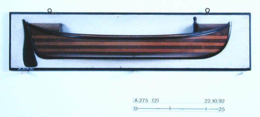 Halfmodel van een strandreddingboot. Voor en achter voorzien van een vloeiplank. Achter de voorste een sleepbolder.