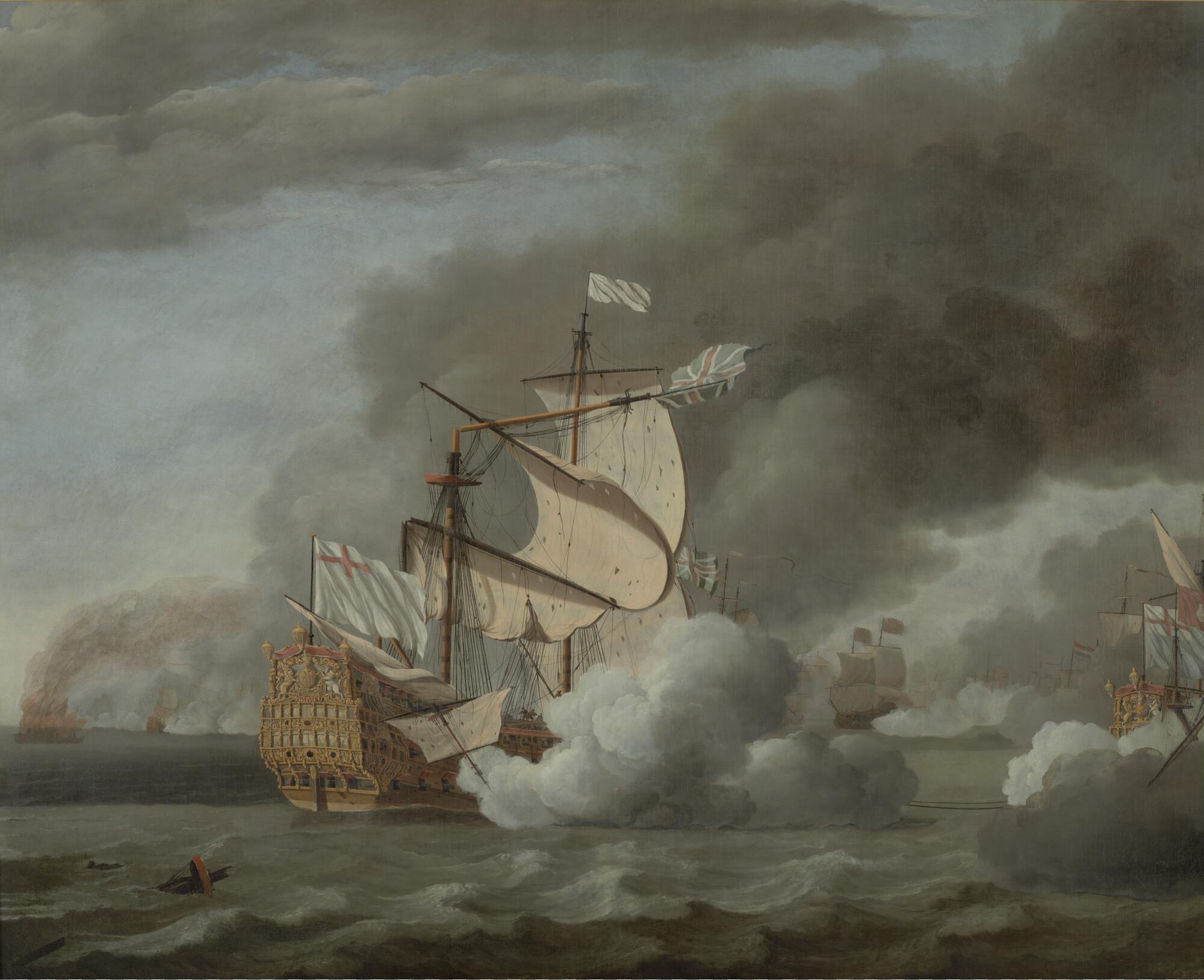 Het wegslepen van het Engelse vlaggeschip Royal James uit de strijd op de vierde dag van de Vierdaagse Zeeslag, 14 juni 1666. Het schip is in gevecht met een Nederlands schip van het Zeeuwse eskader, herkenbaar aan de rode geus met zilveren kan. In lijst.