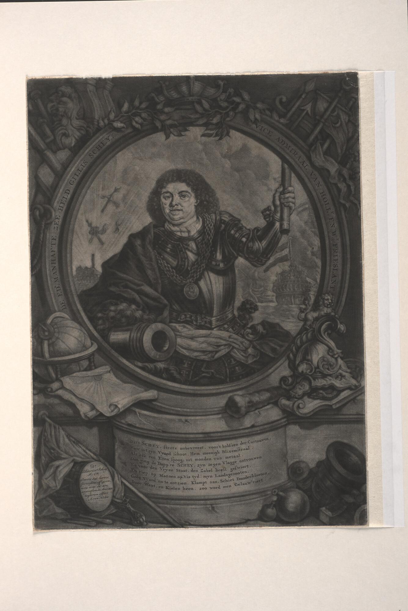 Portret van vice-admiraal Gillis Schey (1644-1703). Schey is afgebeeld in harnas met in zijn linkerhand een commandostaf en zijn rechterarm leunt op een kanonsloop. Op de achtergrond een zeeslag met een ontploffend schip en een scheepsgevecht. De cartouche is omgegeven met wapens en krijgsattributen, op de voorgrond een globe, kaarten en een achtregelig lofdicht.