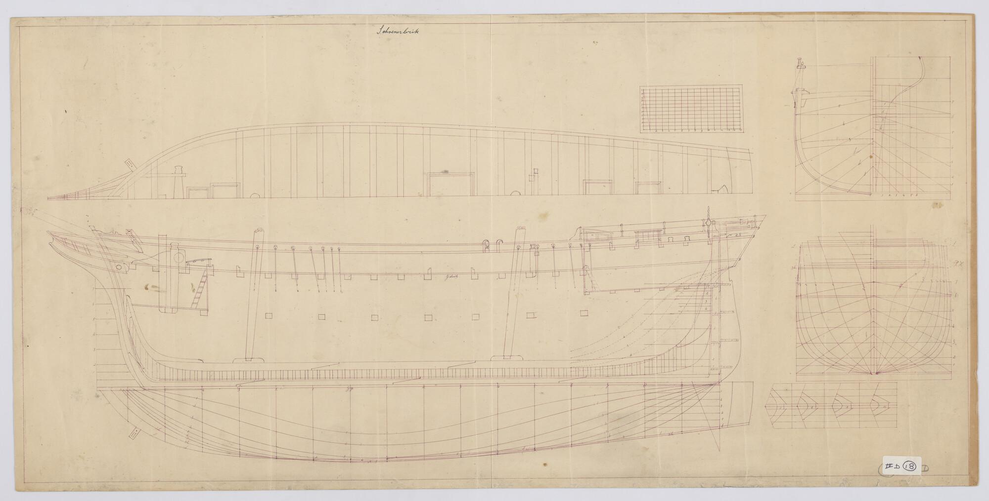 Zijaanzicht, bovenaanzicht, grootspant, lijnenplan van een schoenerbrik.