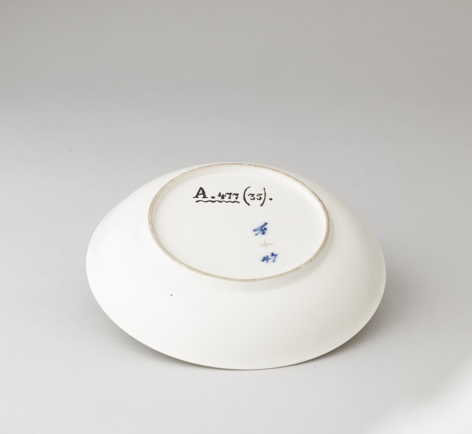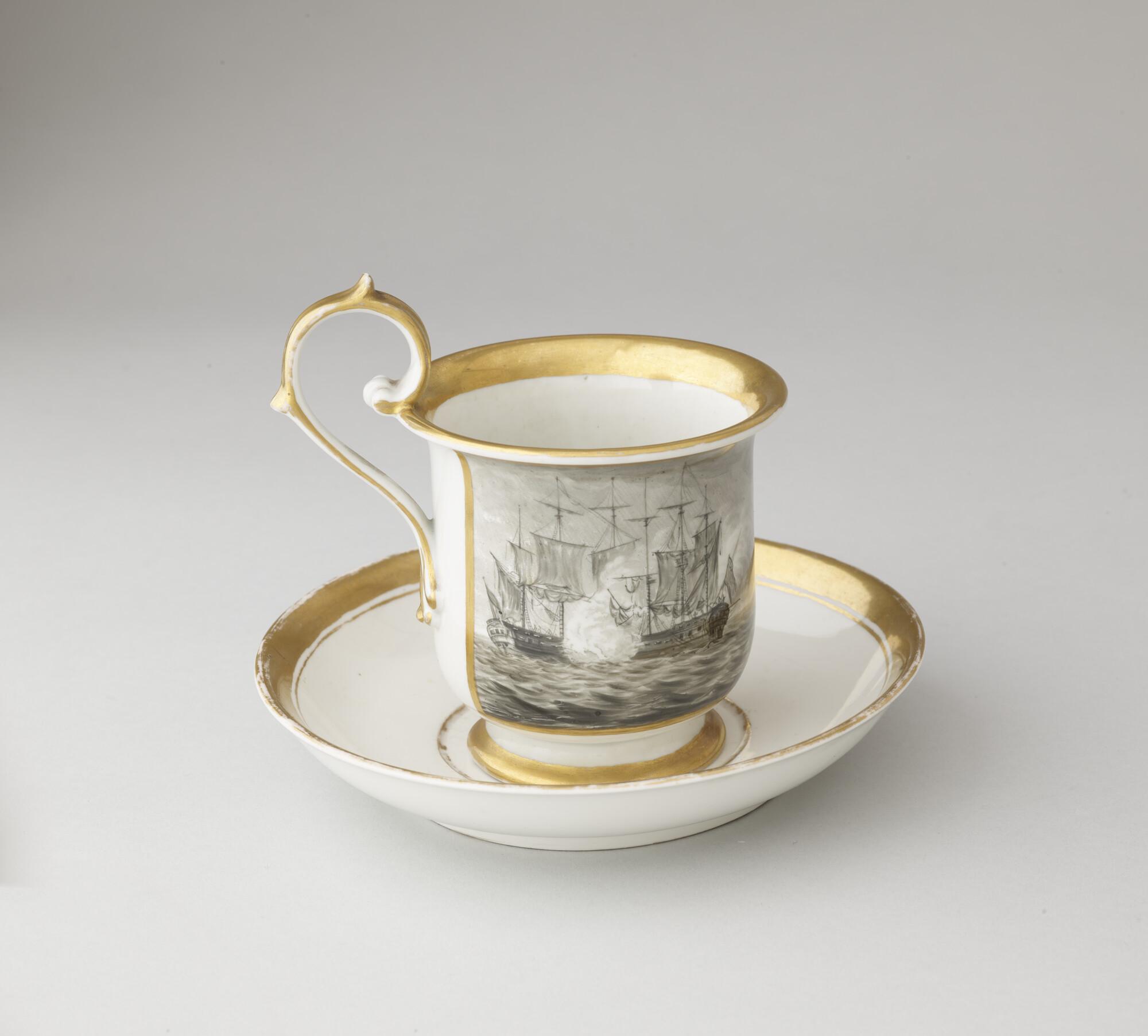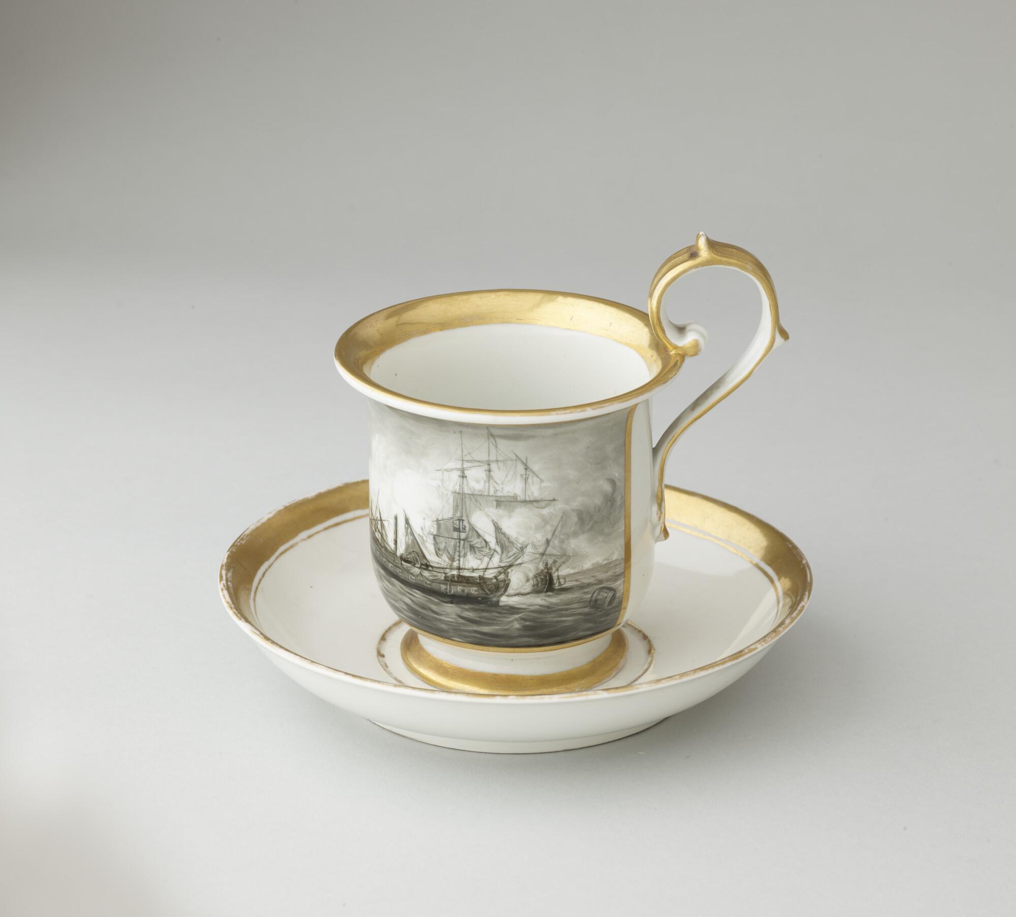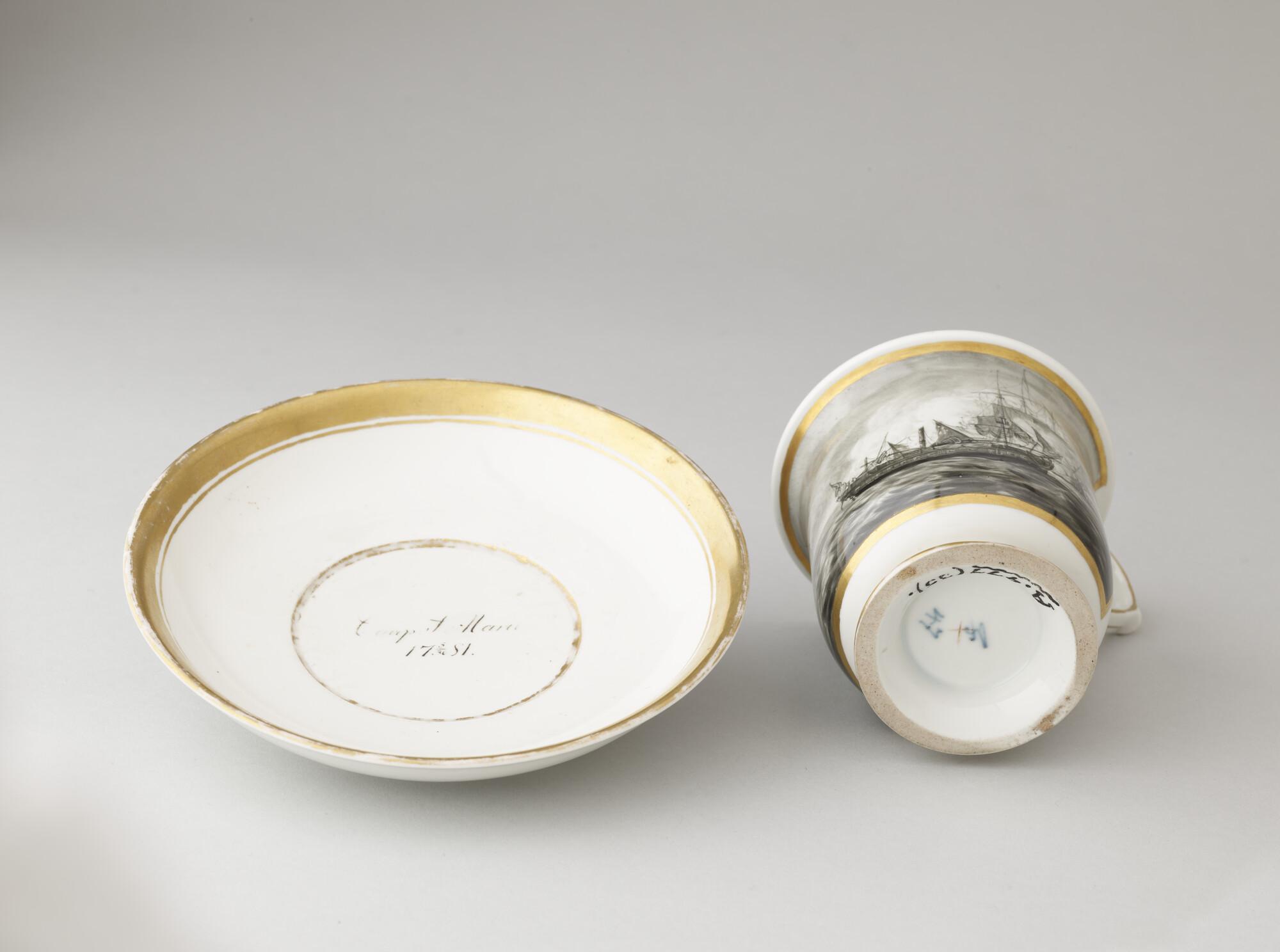 Kop en schotel, porselein met voorstelling op kop van een zeegevecht (Vierde Engelse Oorlog) in zwart. Kop is afgezet met goud. Op schotelfond Caap? S Mar?? 17 5/30 81.