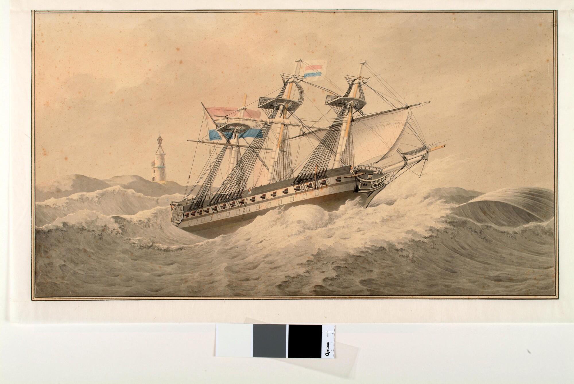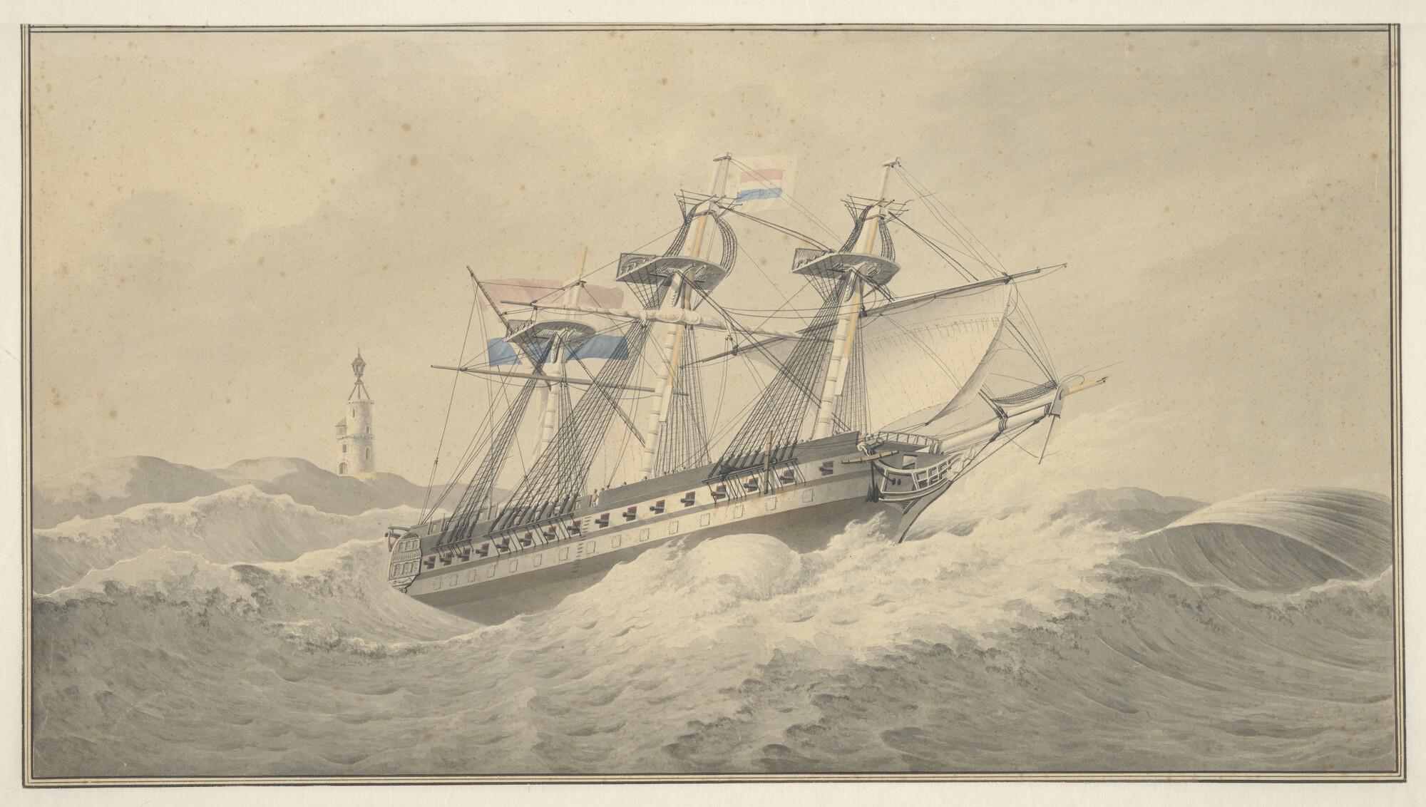Een Nederlands linischip met averij onder noodtuig in zwaar weer ter hoogte van een vuurtoren; de loodsvlag voerend in de grote mast.