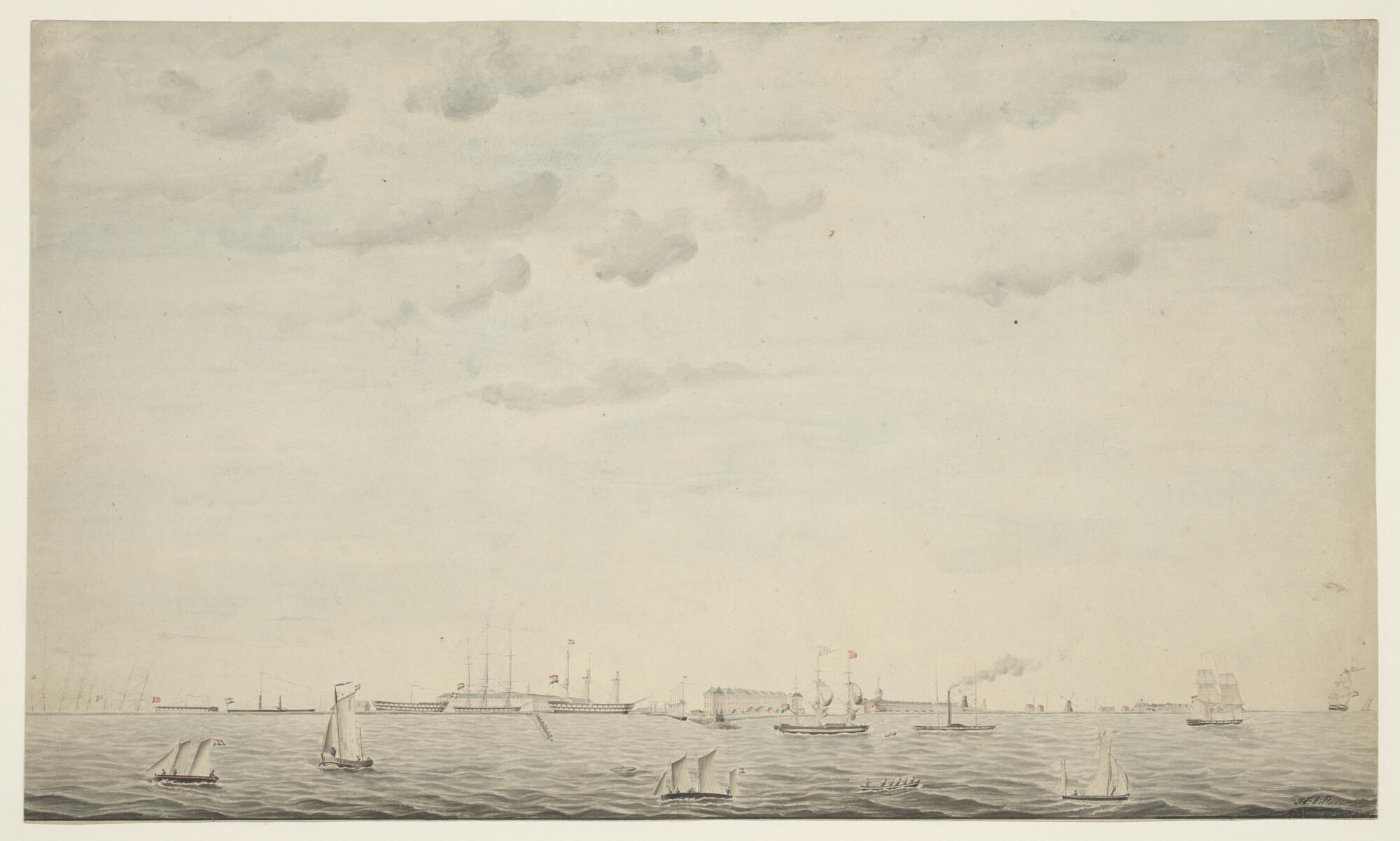 De haven en rede van het Nieuwe Diep met verschillende oorlogsschepen
