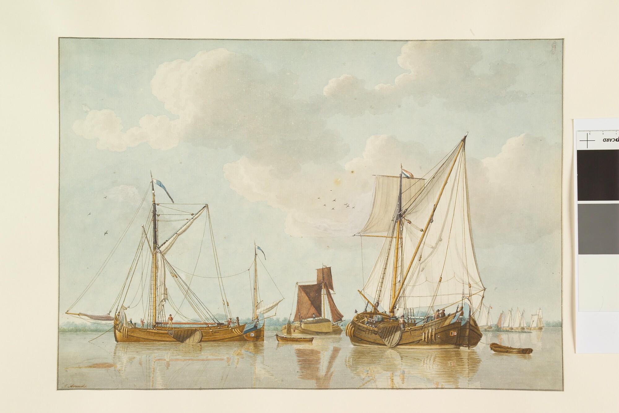 Een rede met een voor anker liggende Vlaamse pleit, een hooischip en een hektjalk.