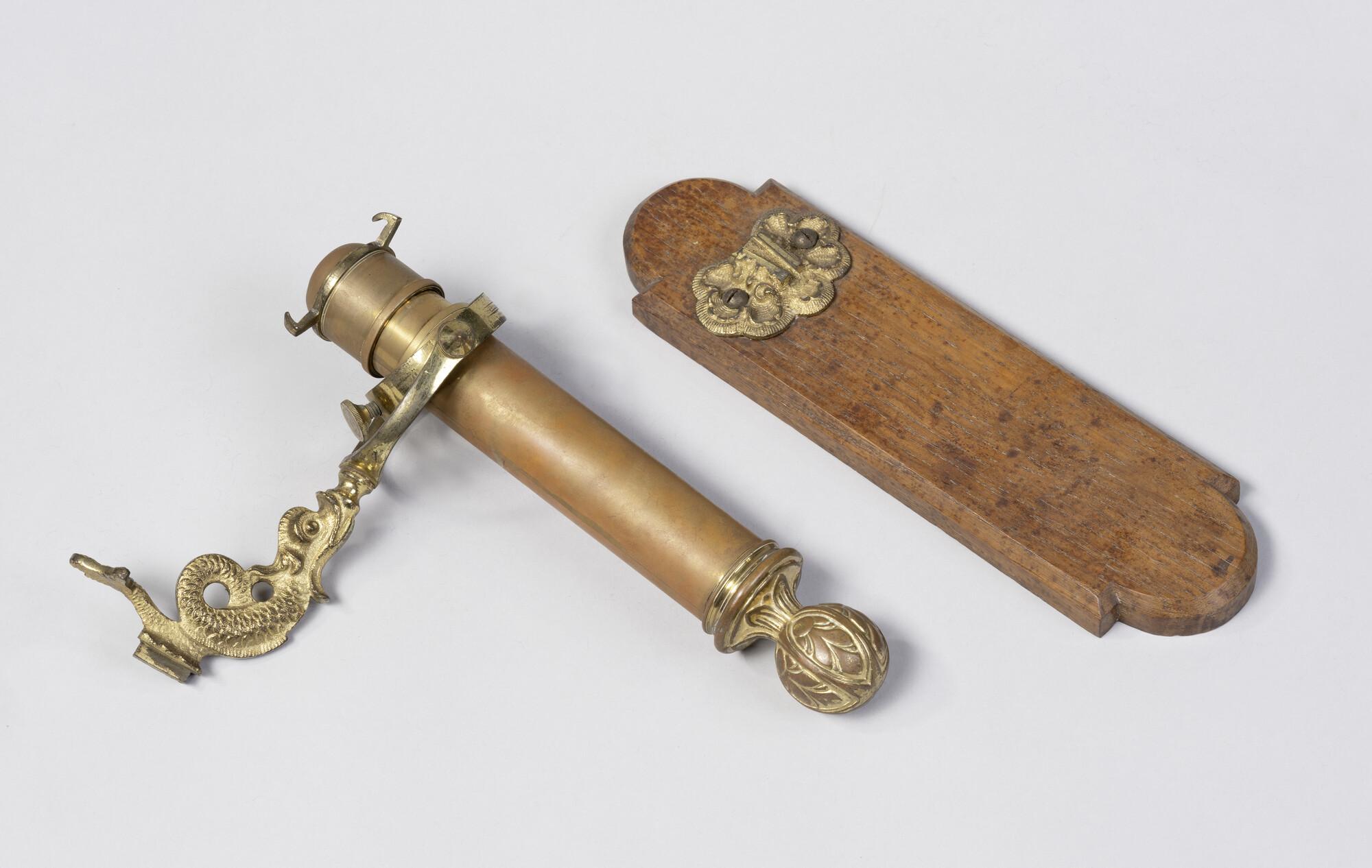 Kandelaar in cardanusringen met (los) houten achterwand. In de houders bevindt zich een veer die de kaars bij het branden langzaam omhoog drukt. De bevestiging achterwand kandelaar is uitgevoerd met visachtige motieven.