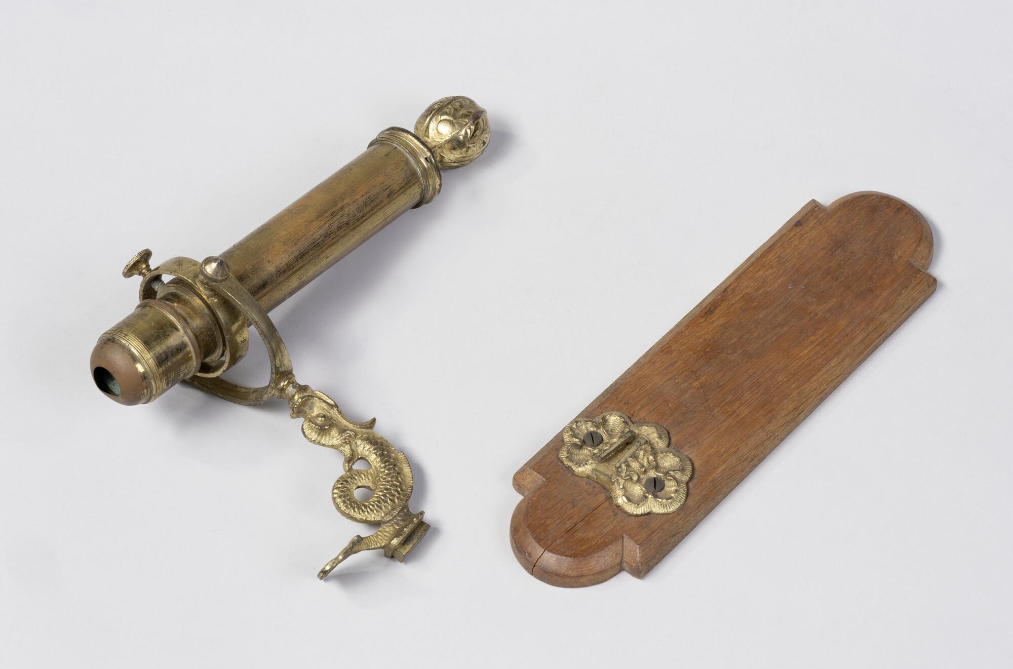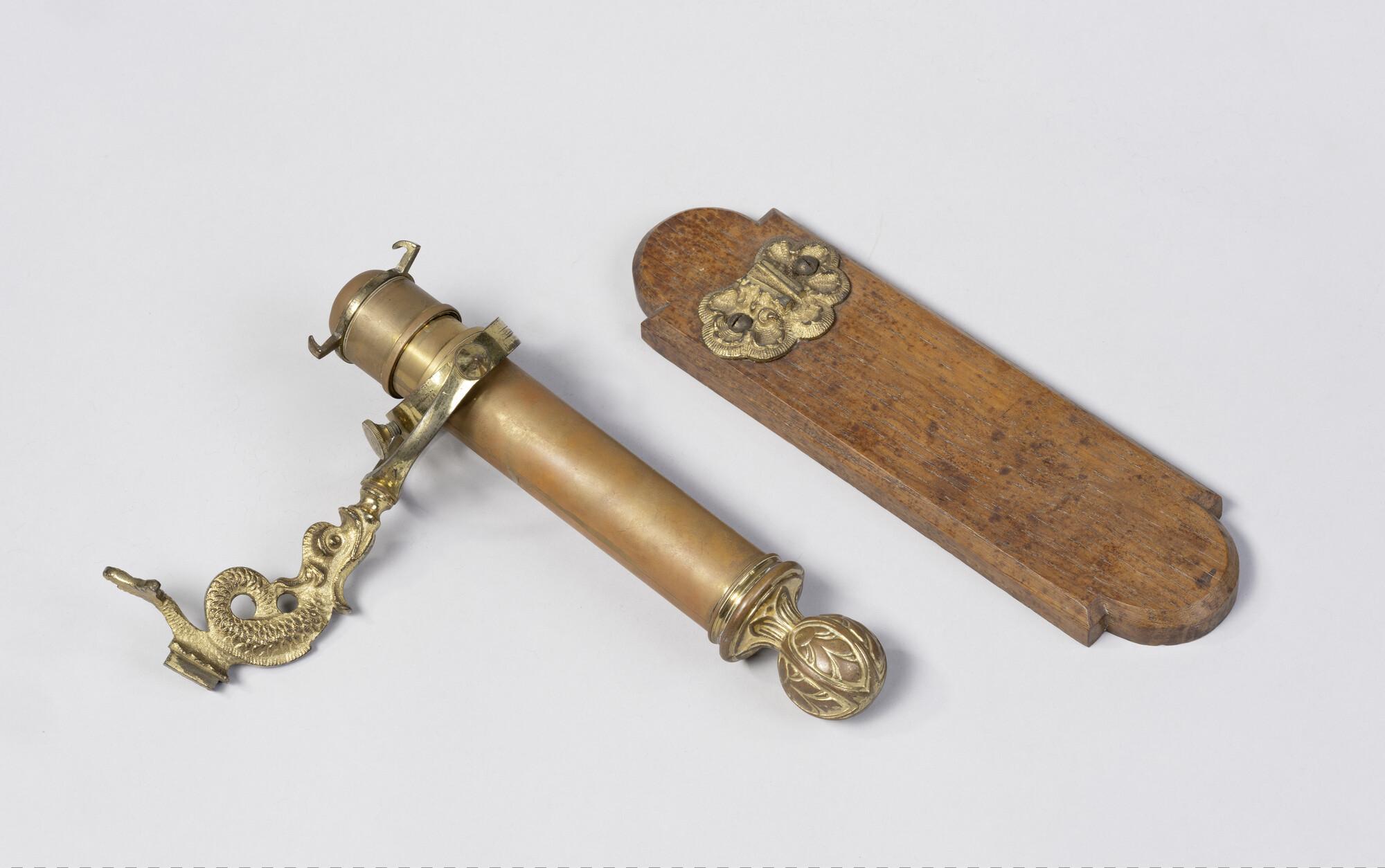 Kandelaar in cardanusringen met (los) houten achterwand. In de houders bevindt zich een veer die de kaars bij het branden langzaam omhoog drukt. De bevestiging achterwand kandelaar is uitgevoerd met visachtige motieven.