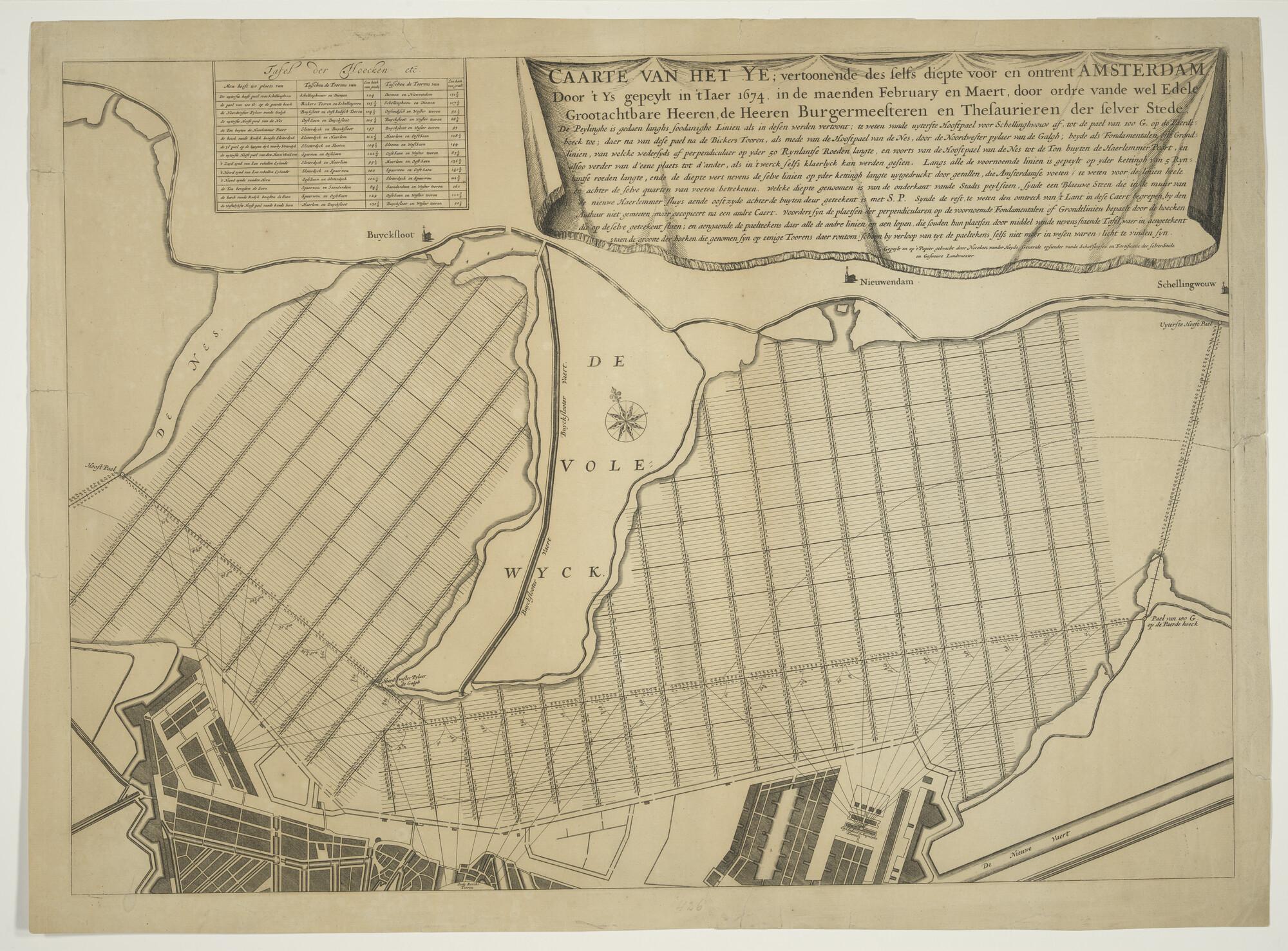 Kaart van het IJ en Amsterdam in opdracht van de stad opgenomen en getekend door Nicolaas van der Heyde, Amsterdam, 1674. Deze kaart geeft de waterdiepten van het IJ weer in 1674. De dieptemetingen werden uitgevoerd in de februari en maart van dat jaar op het bevroren IJ. De landmeter Nicolaas van der Heyden (1640-1682), ...