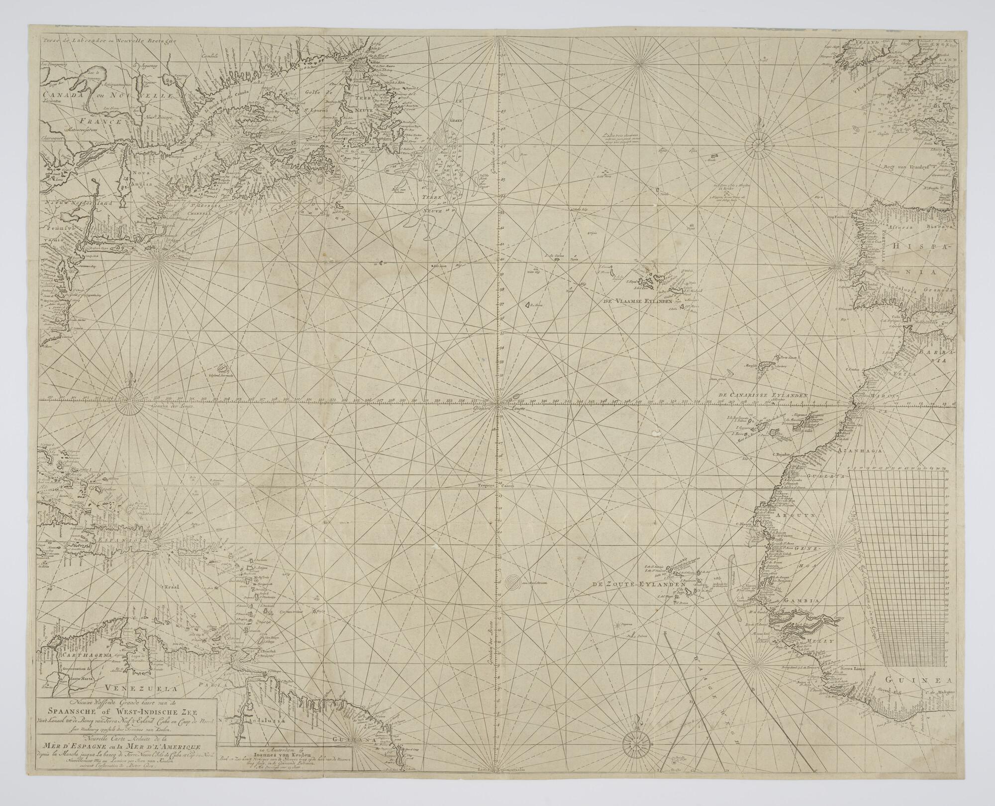 Kaart van de Noord Atlantische Oceaan van de equator tot Het Kanaal, van Pieter Goos (ca 1616 - 1675). Heruitgave Johannes van Keulen (1654 - 1711) Amsterdam, circa 1690. Mercator projectie. Meridiaan Teneriffe. Ingetekend de wagenweg. Met Franse titel.