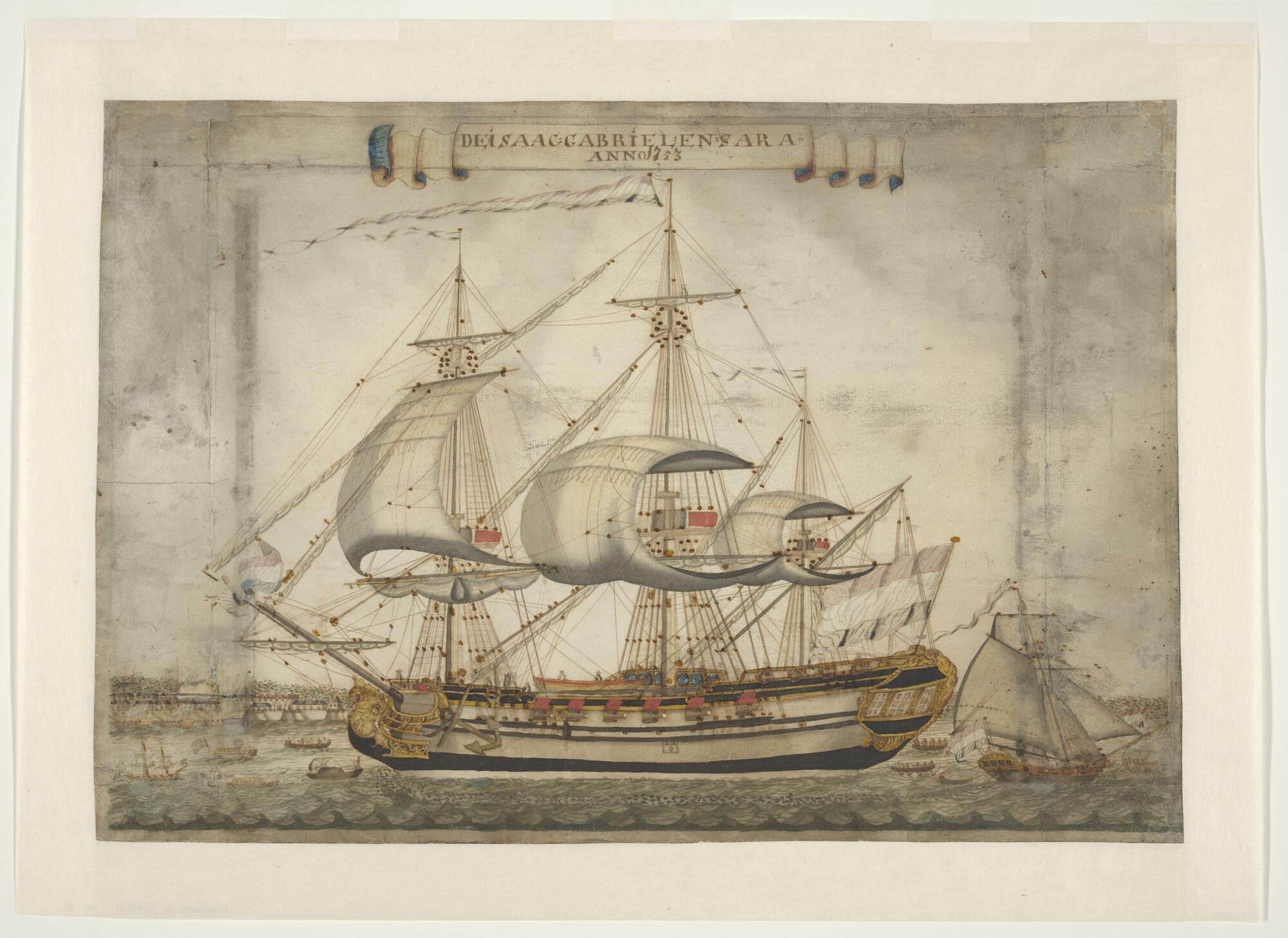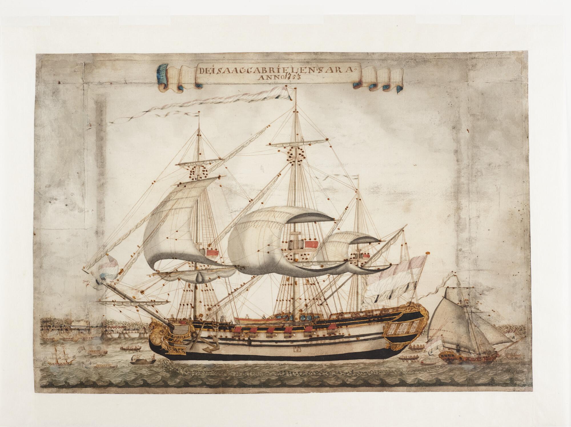 Het koopvaardijschip 'Isaac Gabriel en Sara' op de rede van Paramaribo, 1753.