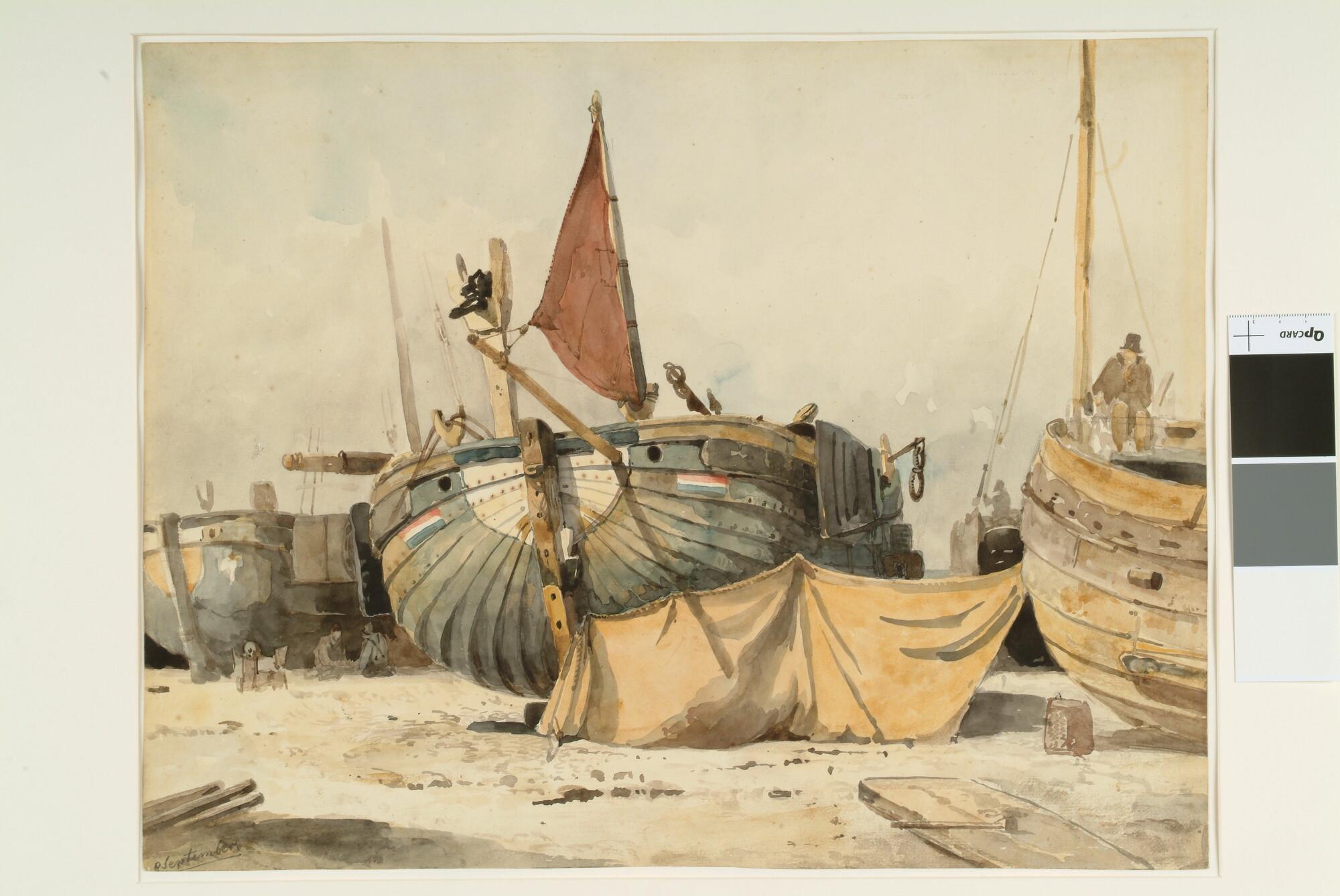 Drie bomschepen op het strand; verso: schets van een bomschuit.