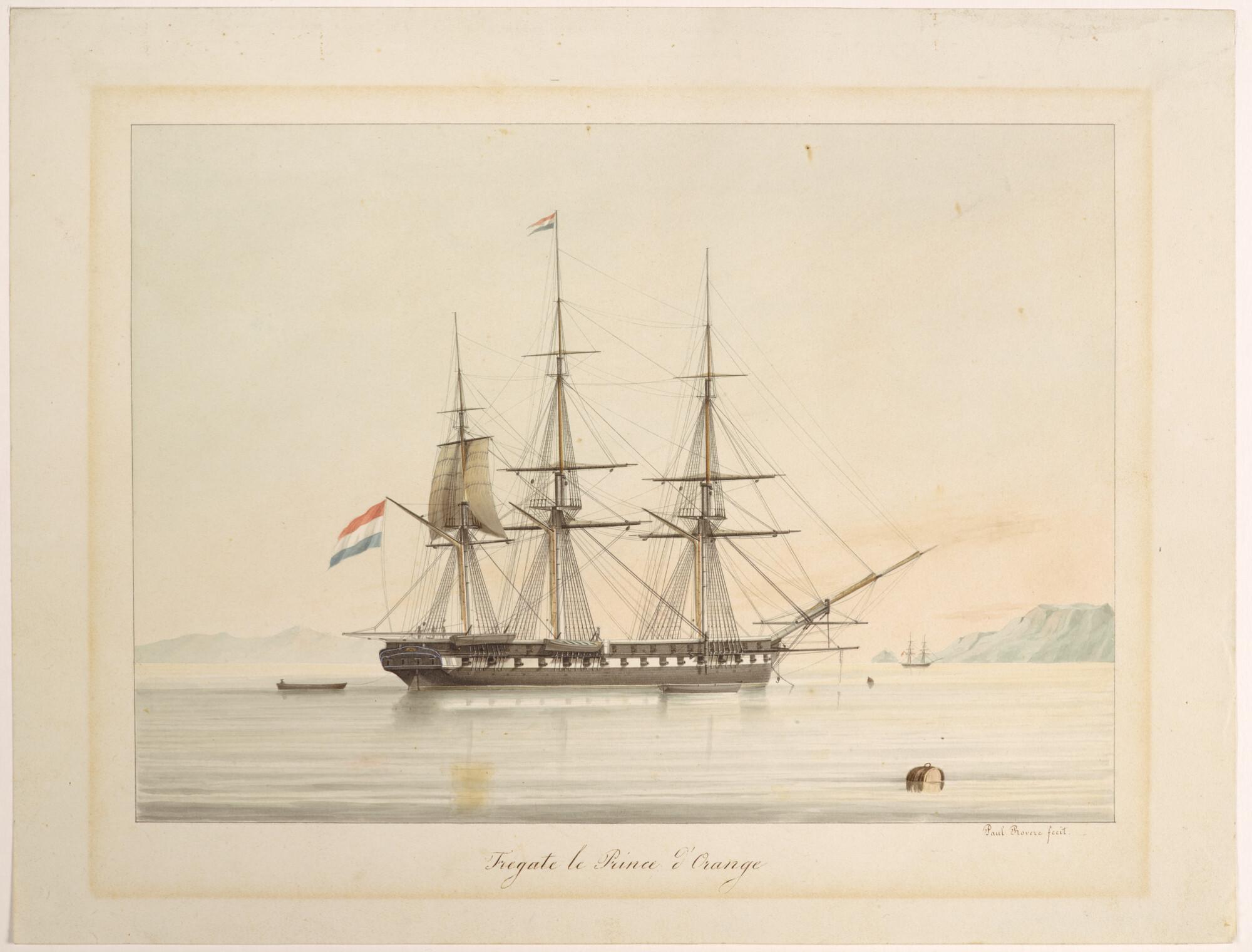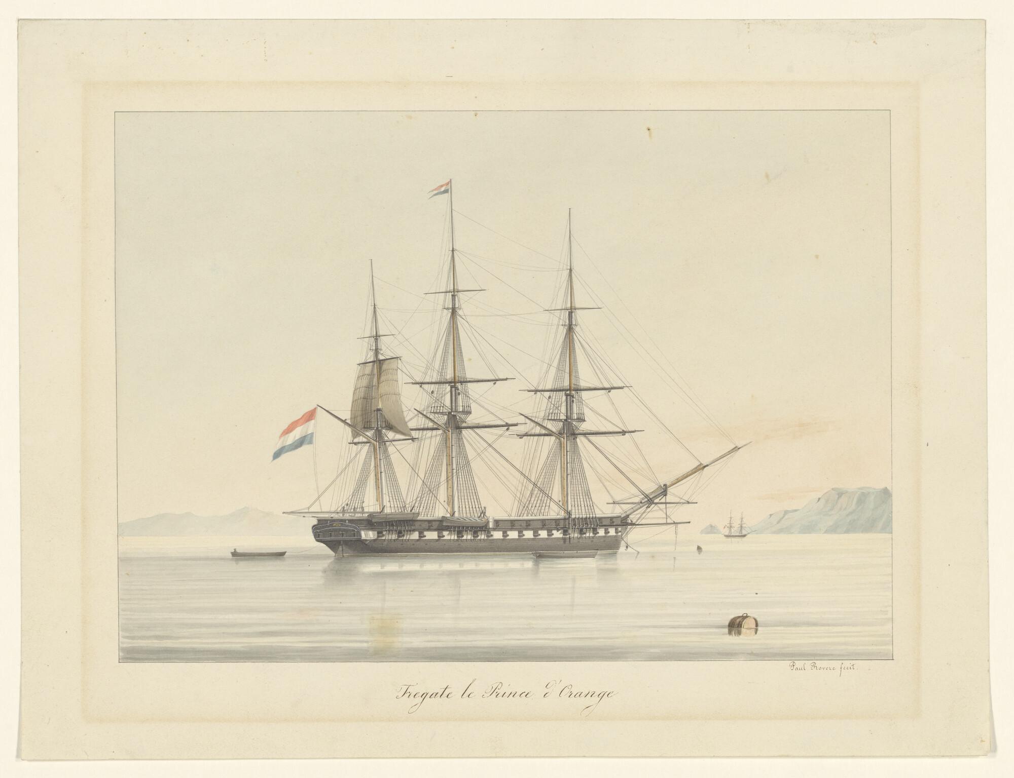 Het fregat Zr.Ms. "Prins van Oranje" voor anker, op een bergachtige rede