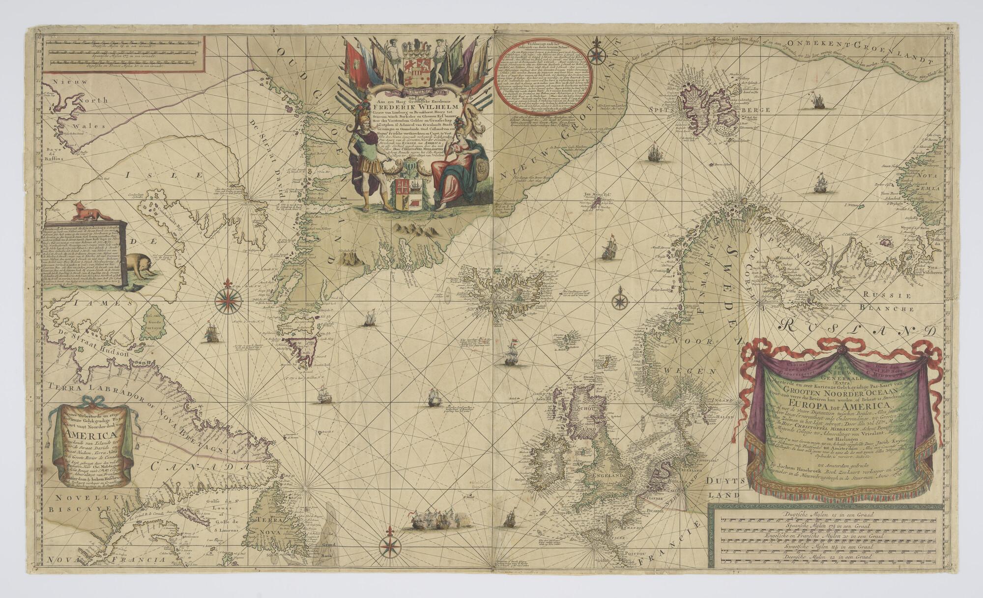 Met de hand gekleurde zeekaart van de Noord Atlantische Oceaan samengesteld door Christoffel Middagten (1659 - 1723). Gravure Jacob Keyser, uitgave Jochem Hasebroek (1682 - 1756), Amsterdam, 1716. Opgedragen aan F.W. van Limburg Stirum (schaal 1 op 7.500.000).
