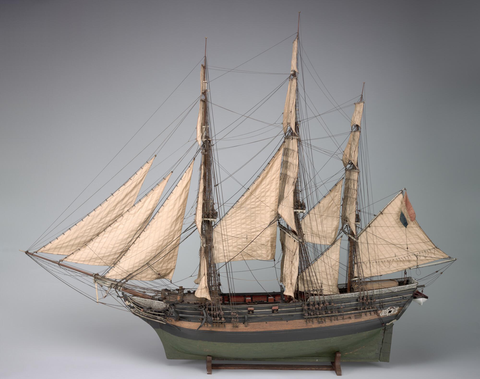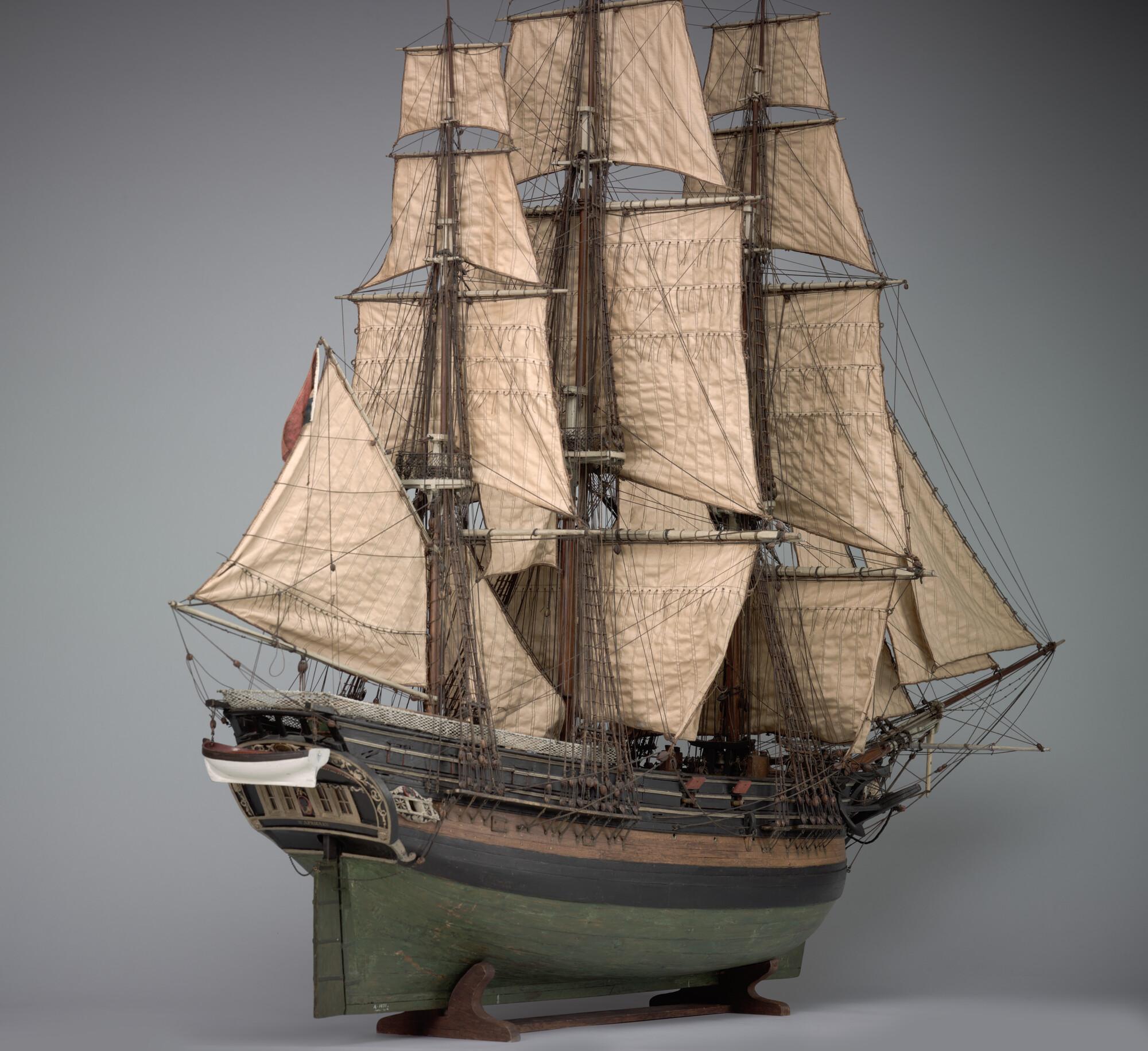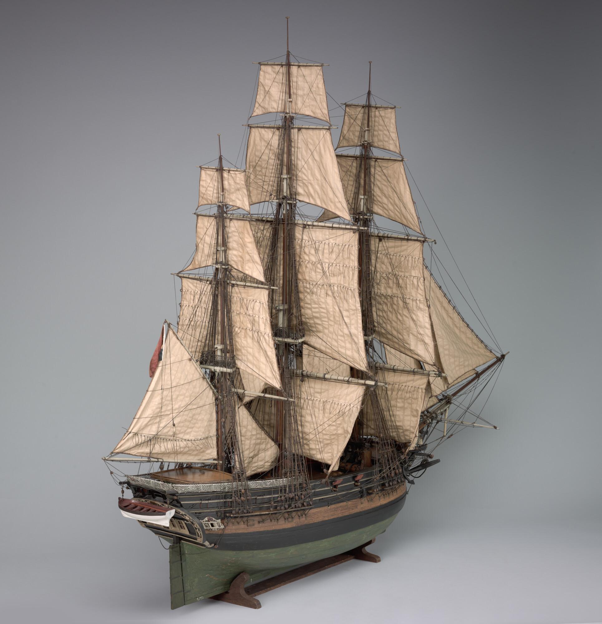 Getuigd model van een koopvaardijfregat genaamd D'Africaen. Het schegbeeld is een zwarte man met een mes in zijn hand. Op de spiegel en op de boorden portretten van een zwarte man.