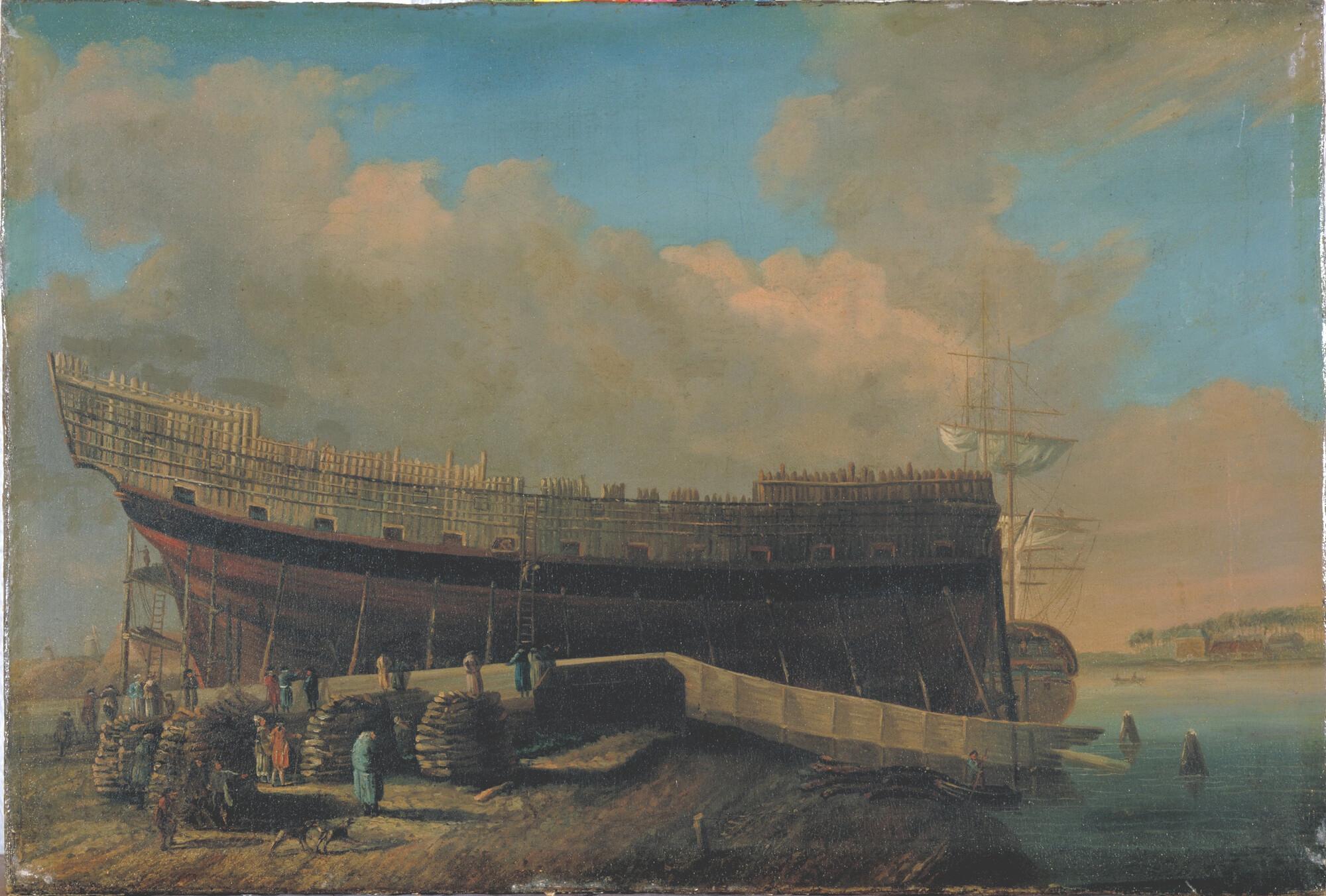 Het oorlogsschip Hercules op stapel op de werf van J. Spaan te Dordrecht in 1782.