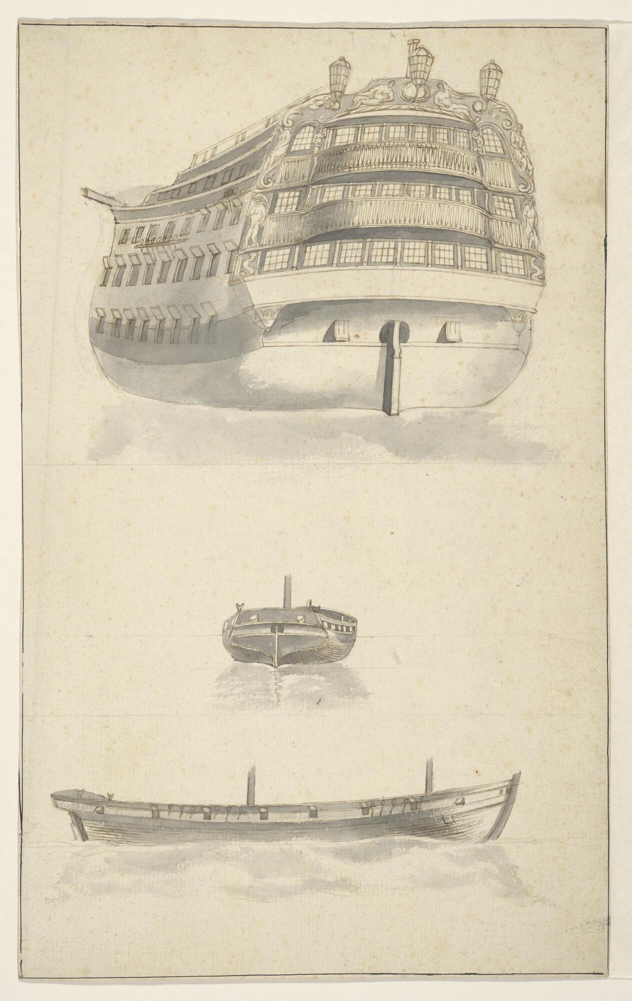 De romp van een driedekker, gezien van bakboord achter; op hetzelfde blad 2 tekeningen van een brik van 16 stukken gezien opzij en van achter.