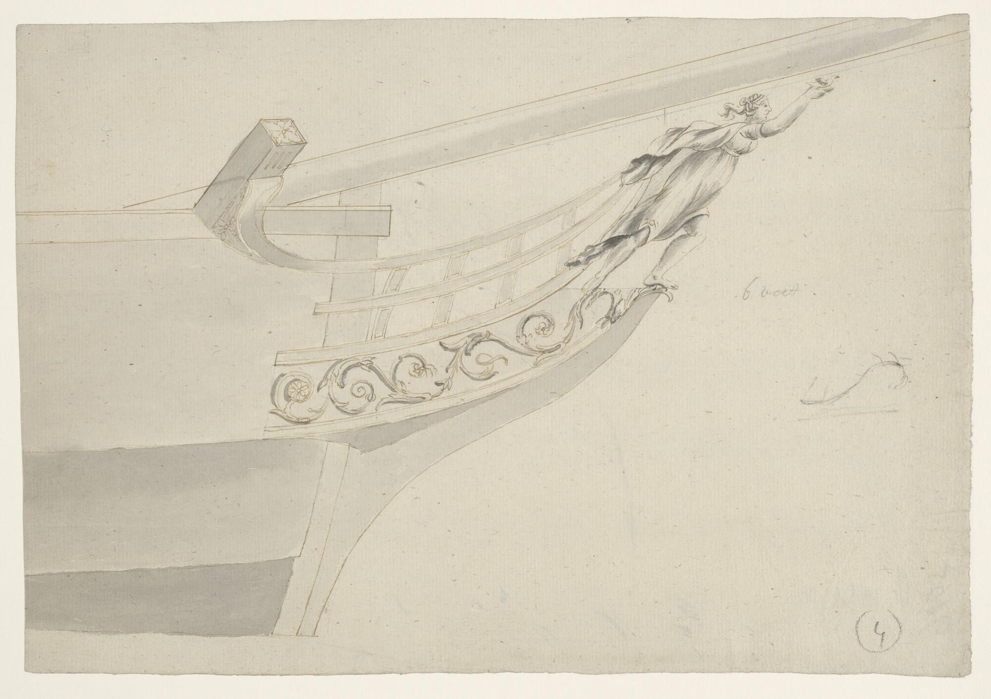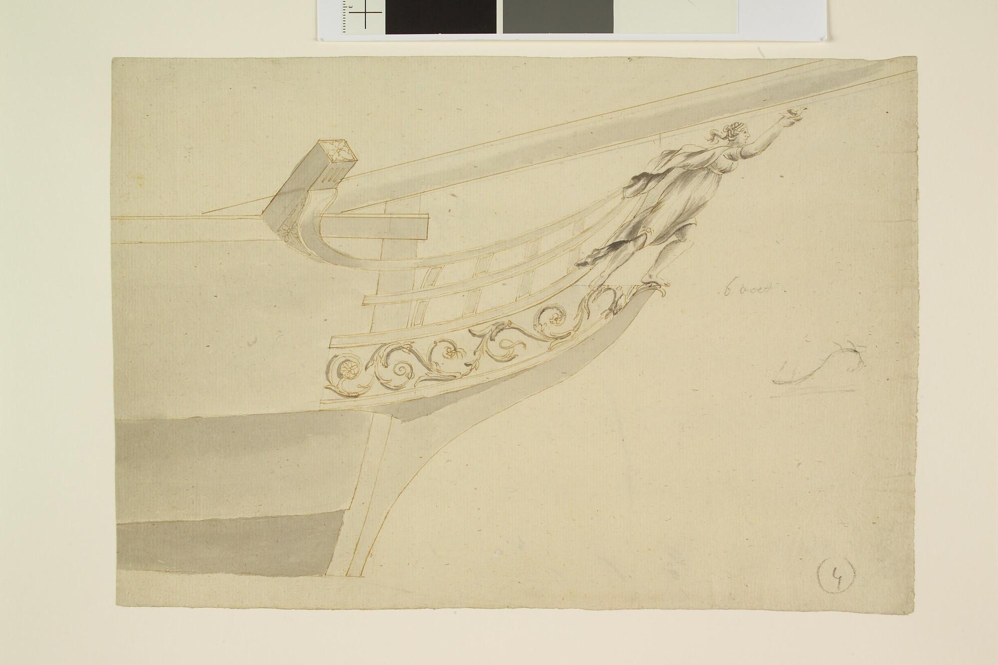 Het galjoen van een schip, stuurboordzijde met een boegbeeld van een vrouw met vogel.