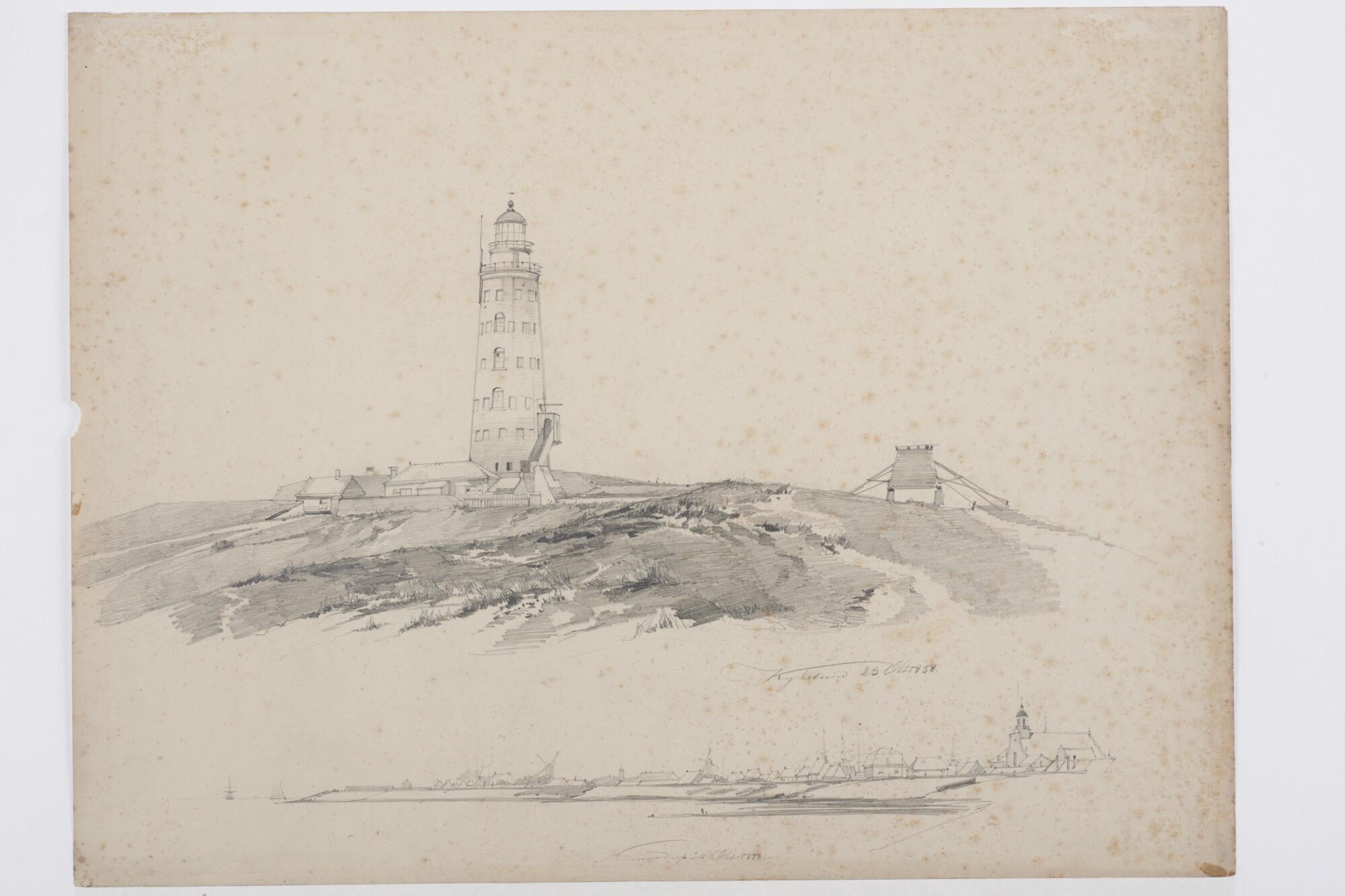 Blad met 2 tekeningen: de vuurtoren van Kijkduin bij Huisduinen en een kustaanzicht van Den Helder vanaf het Marsdiep 1858.