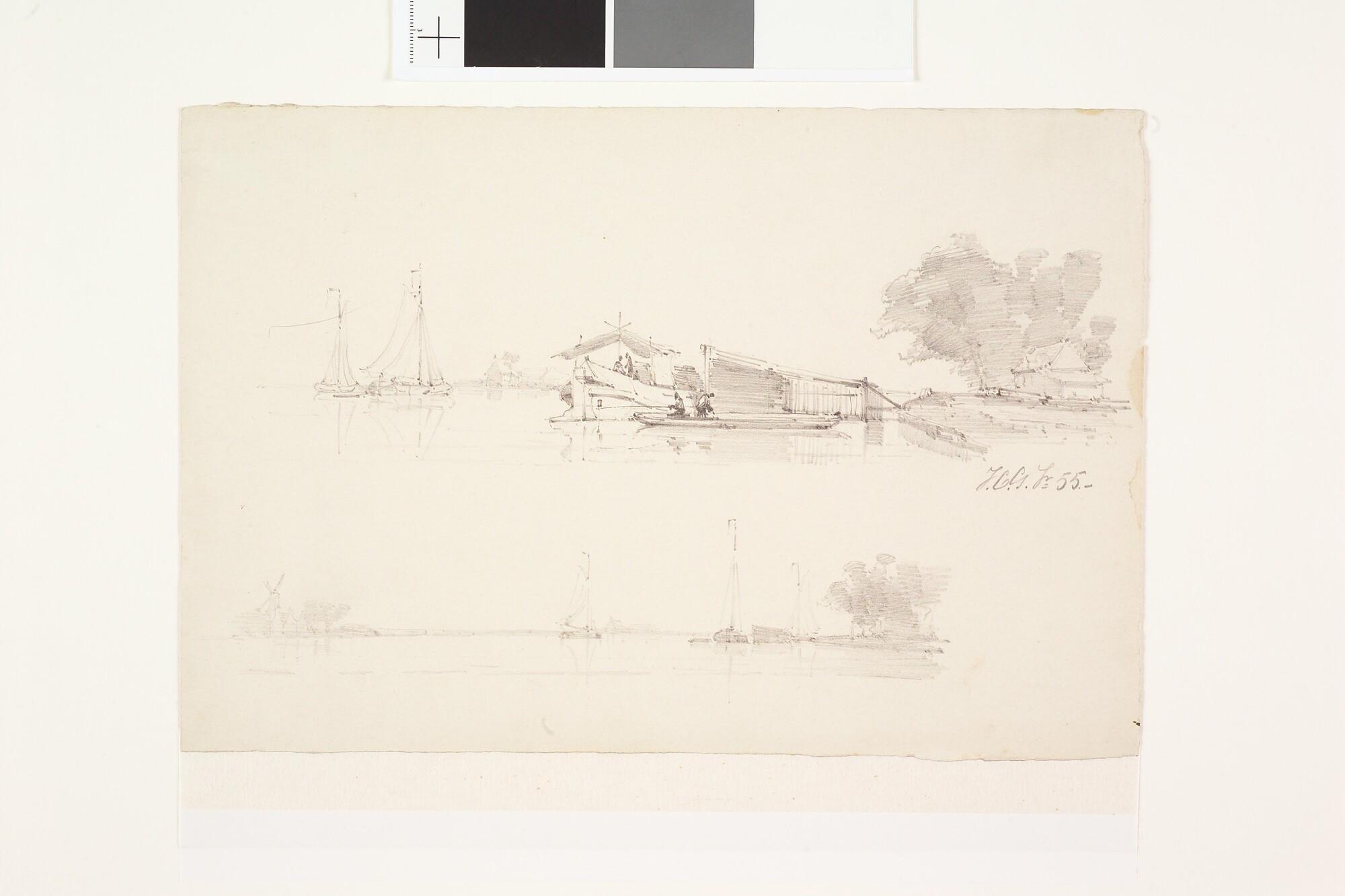 Twee riviergezichten. Boven: een tjalk bezig met laden of lossen (?) bij een botenhuis. Onder: rivierlandschap met links een molen.