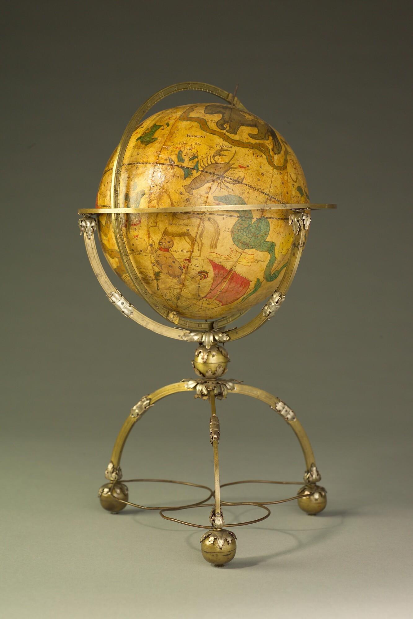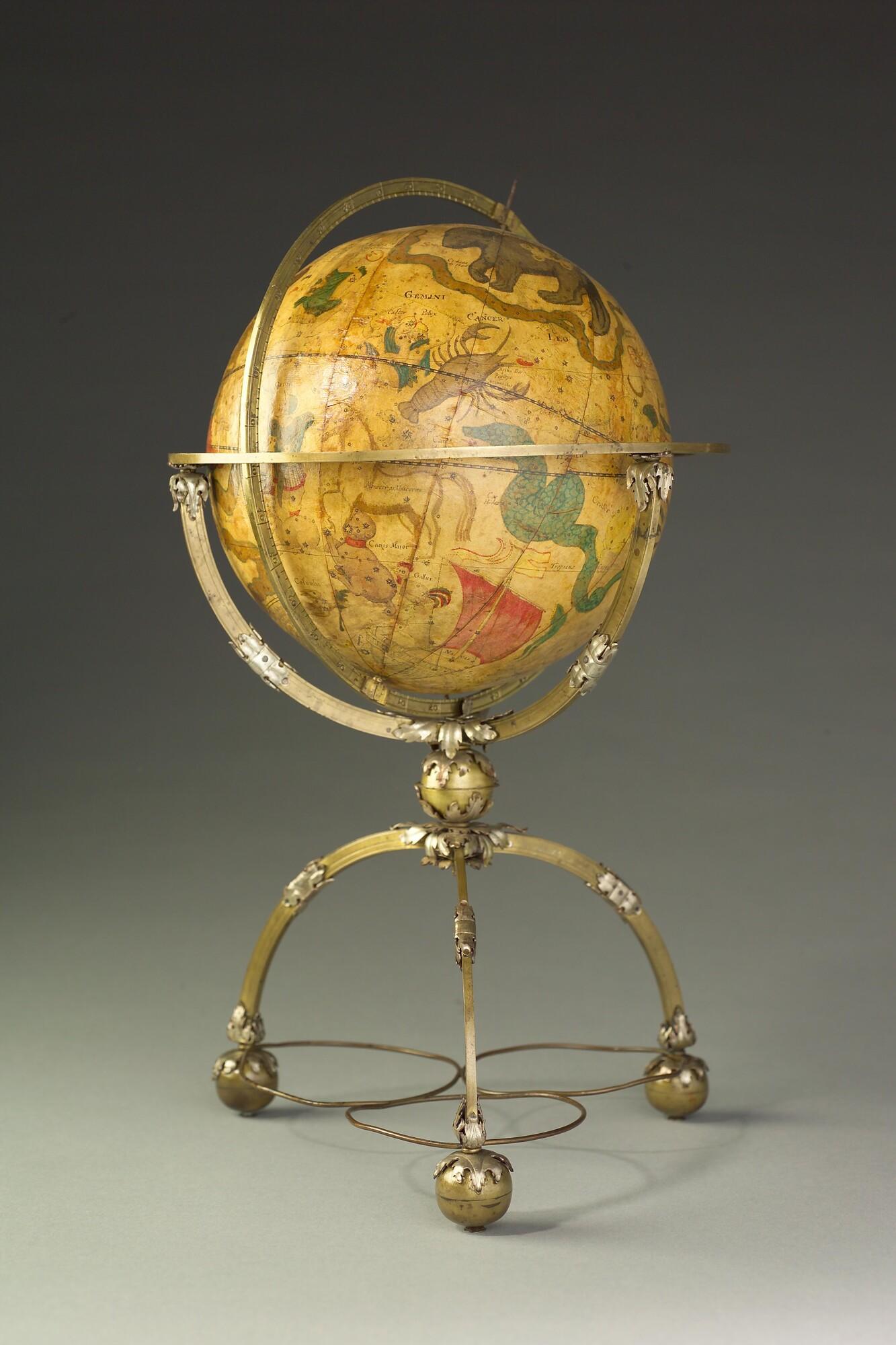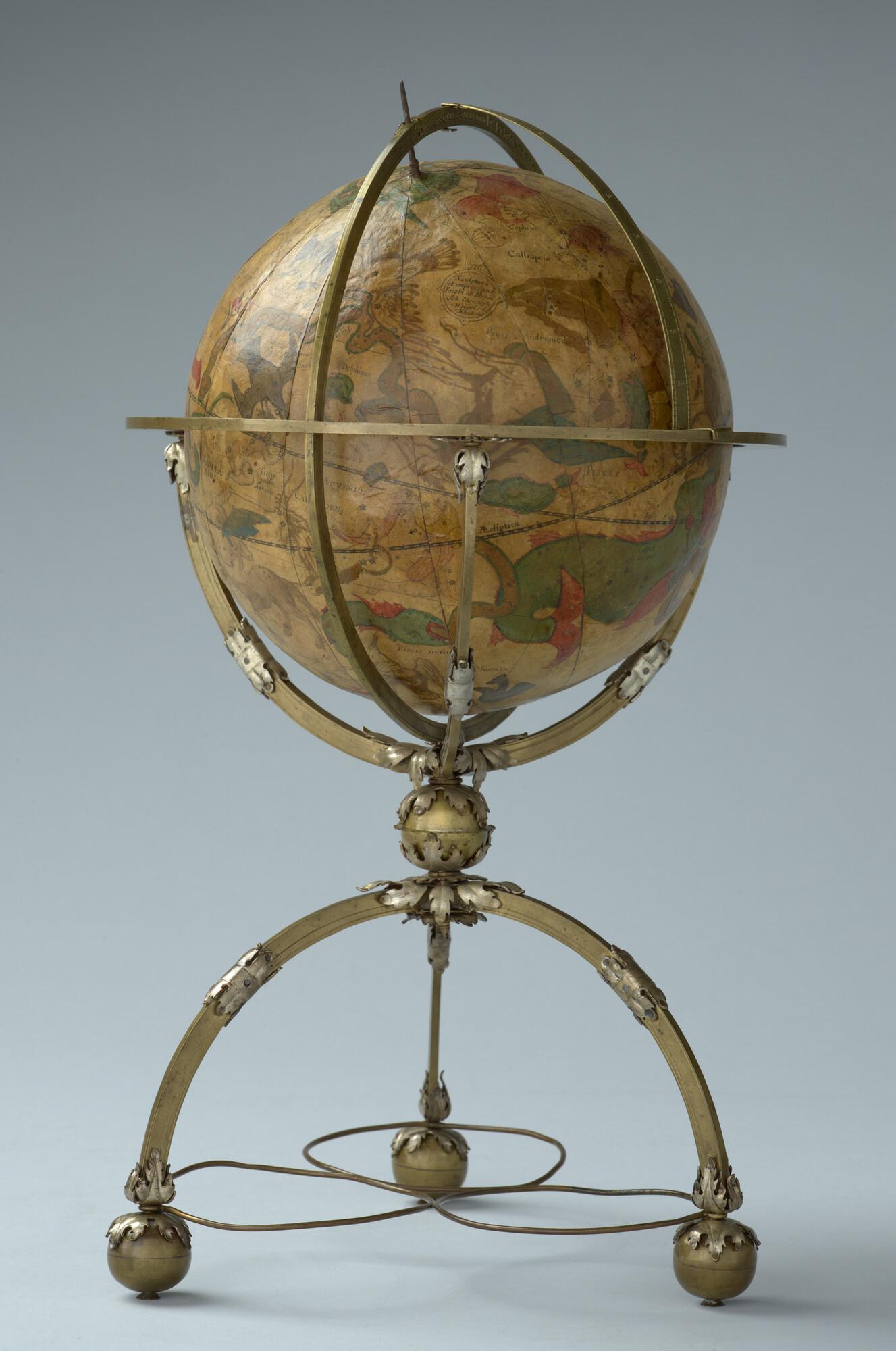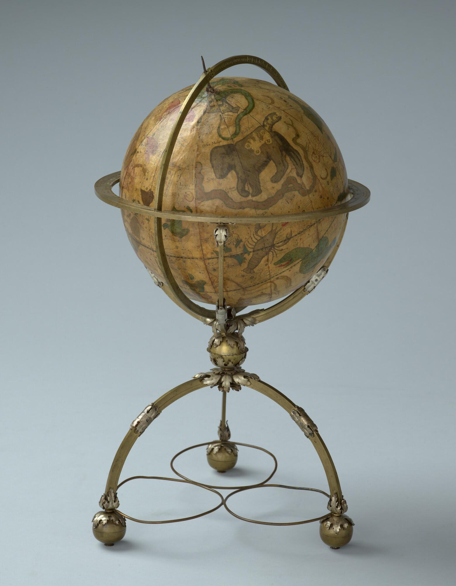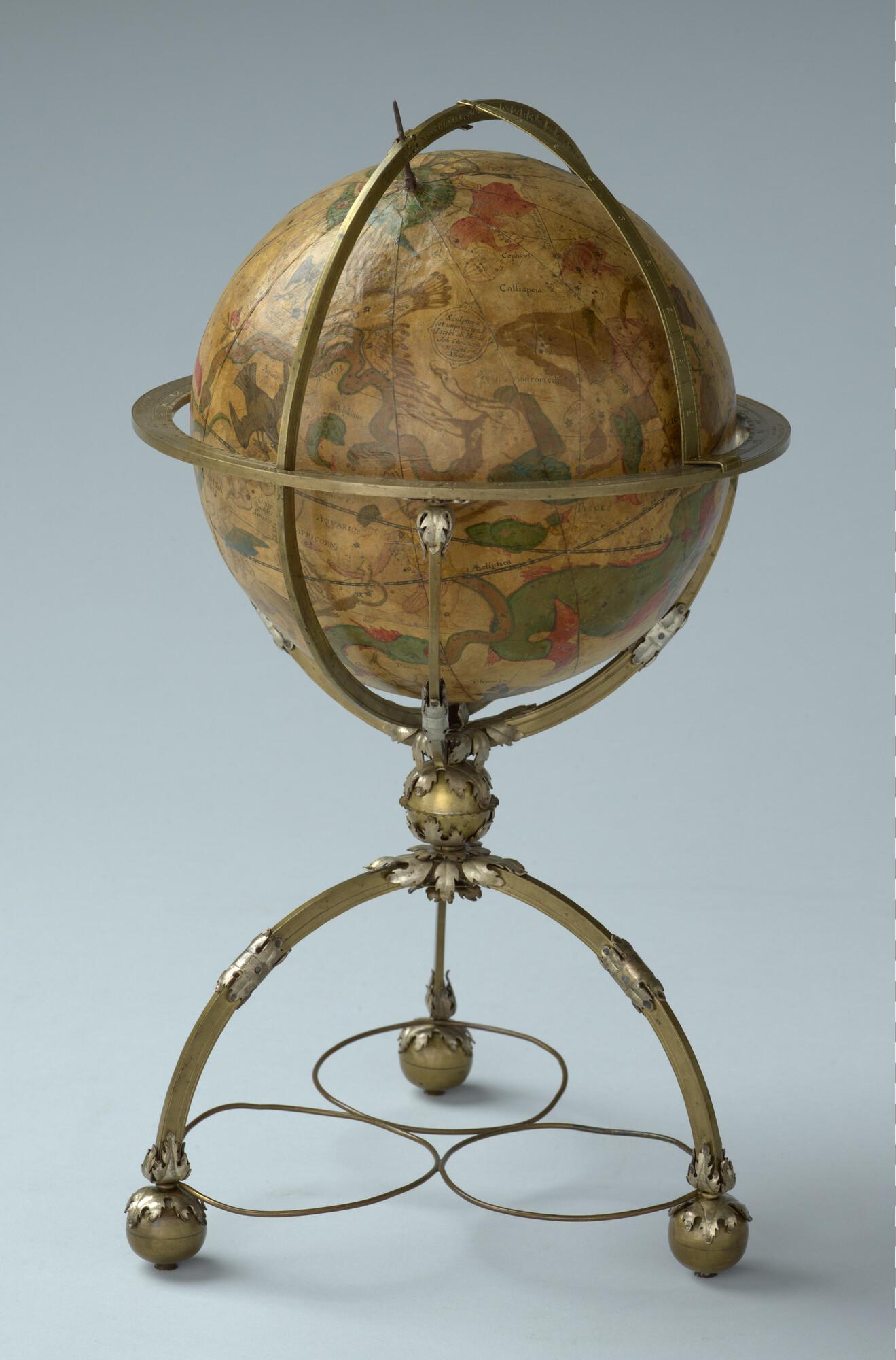 Hemelglobe van 20 cm. in doorsnede door Isaac Habrecht, circa 1625. Heruitgave te Neurenberg door Jacob von Heyden en Johann Christoph Weigel, circa 1700. In messing montuur op driepoot, versierd met eikenbladen.
