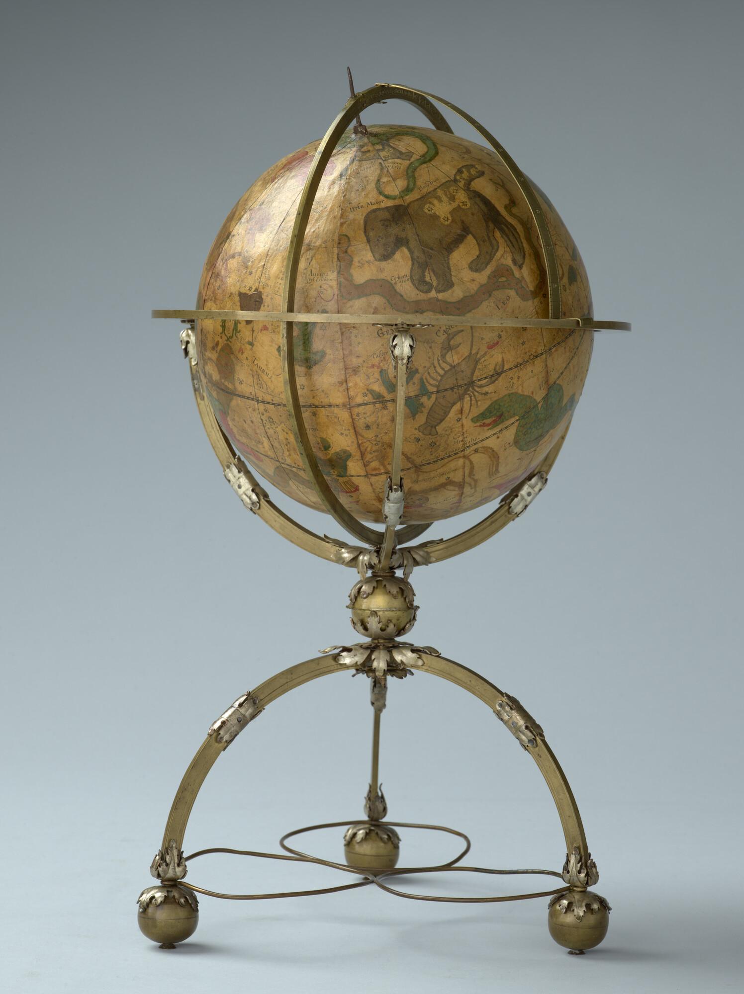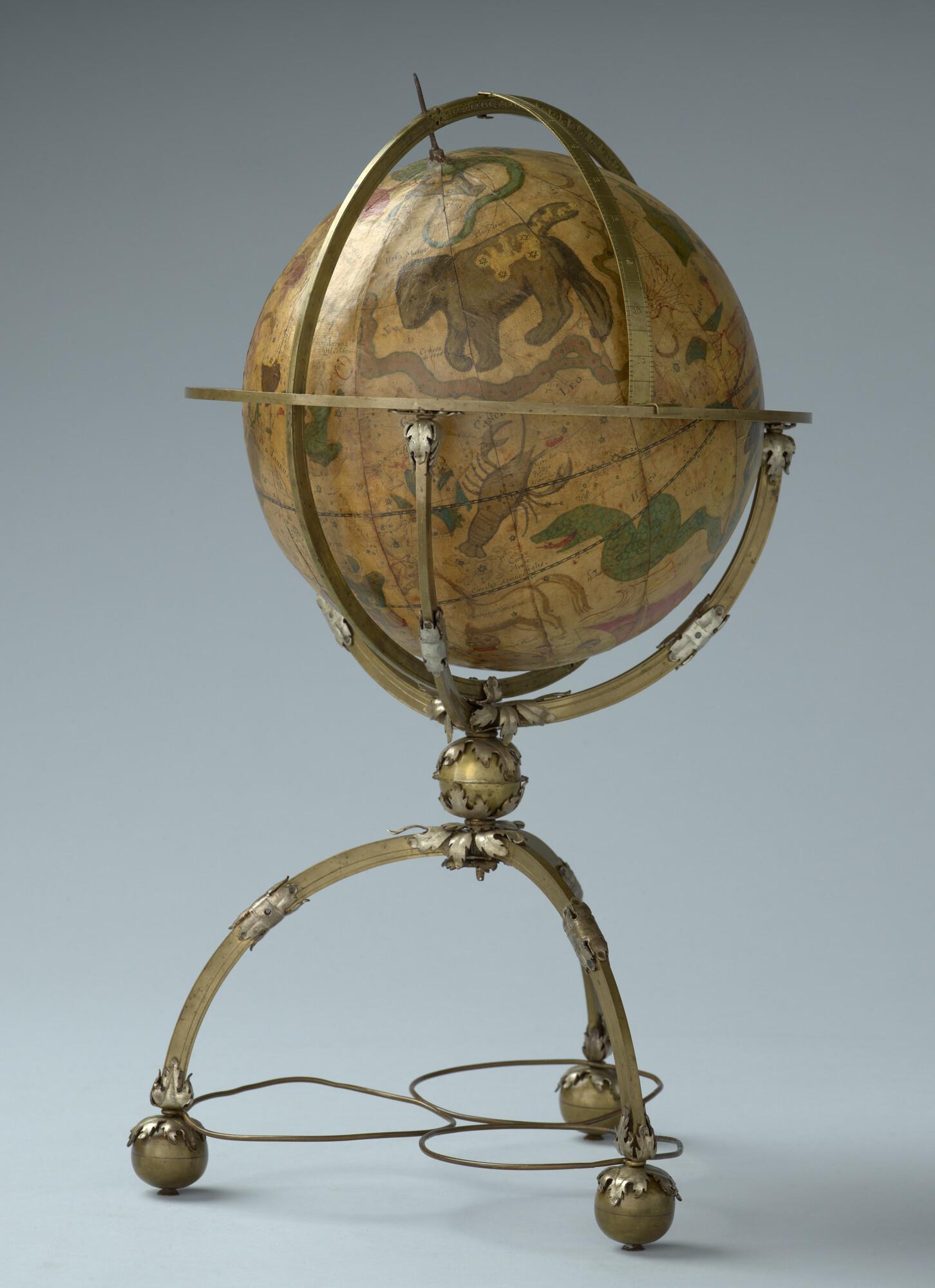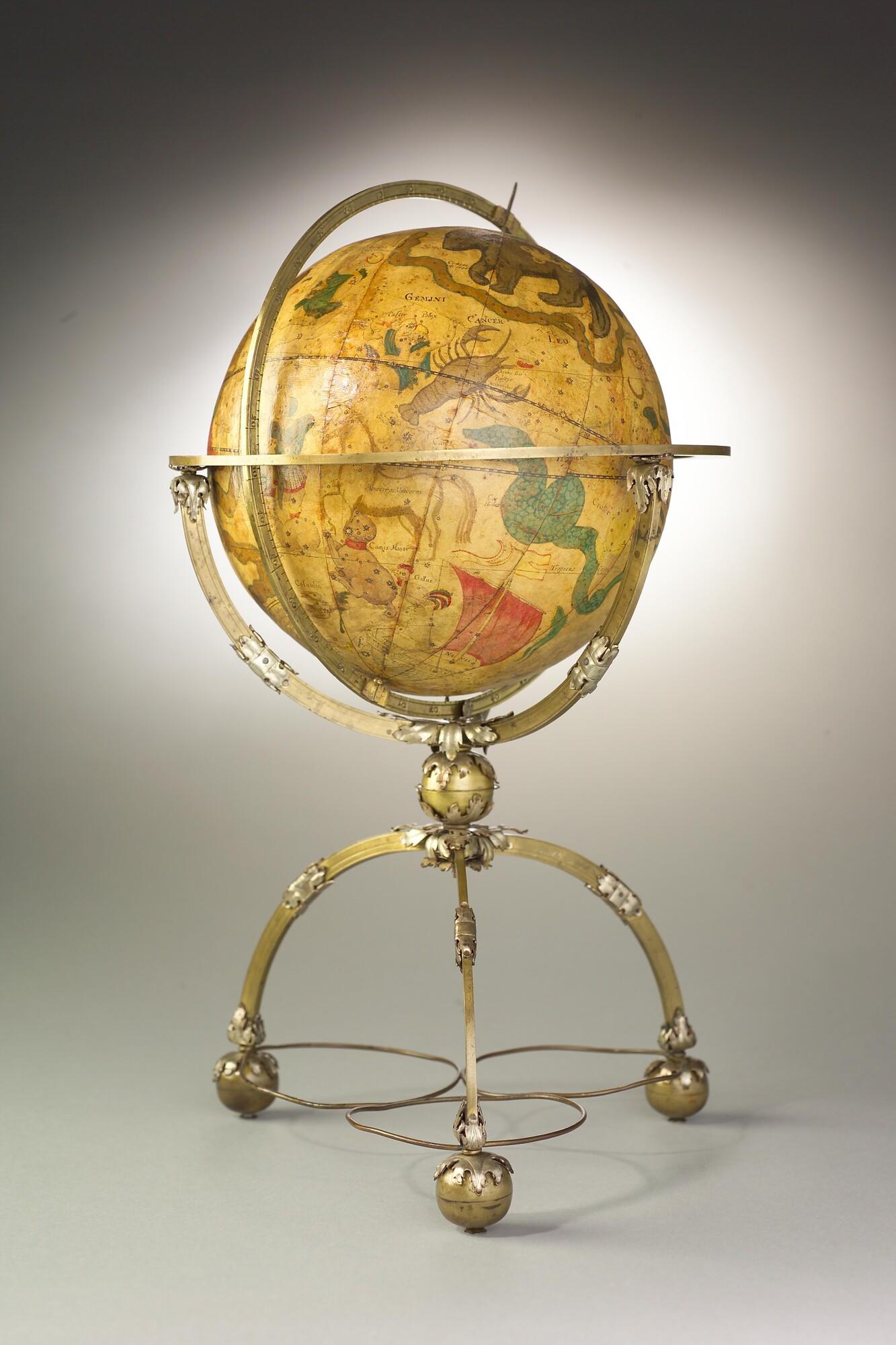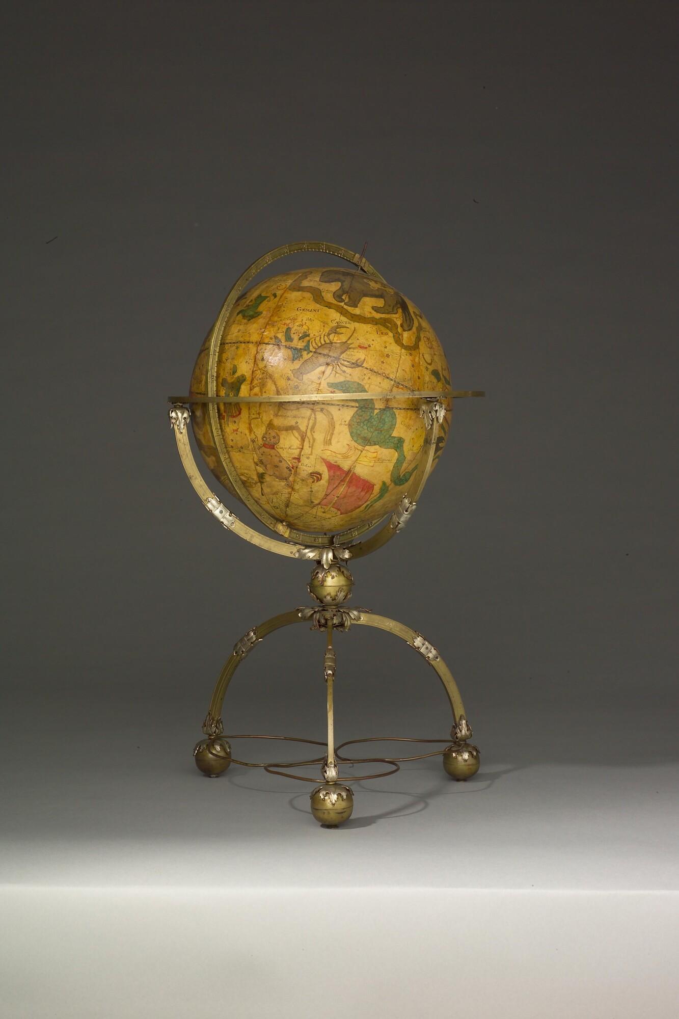 Hemelglobe van 20 cm. in doorsnede door Isaac Habrecht, circa 1625. Heruitgave te Neurenberg door Jacob von Heyden en Johann Christoph Weigel, circa 1700. In messing montuur op driepoot, versierd met eikenbladen.