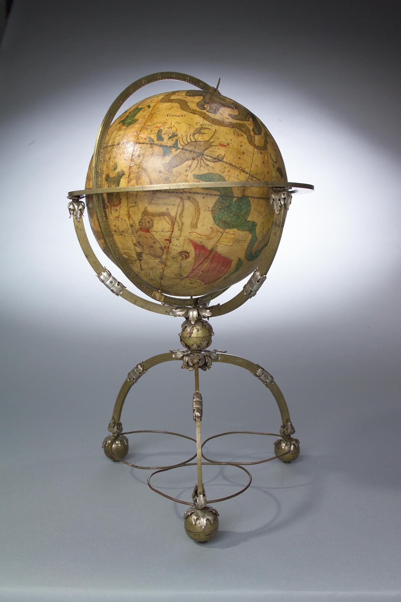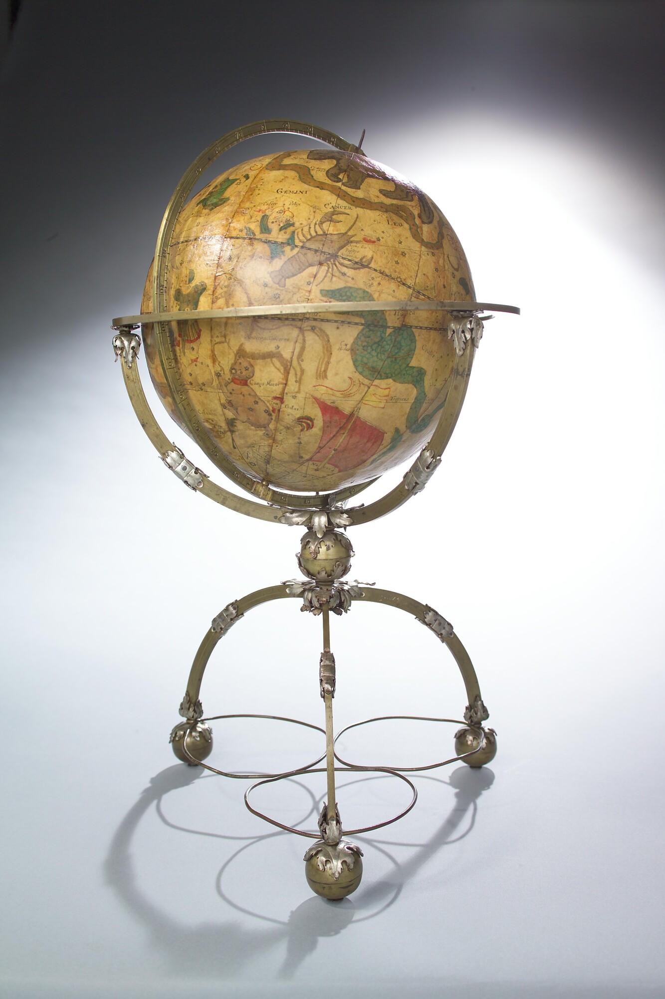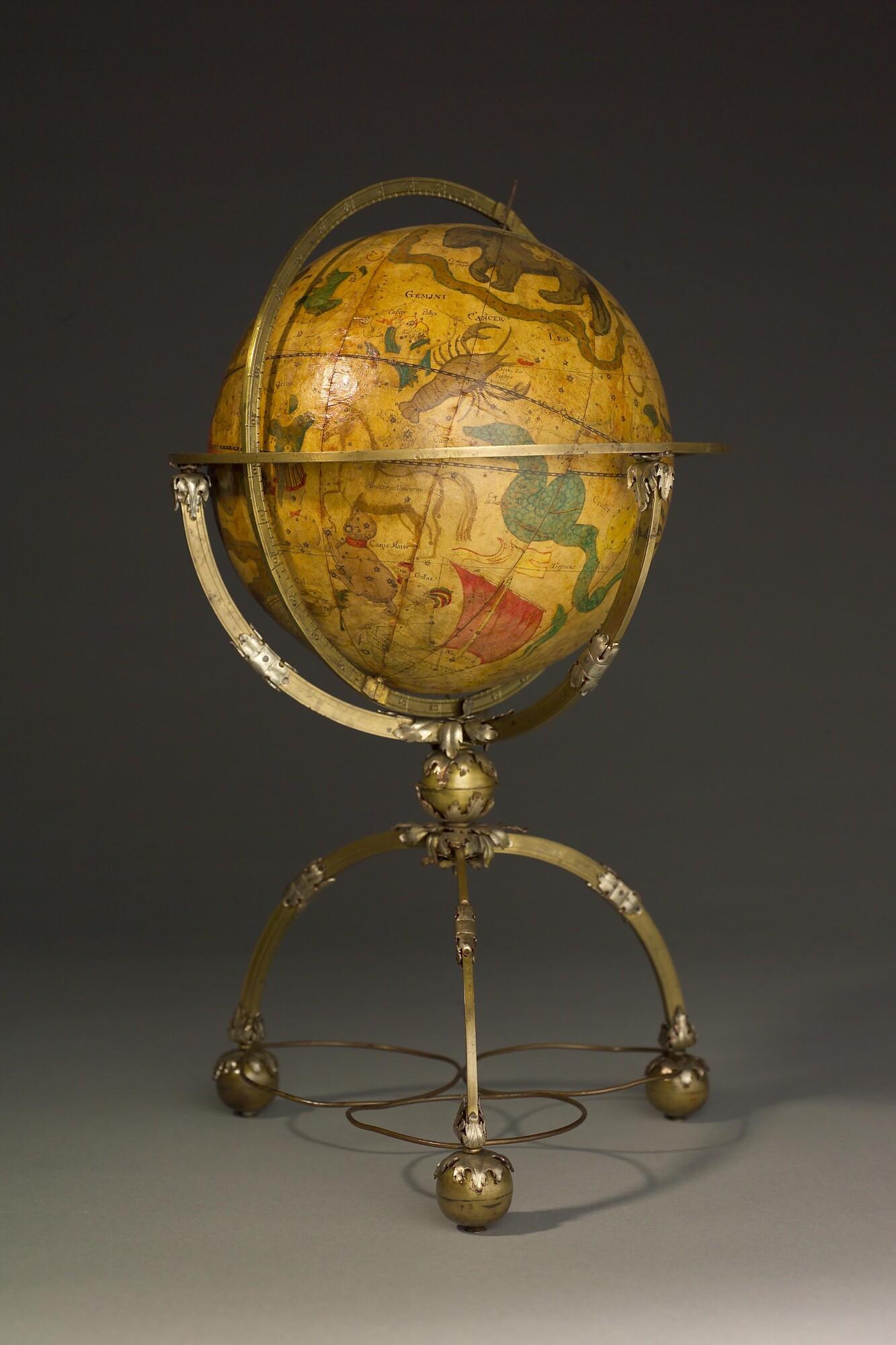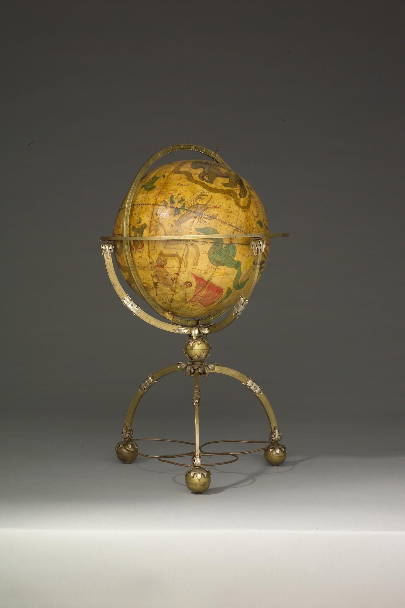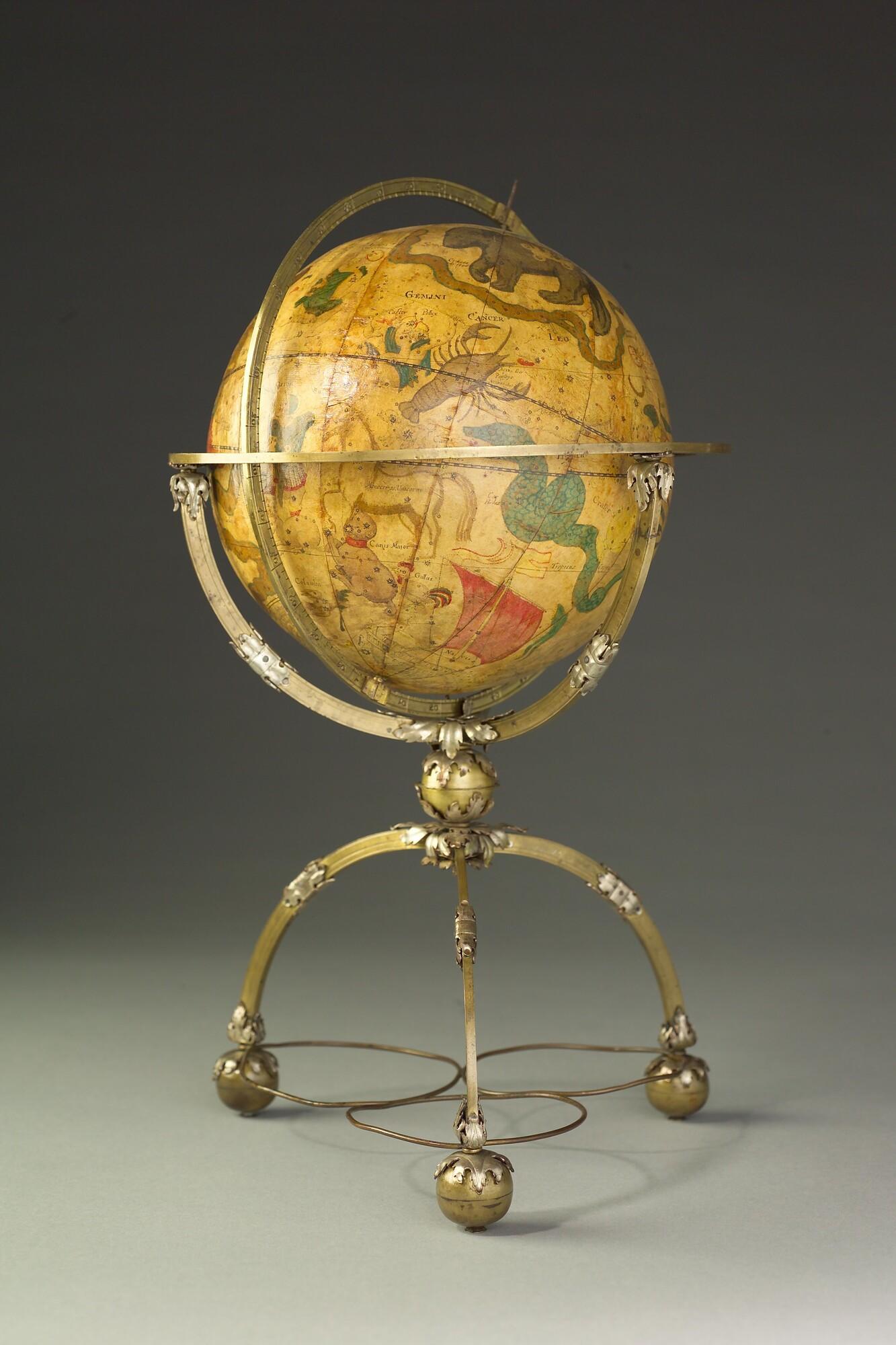 Hemelglobe van 20 cm. in doorsnede door Isaac Habrecht, circa 1625. Heruitgave te Neurenberg door Jacob von Heyden en Johann Christoph Weigel, circa 1700. In messing montuur op driepoot, versierd met eikenbladen.
