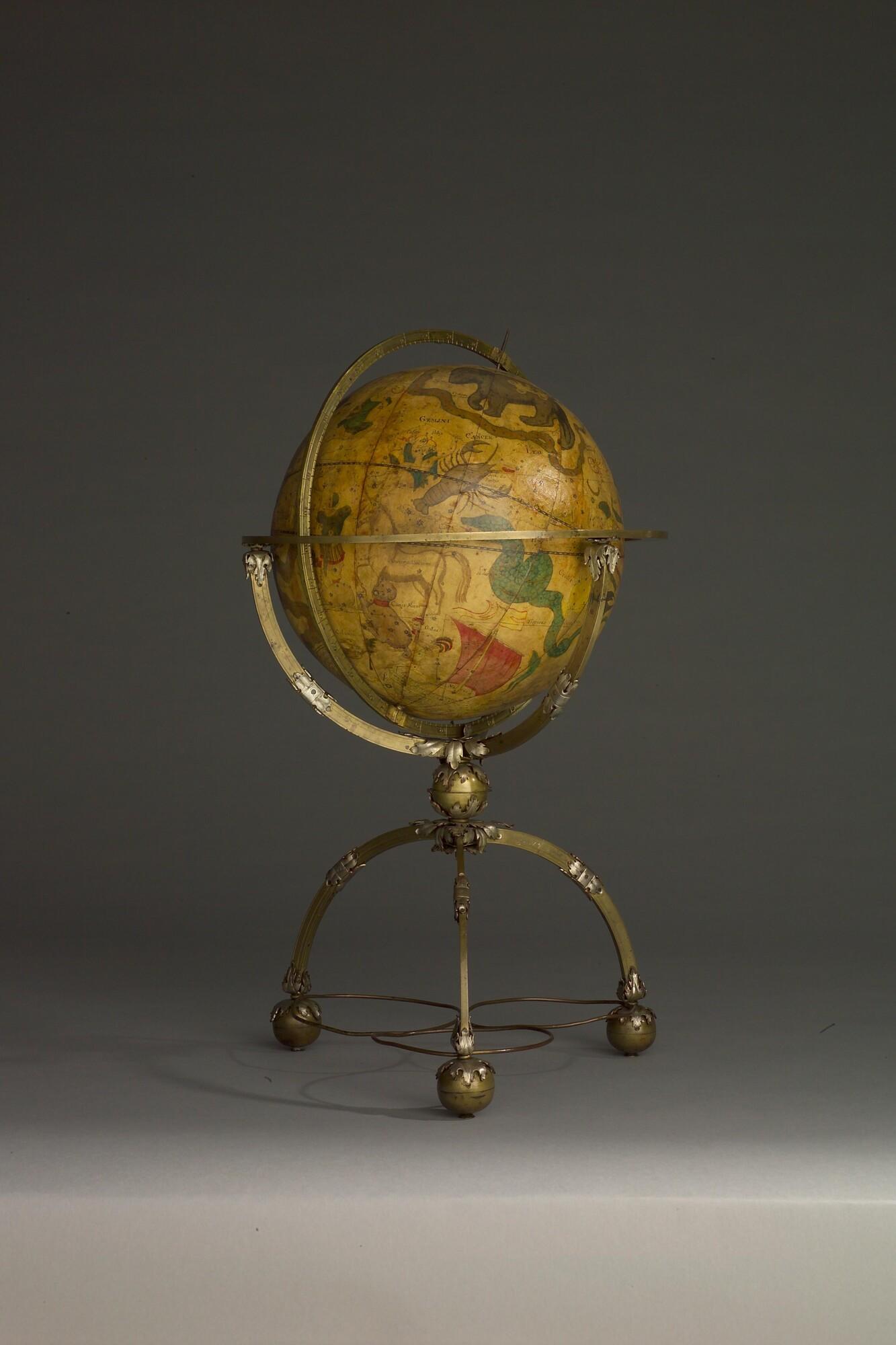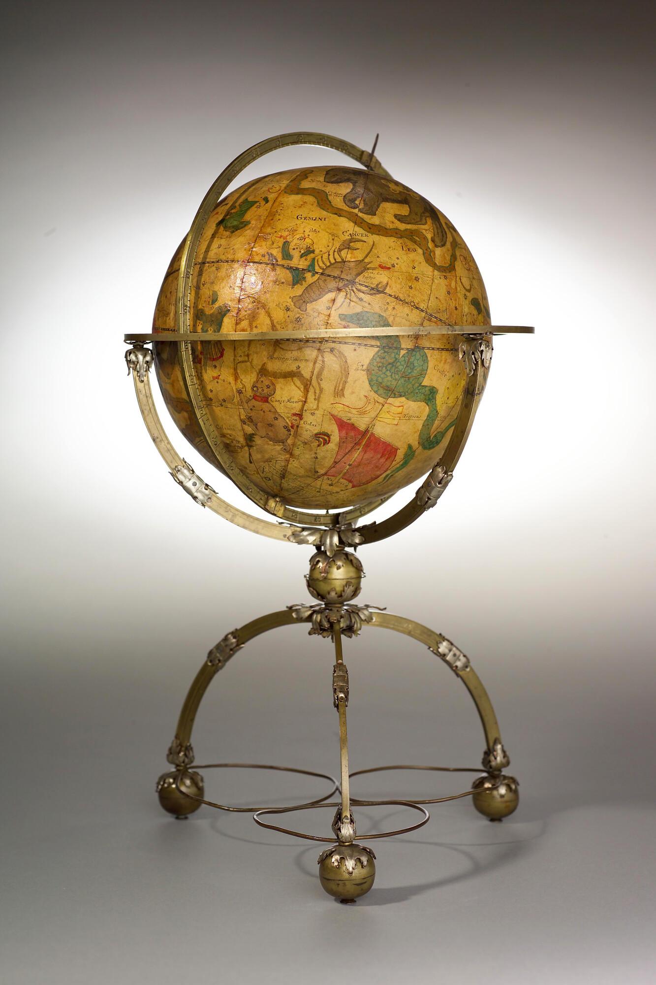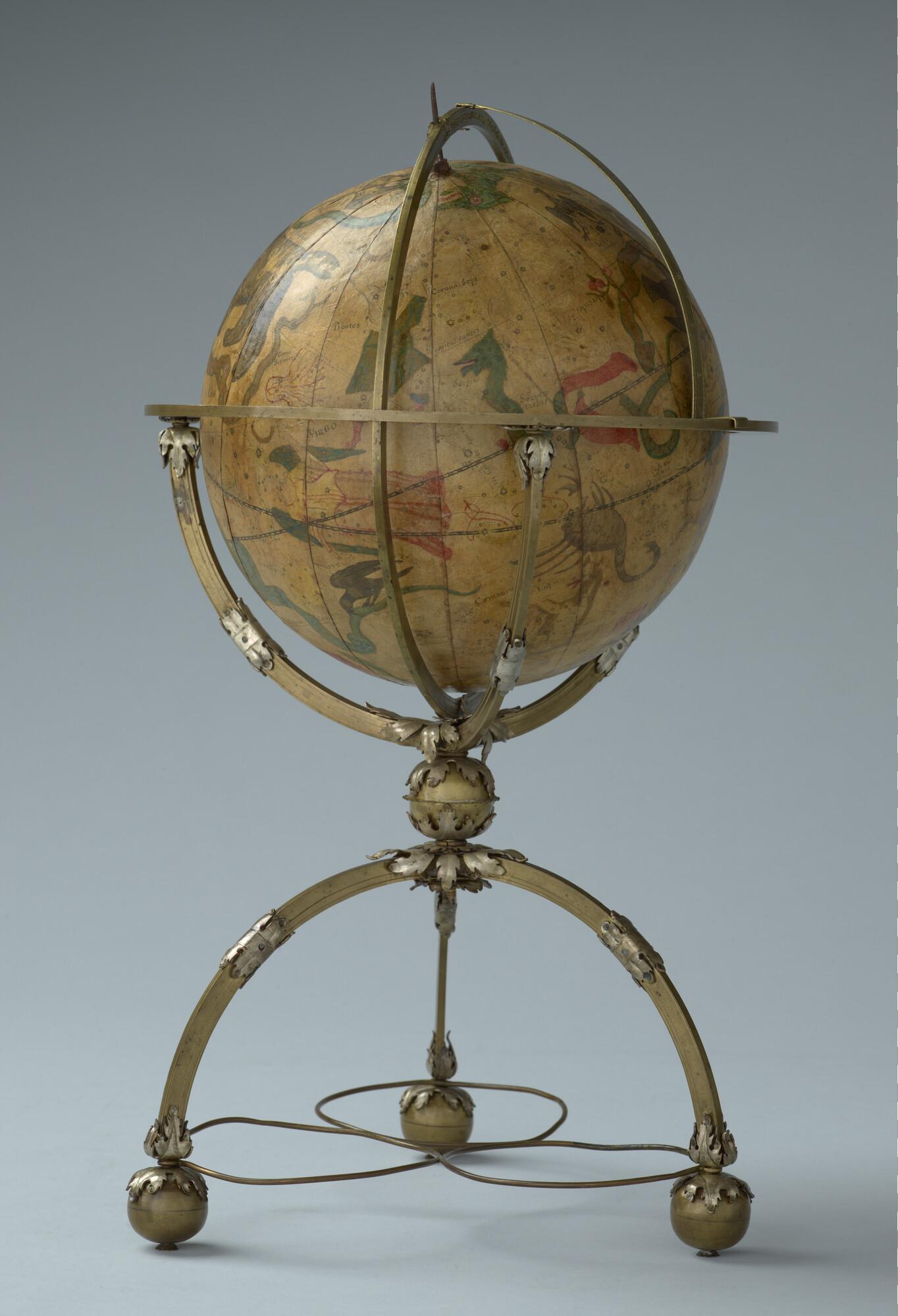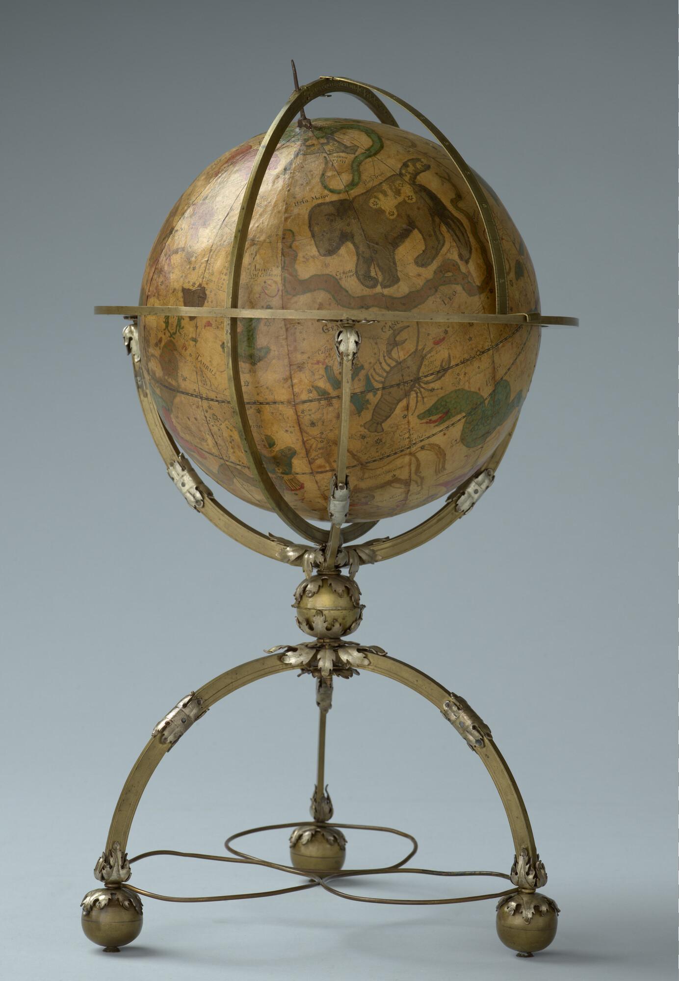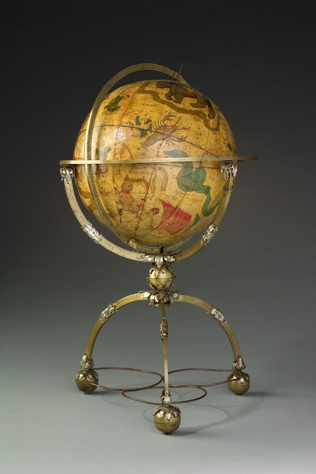 Hemelglobe van 20 cm. in doorsnede door Isaac Habrecht, circa 1625. Heruitgave te Neurenberg door Jacob von Heyden en Johann Christoph Weigel, circa 1700. In messing montuur op driepoot, versierd met eikenbladen.