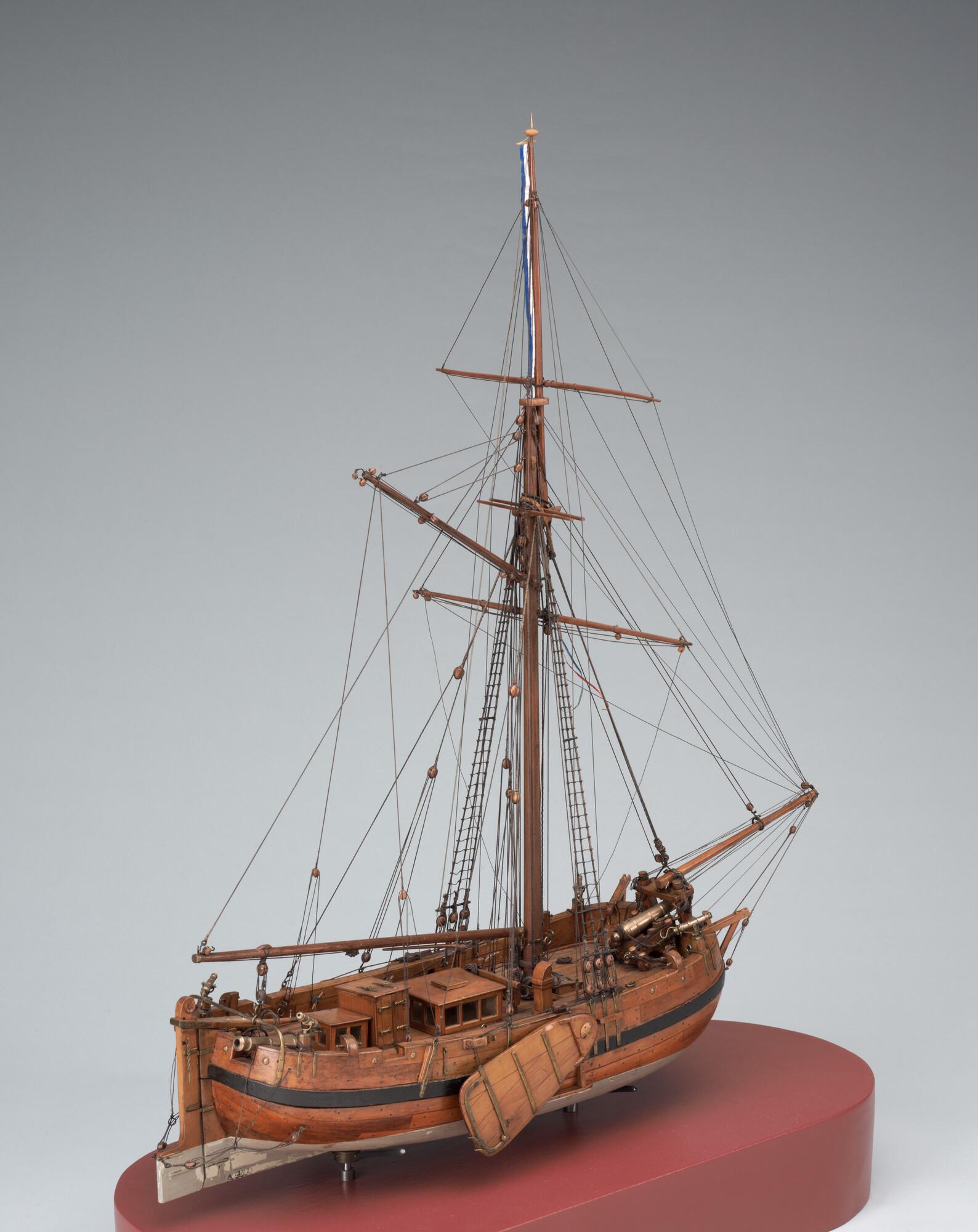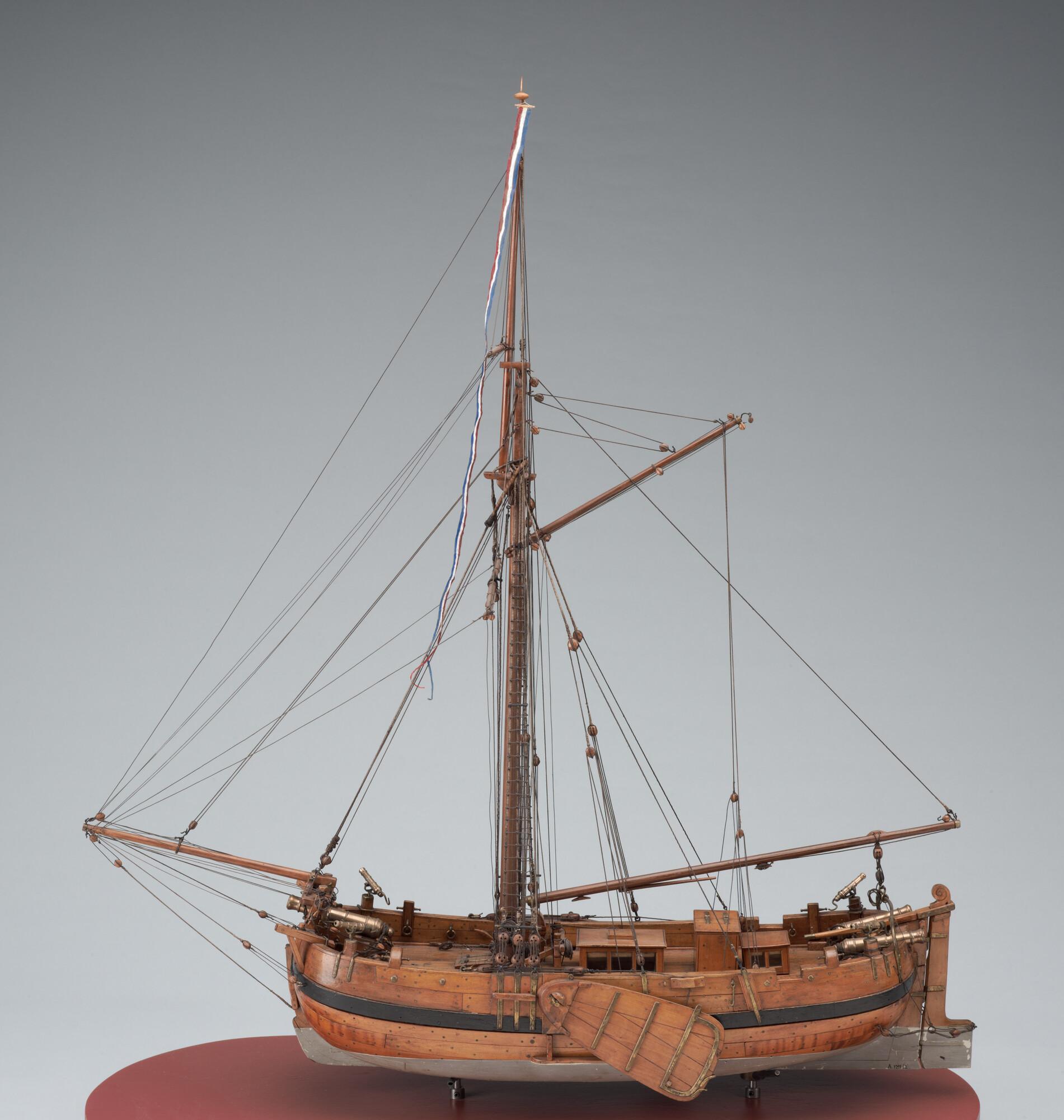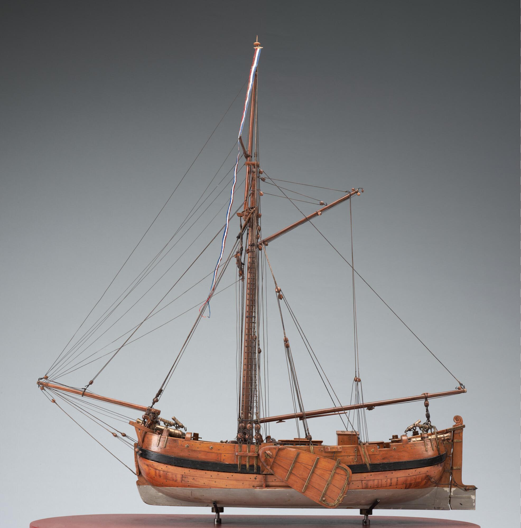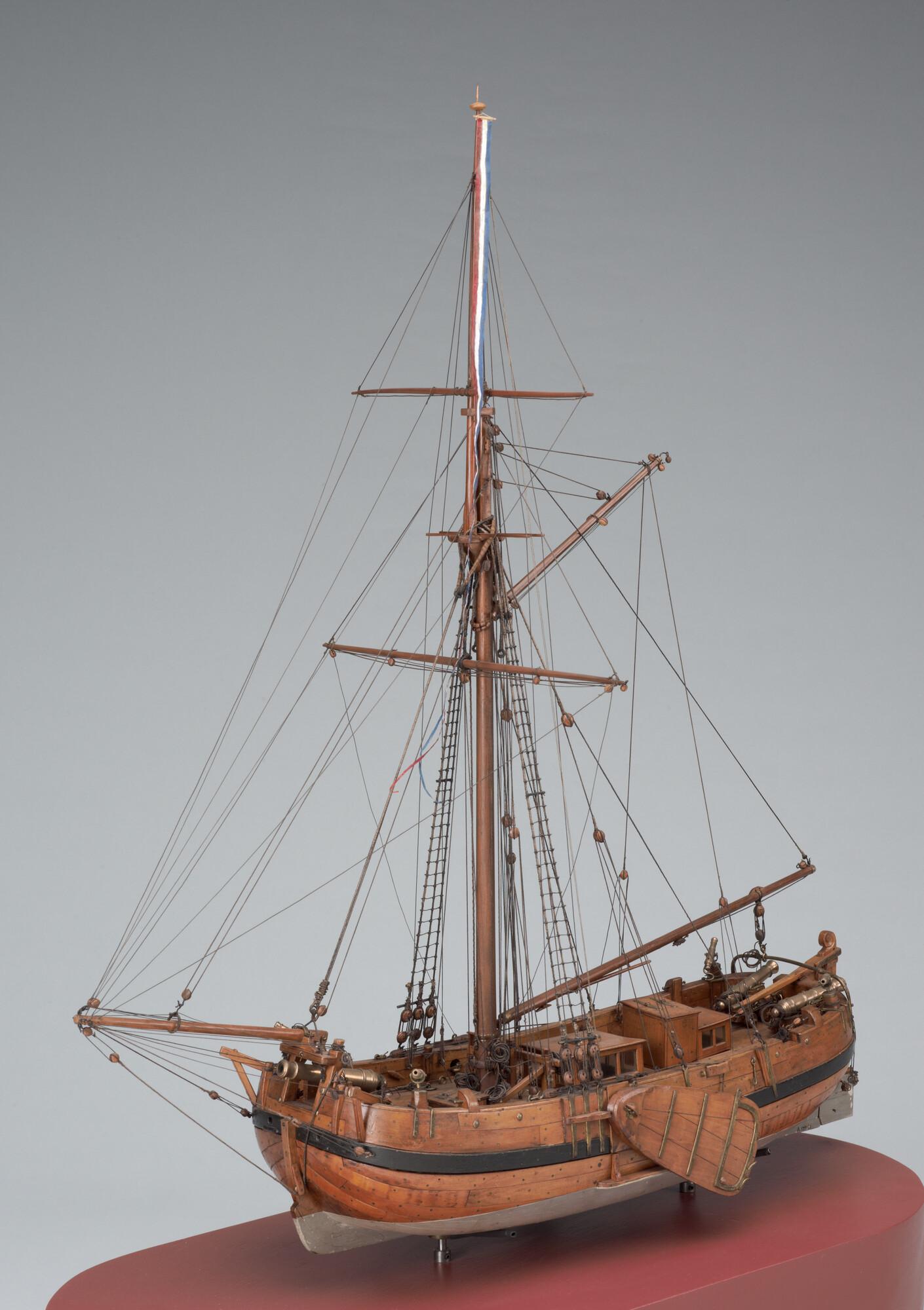Getuigd model van een gaffelkanonneerboot. Met dit type kanonneerboot vloog J.C.J. van Speyk de lucht in.