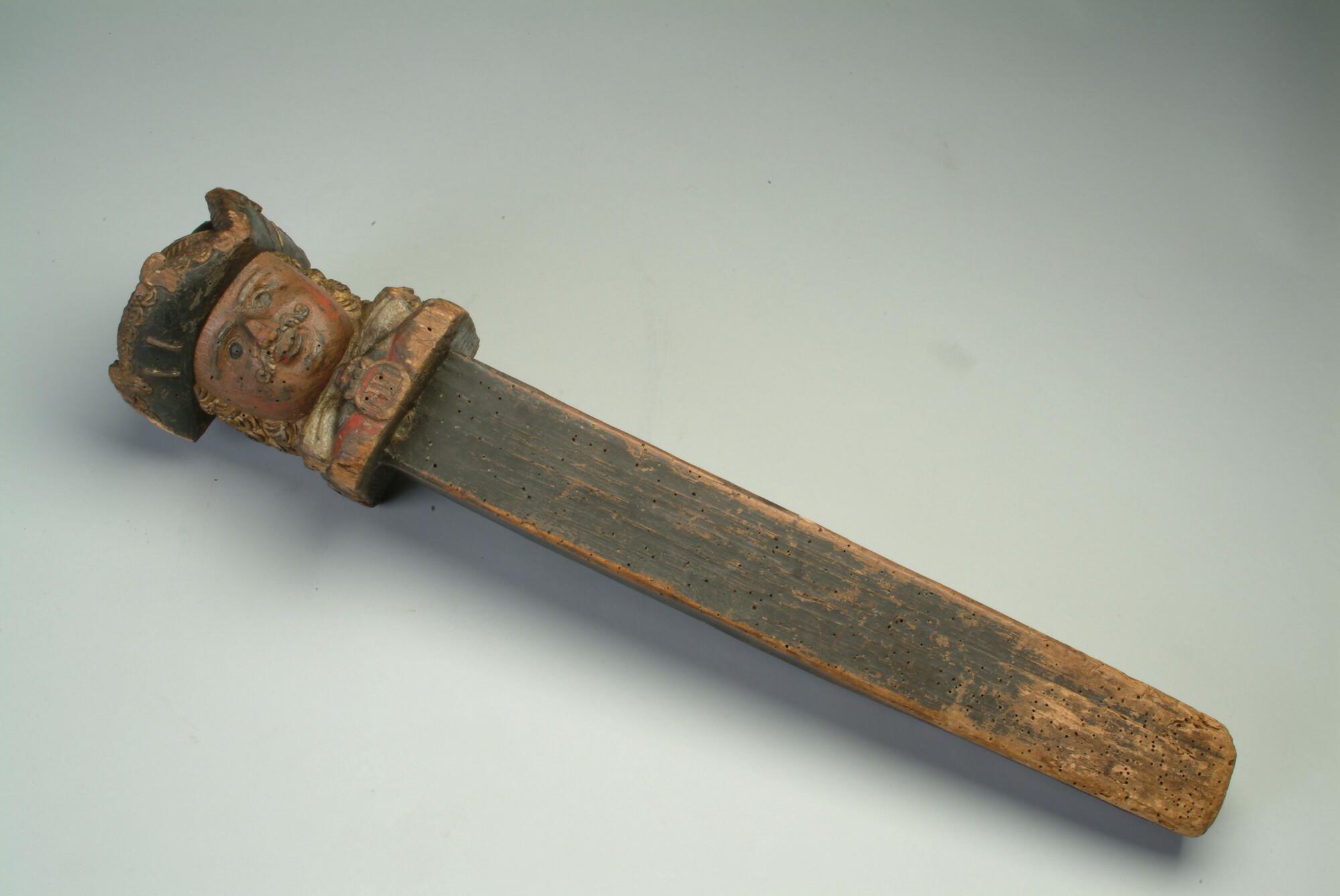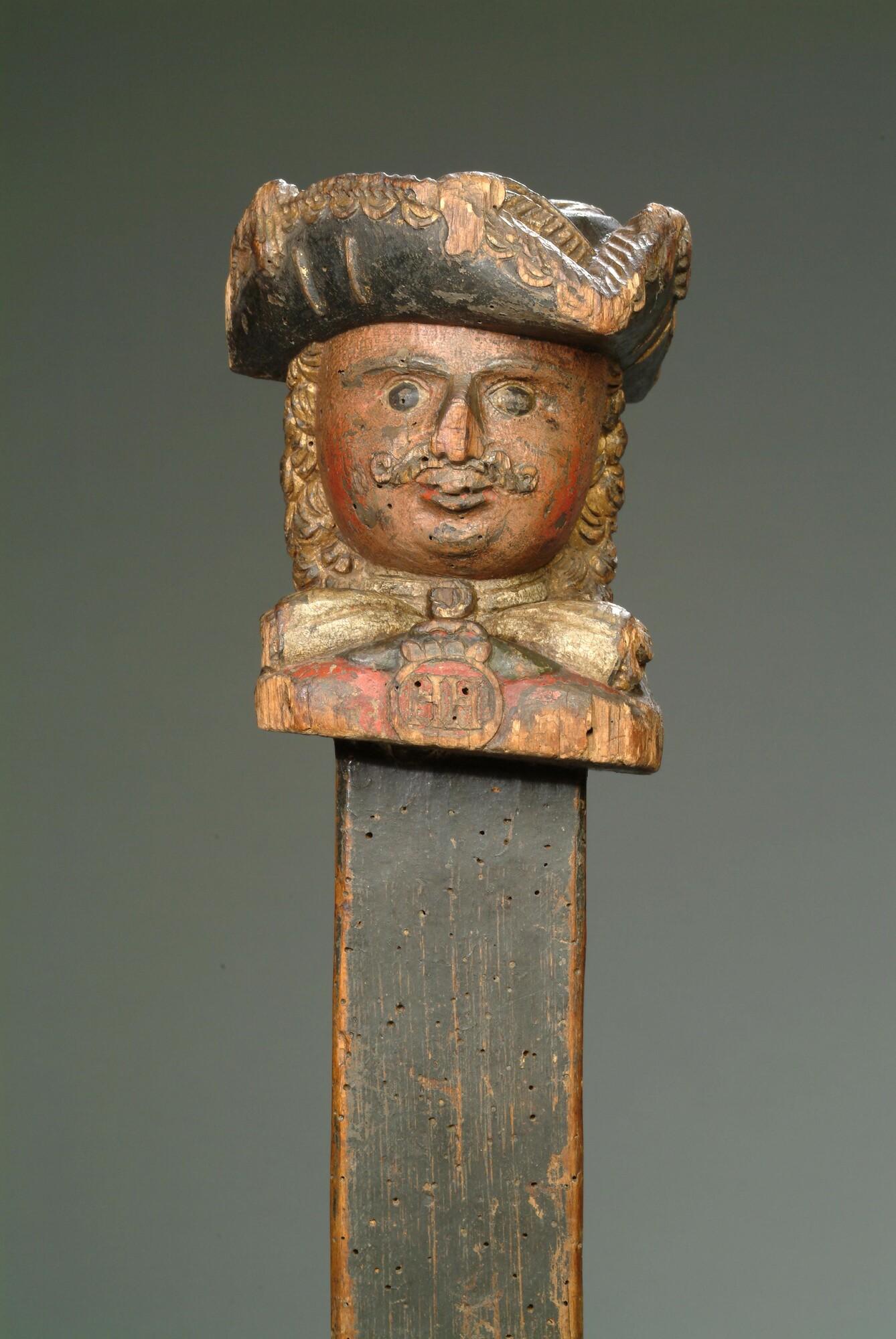 Braadspilpal bekroond met een mannenhoofd getooid met een driekante steek. Het hoofd staat op een donker gekleurde taps toelopende paal.