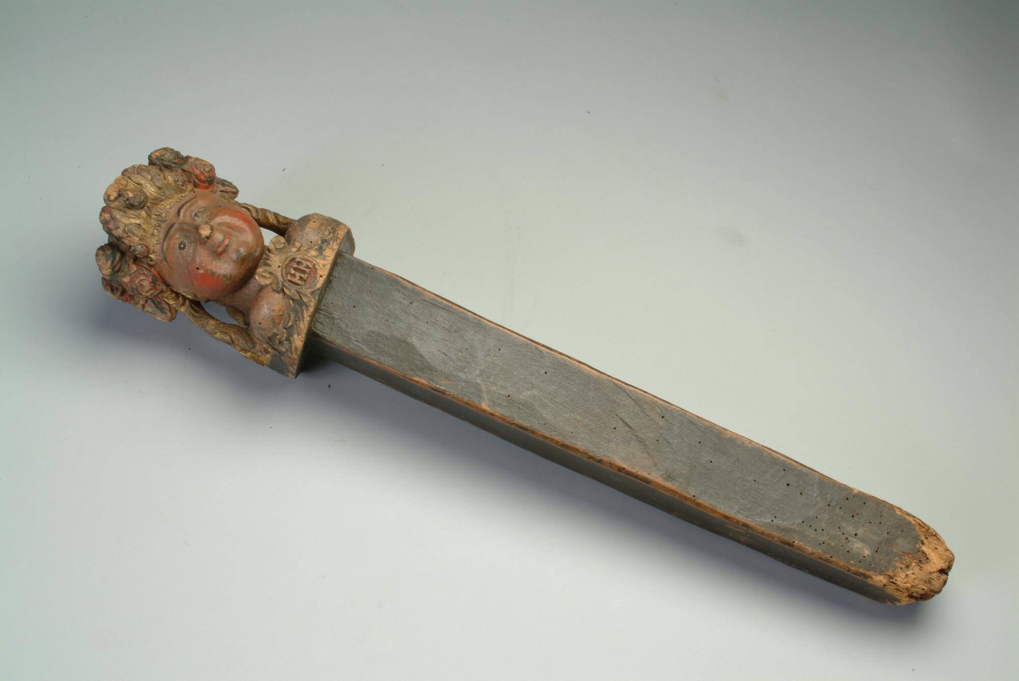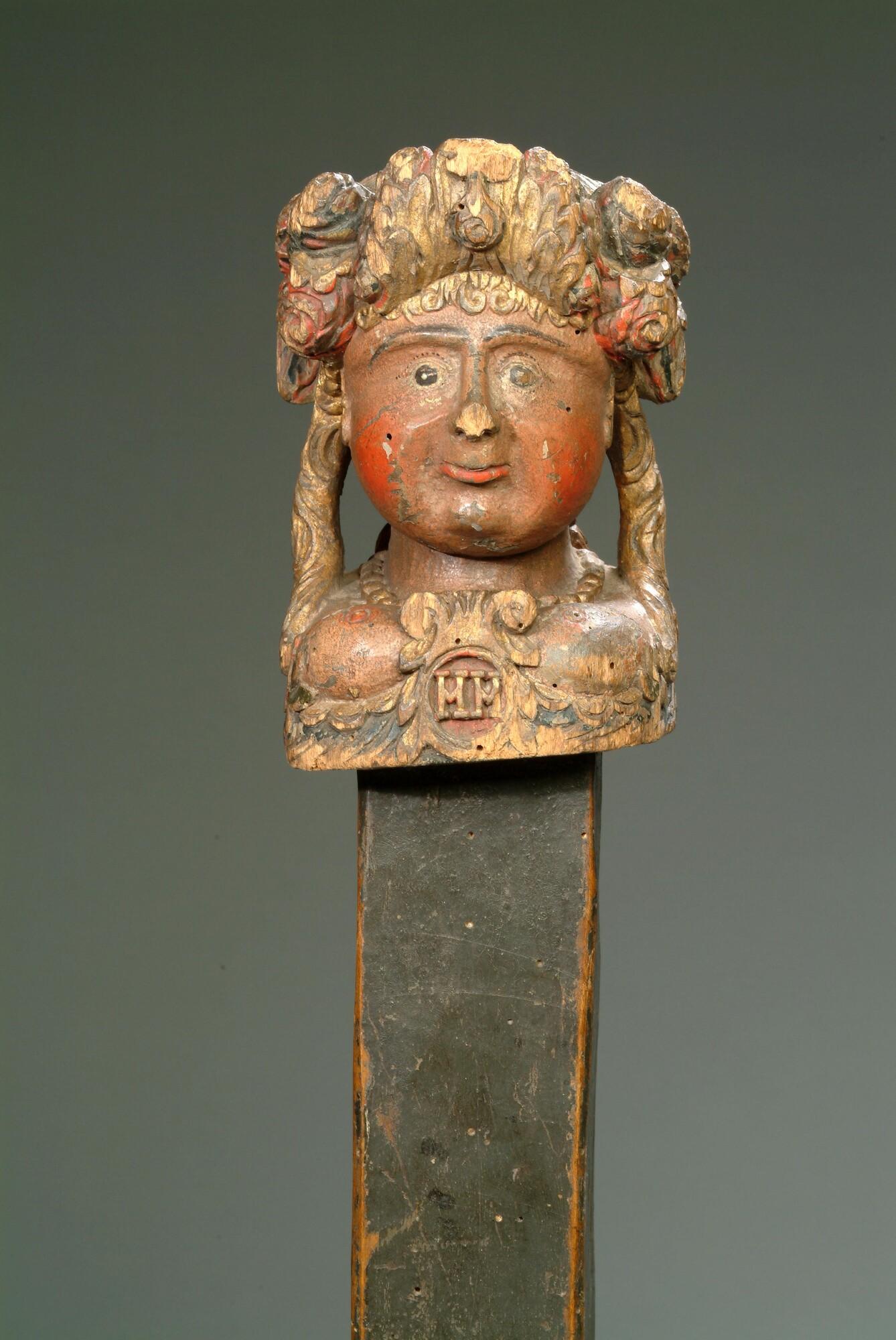 Braadspilpal bekroond met een vrouwenhoofd getooid met een bloemen- en fruitkrans, een z.g. 'Flora'. Het hoofd staat op een donker gekleurde taps toelopende paal.