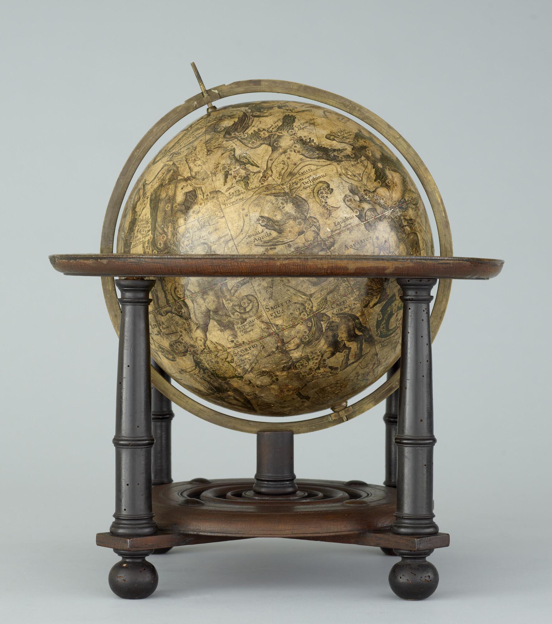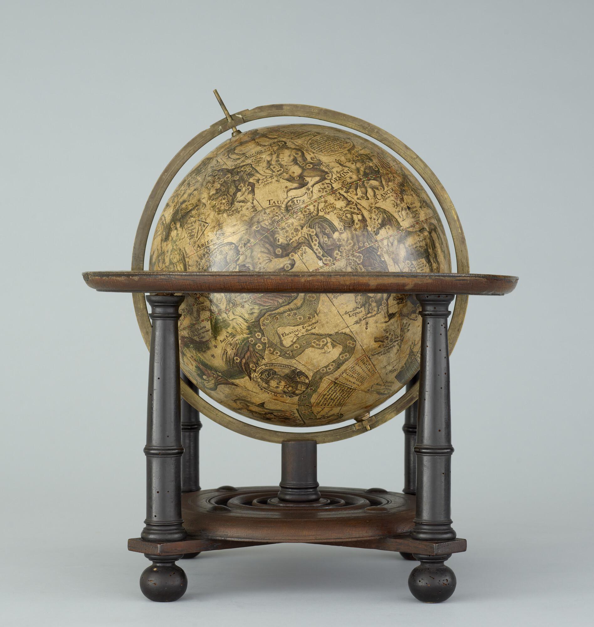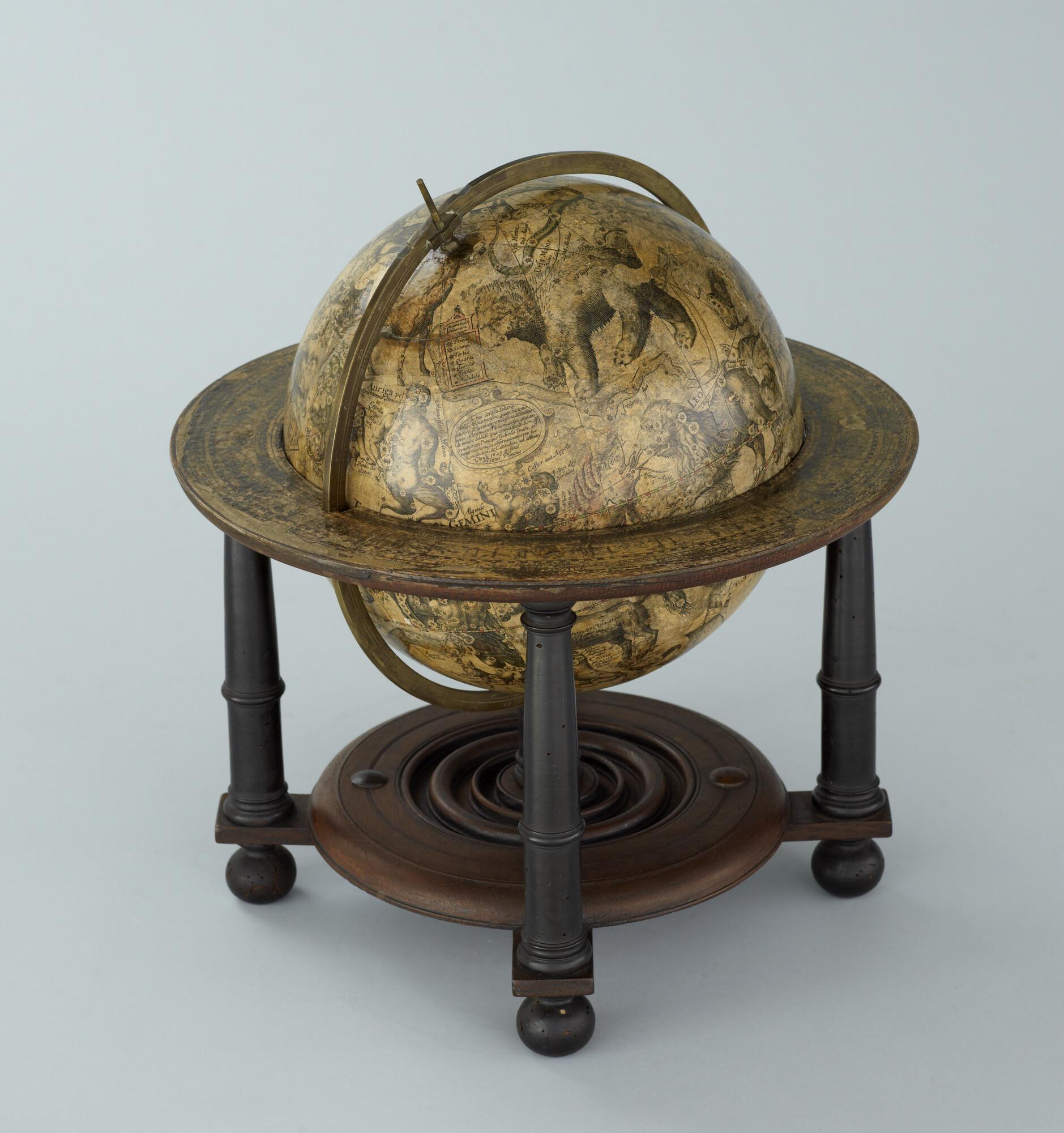 Hemelglobe van 26,5 cm doorsnede door Petrus Plancius, circa 1625. Op de globe een portret van Tycho Brahe.