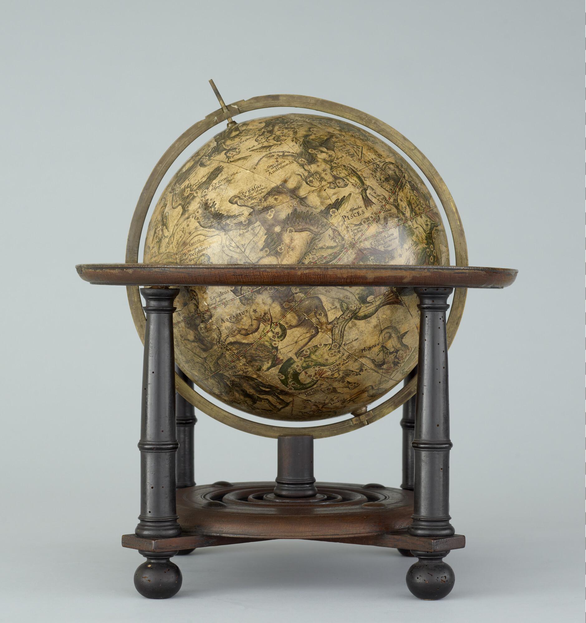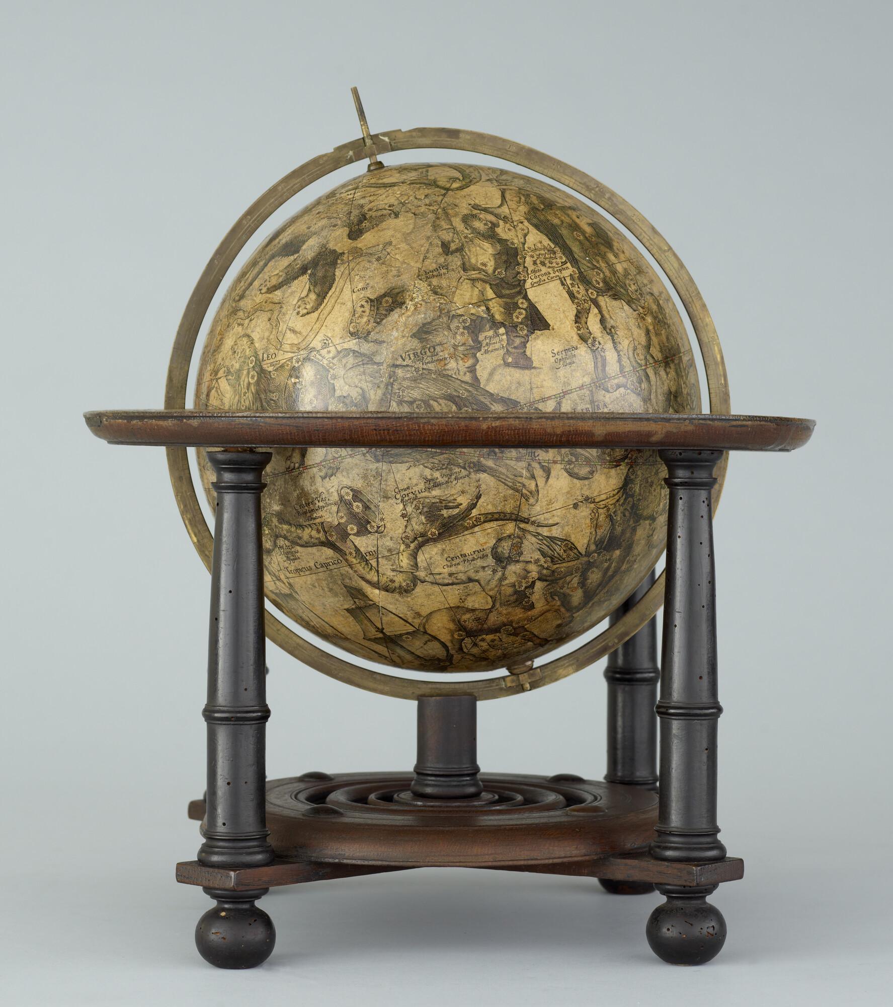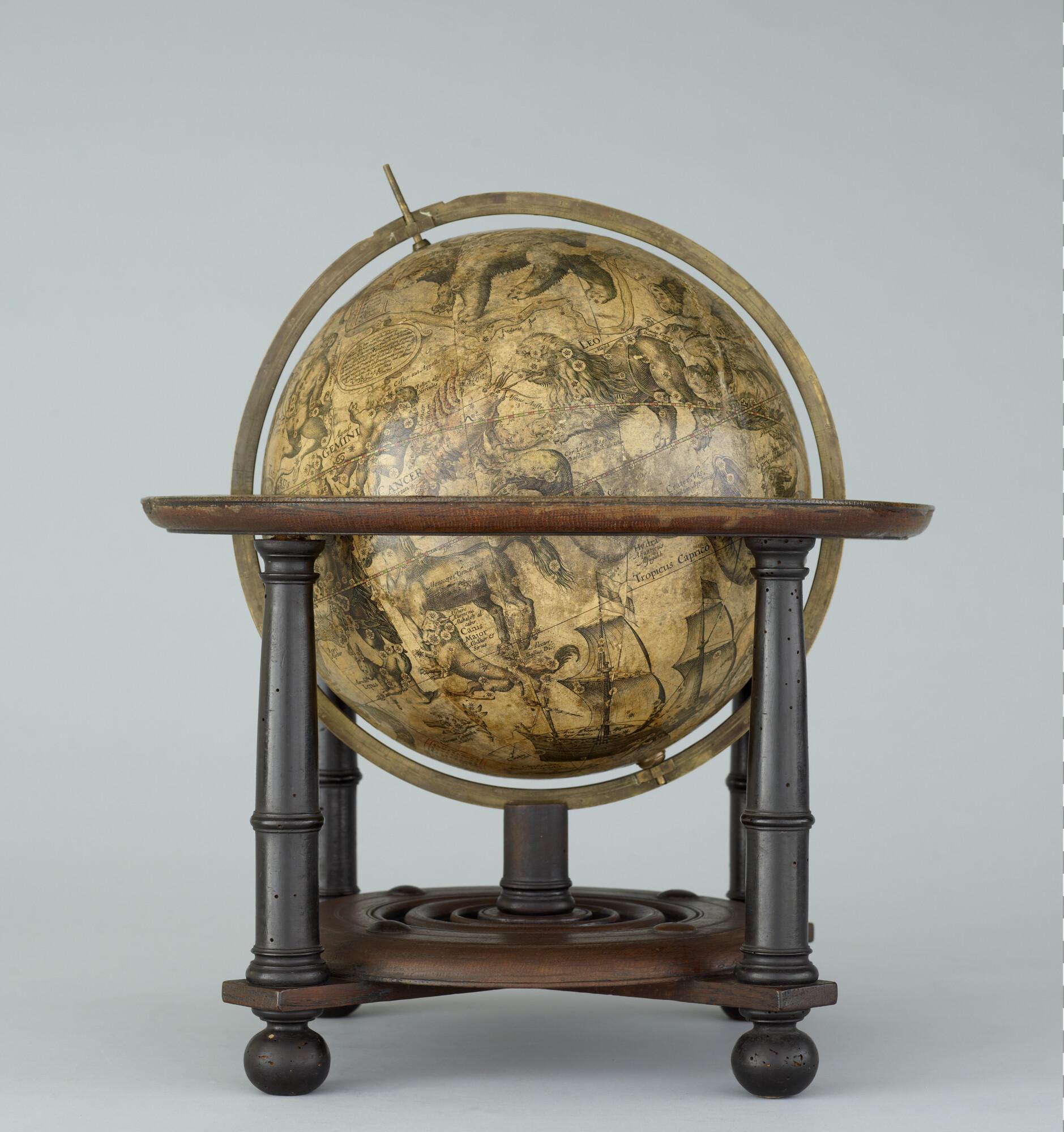 Hemelglobe van 26,5 cm doorsnede door Petrus Plancius, circa 1625. Op de globe een portret van Tycho Brahe.