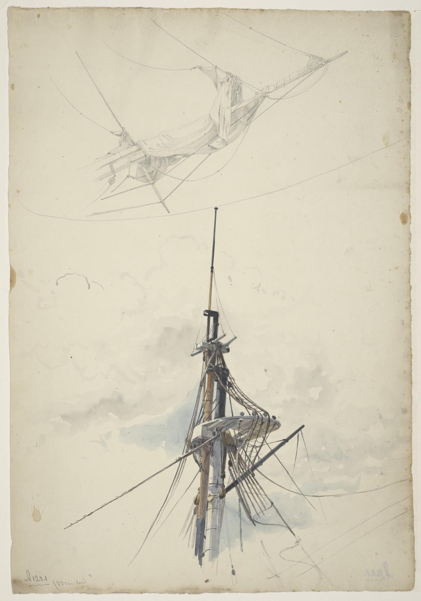 Tuigonderdelen: een masttop en een boegspriet van een zeilschip; verso: een masttop.