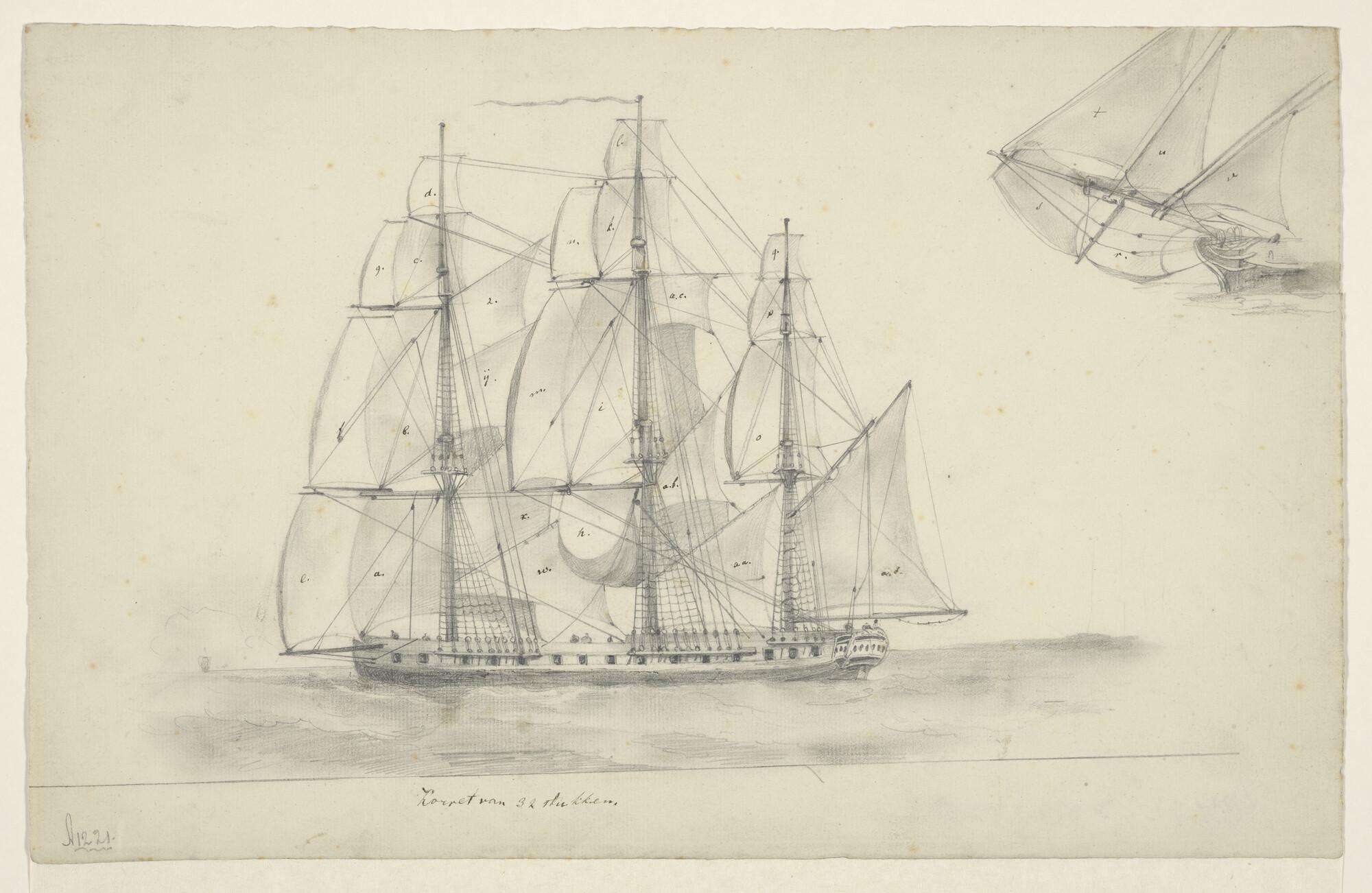 Een oorlogskorvet van 32 stukken, de zeilen gemerkt met letters en cijfers. Op dezelfde tekening zichtbaar de 3 voorstagzeilen en blindezeilen.