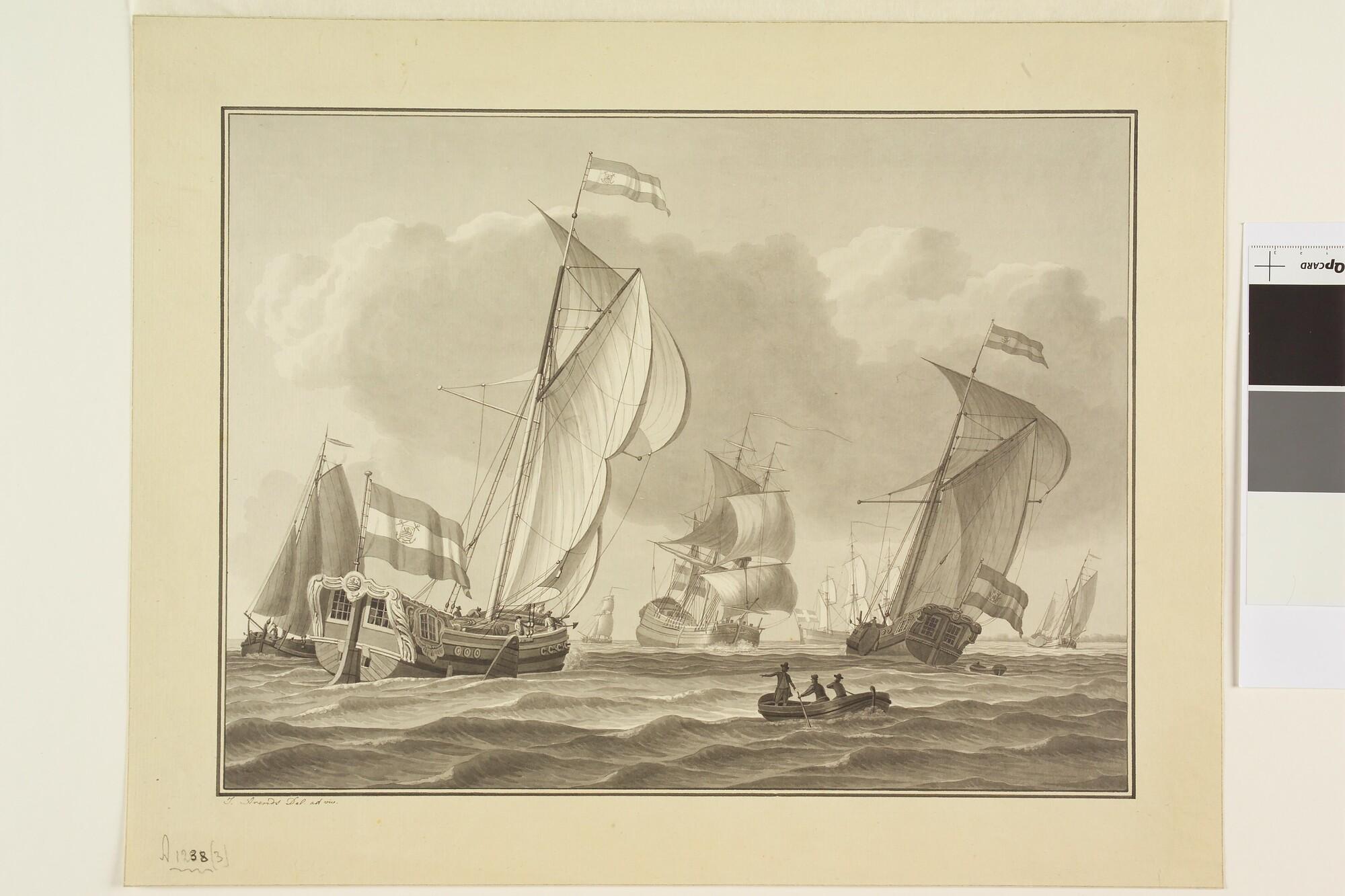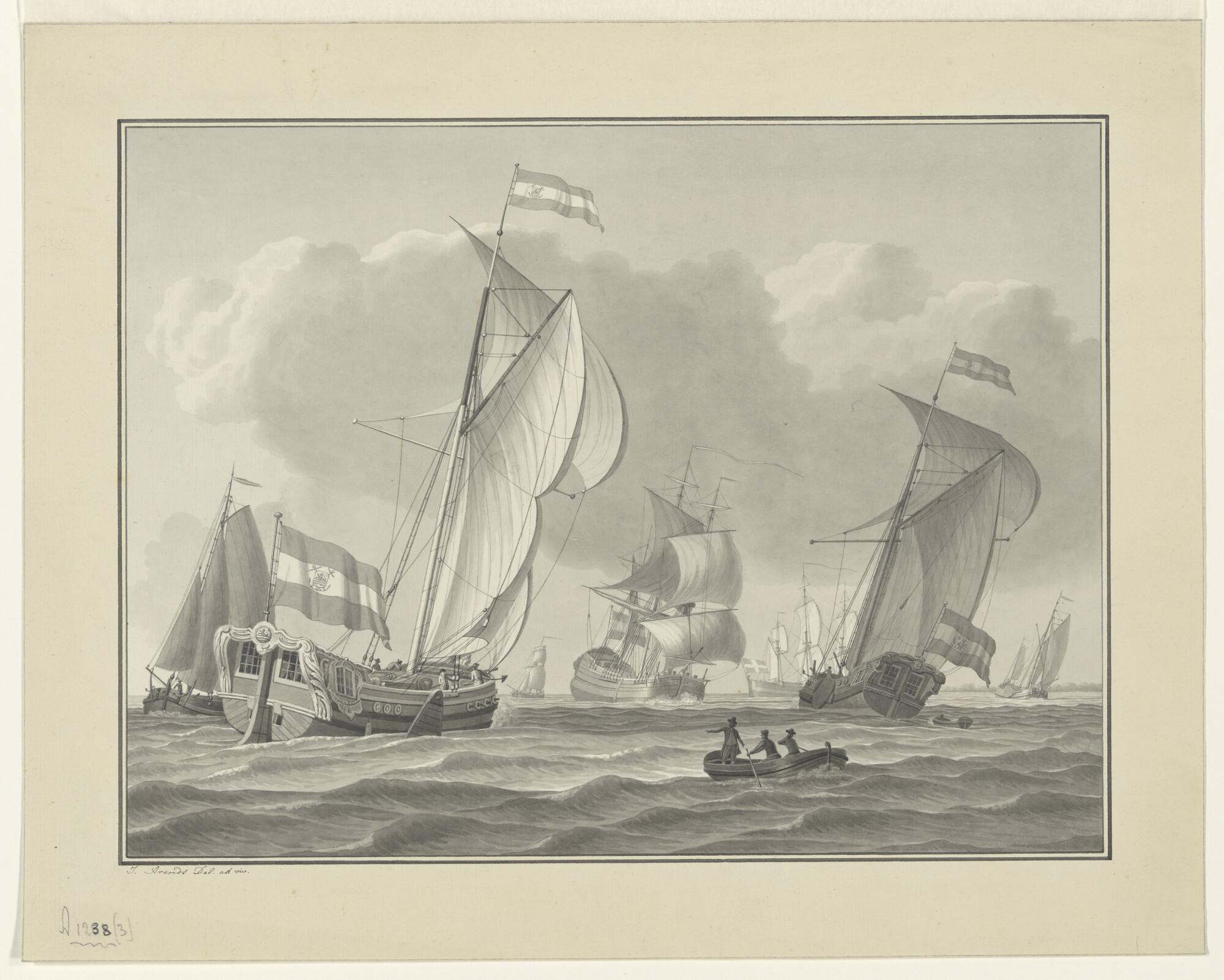 Een spiegelpaviljoenjacht van de Zeeuwse Admiraliteit en van de Staten-Generaal en andere schepen op een rede.