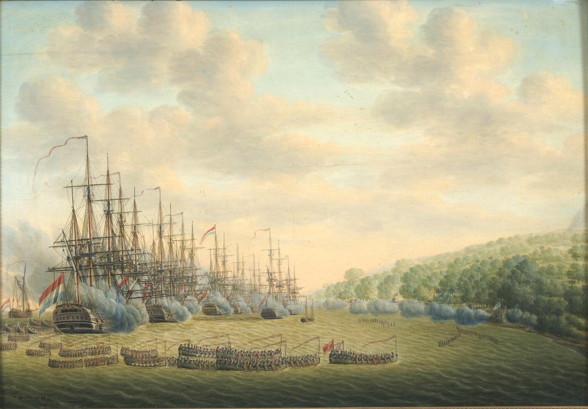 Landing van 's Lands eskader onder commando van kapitein J.P. van Braam op de kust van Malakka bij Toeloe Cattapang, tijdens de expeditie naar Oost-Indië, 1784.