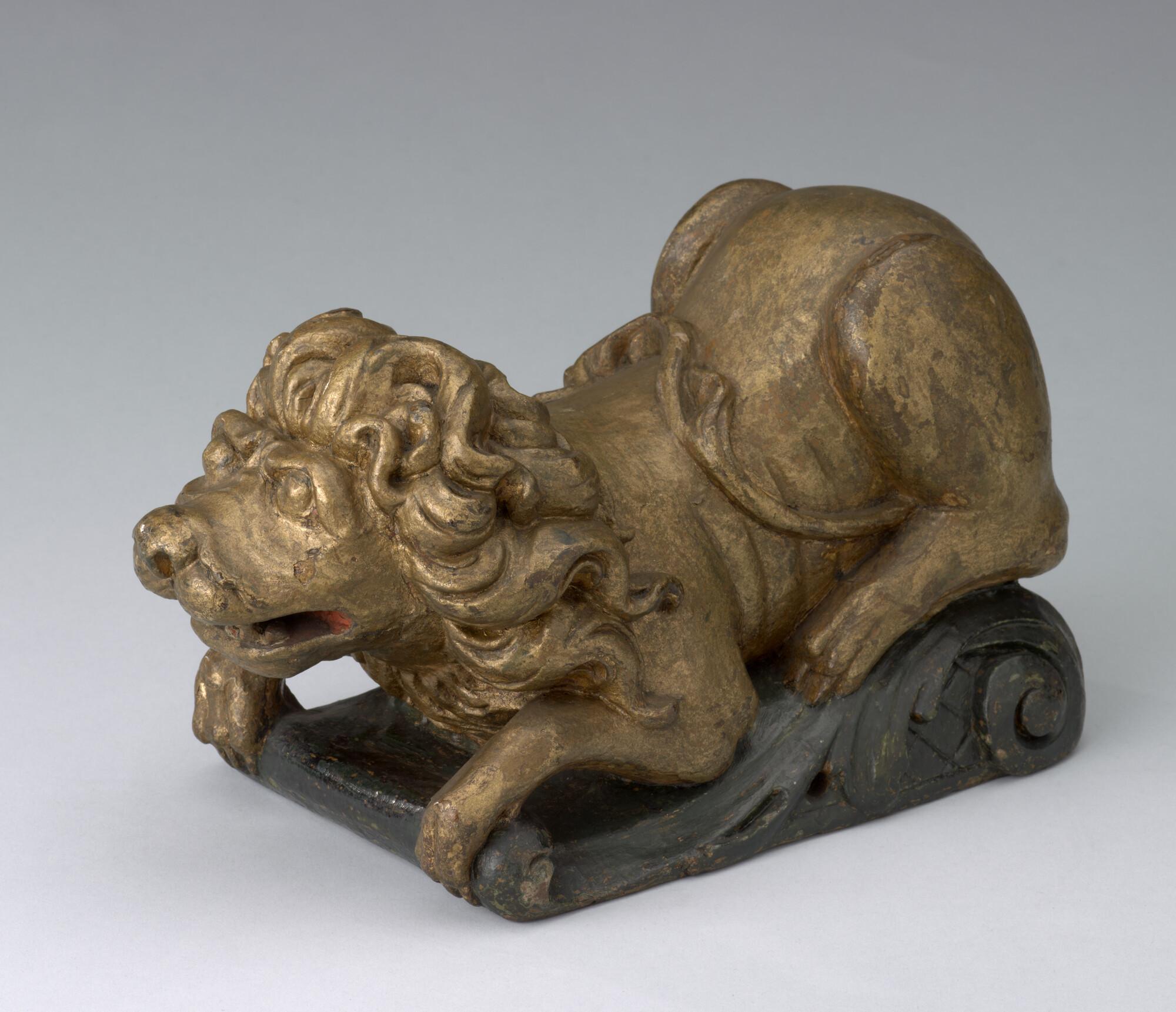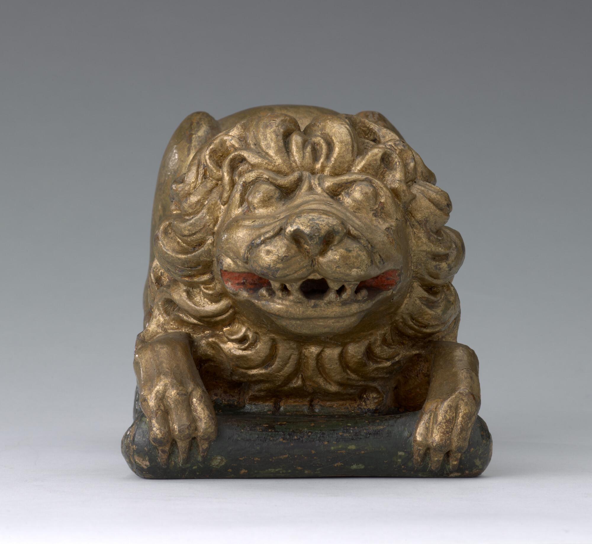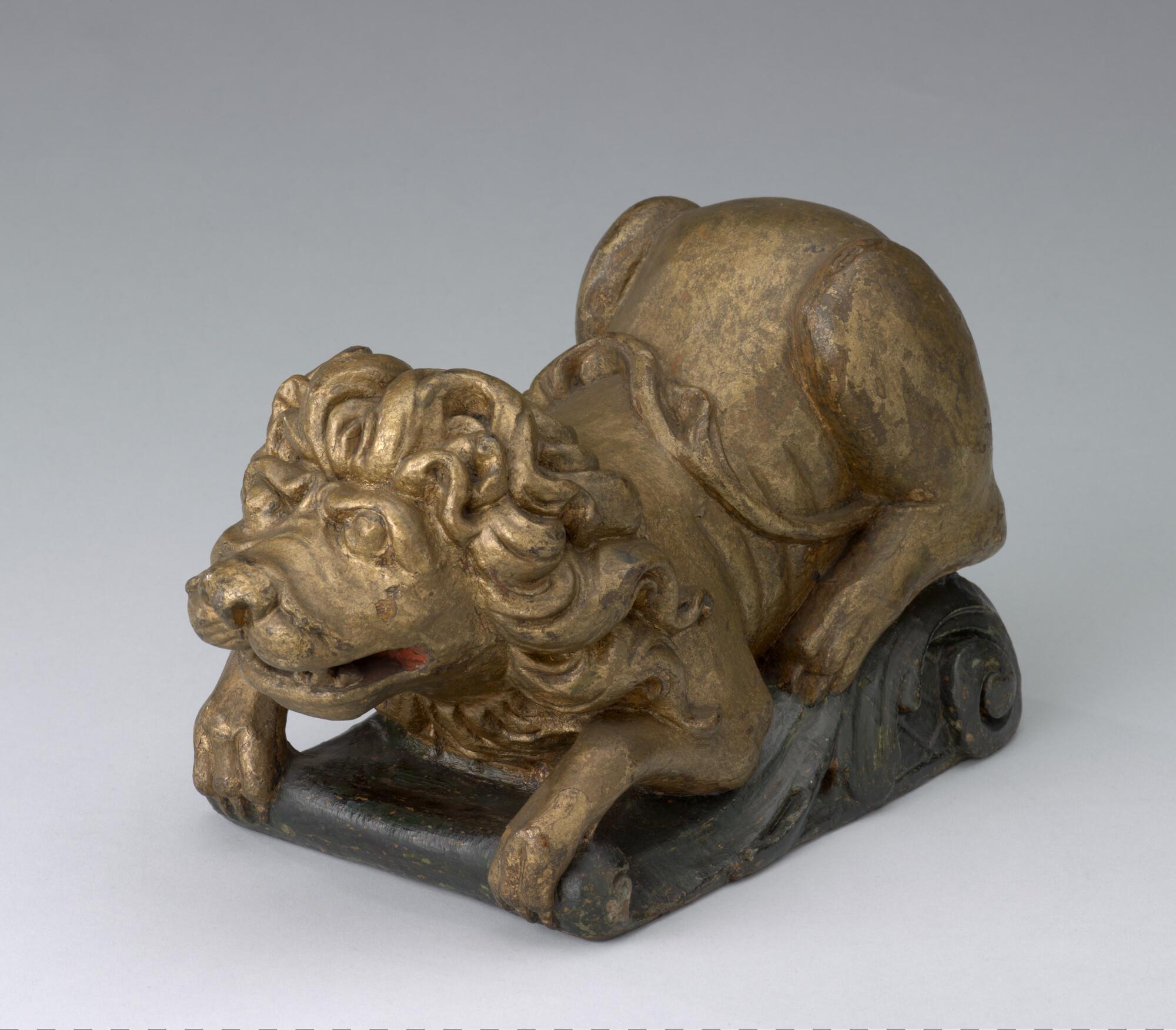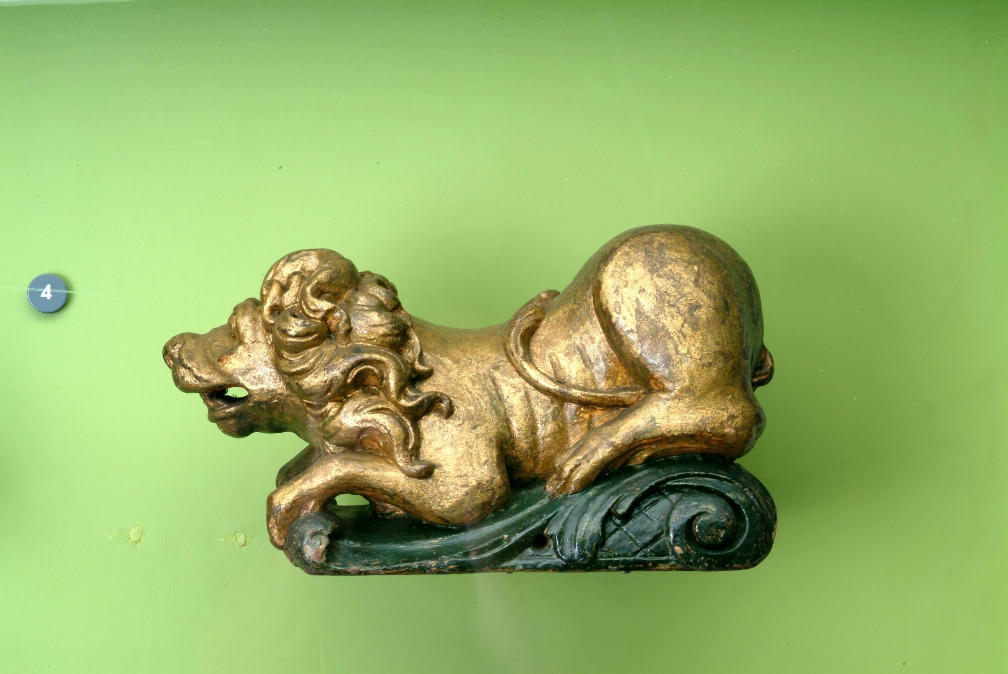 Roerkop in de vorm van een liggende leeuw. De vergulde leeuw ligt met de voorpoten naar voren gestrekt op een zwarte sokkel.