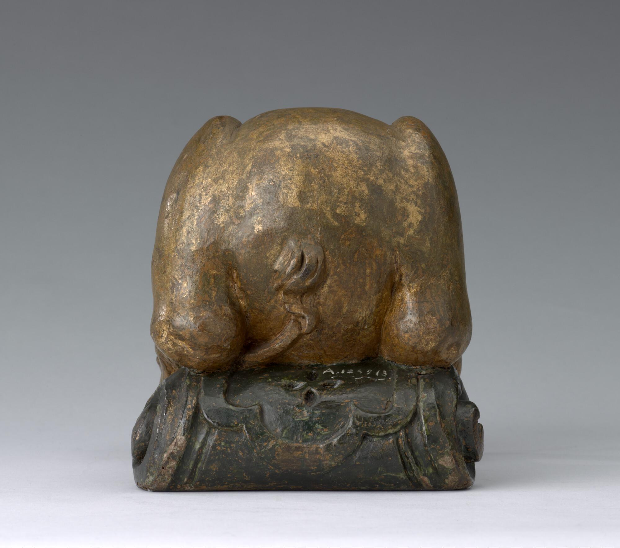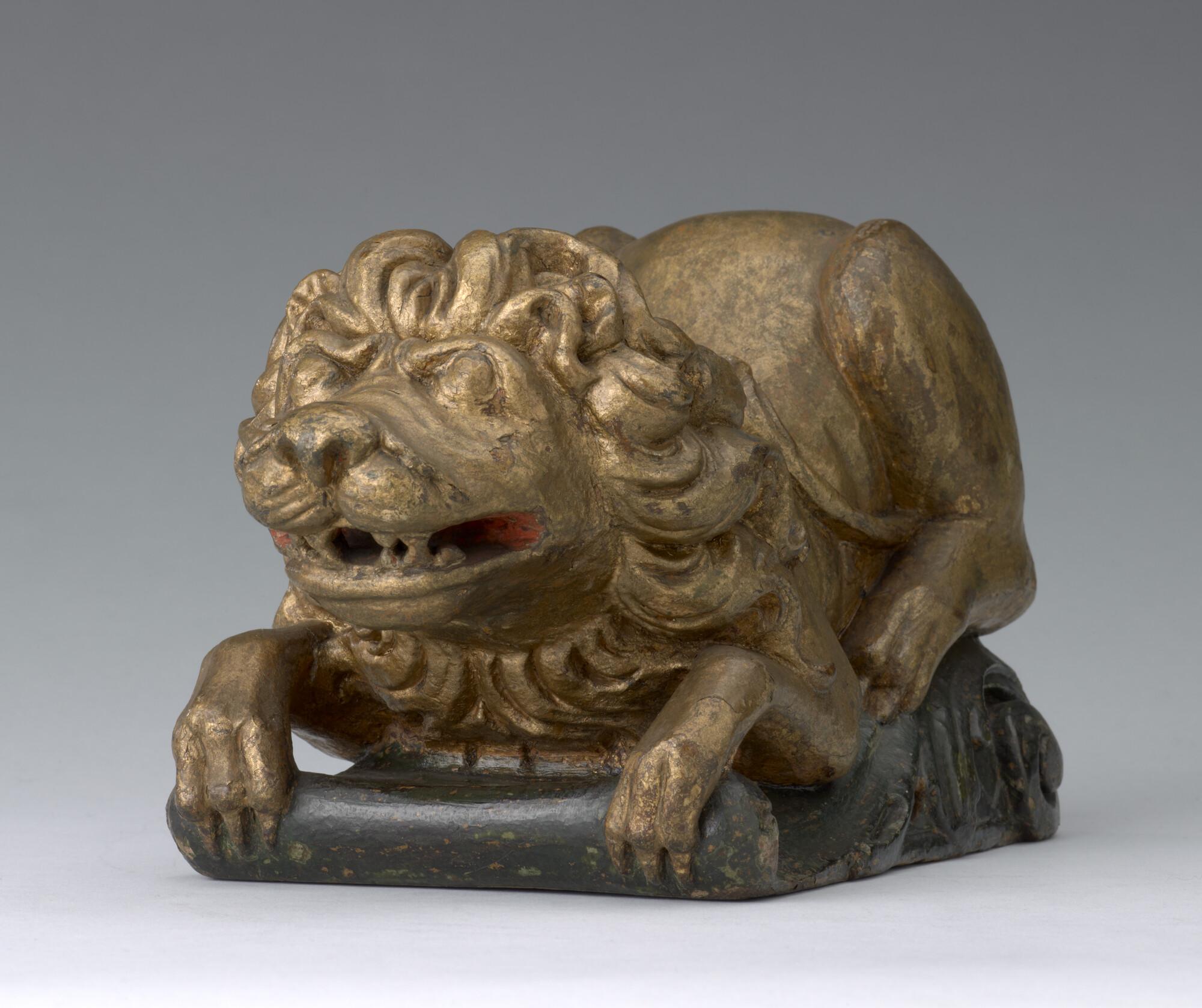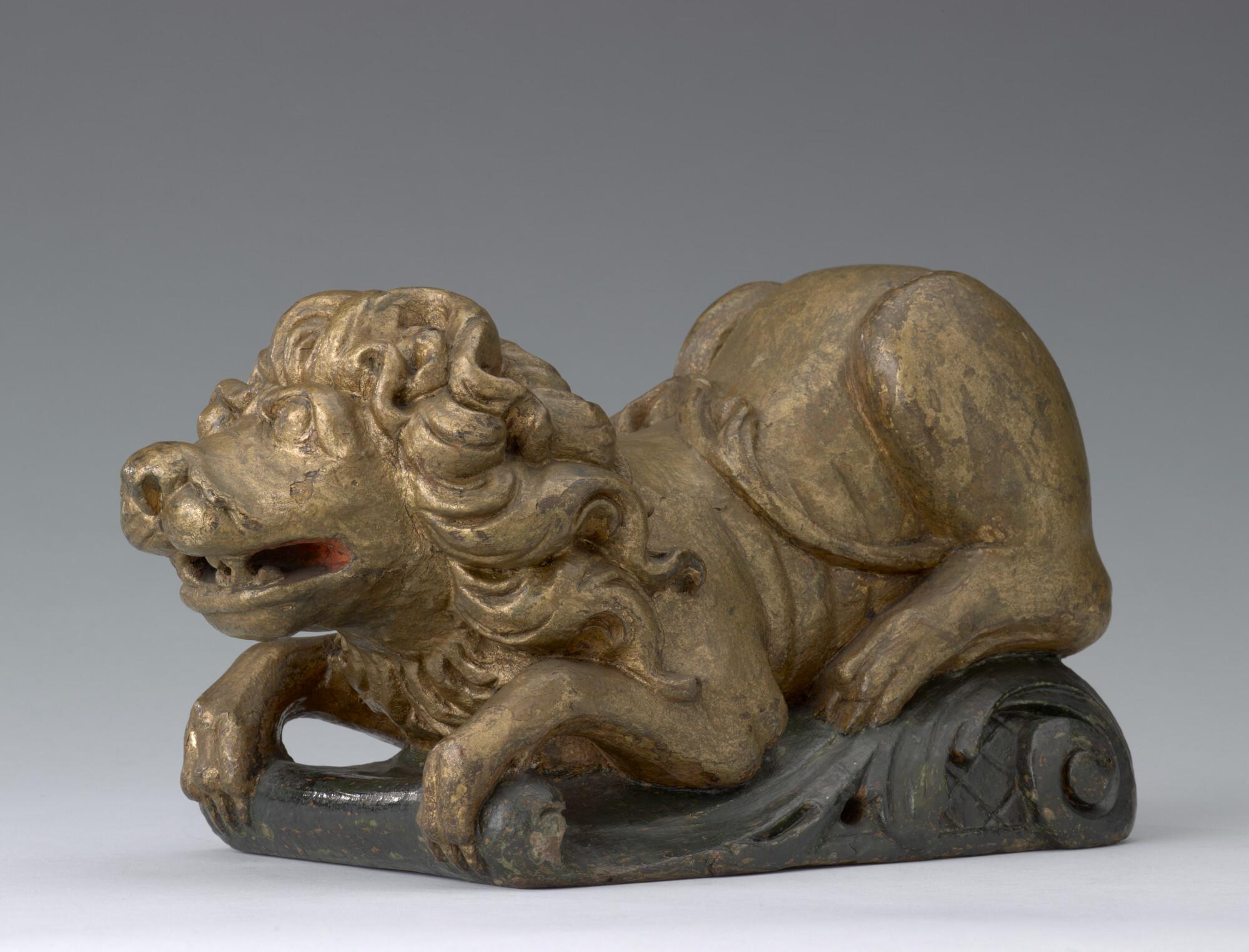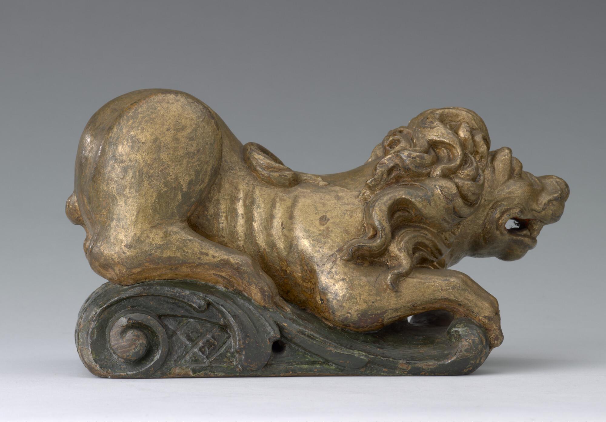 Roerkop in de vorm van een liggende leeuw. De vergulde leeuw ligt met de voorpoten naar voren gestrekt op een zwarte sokkel.