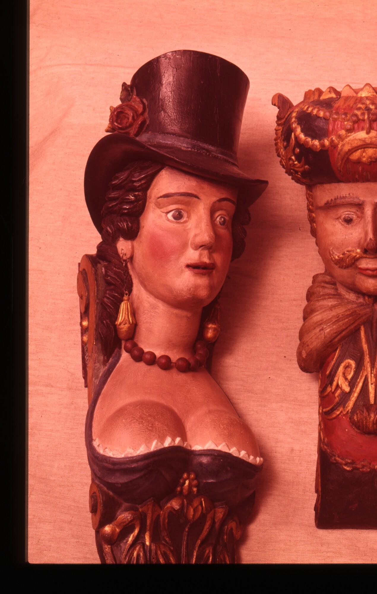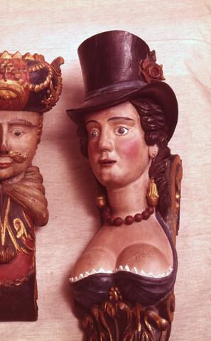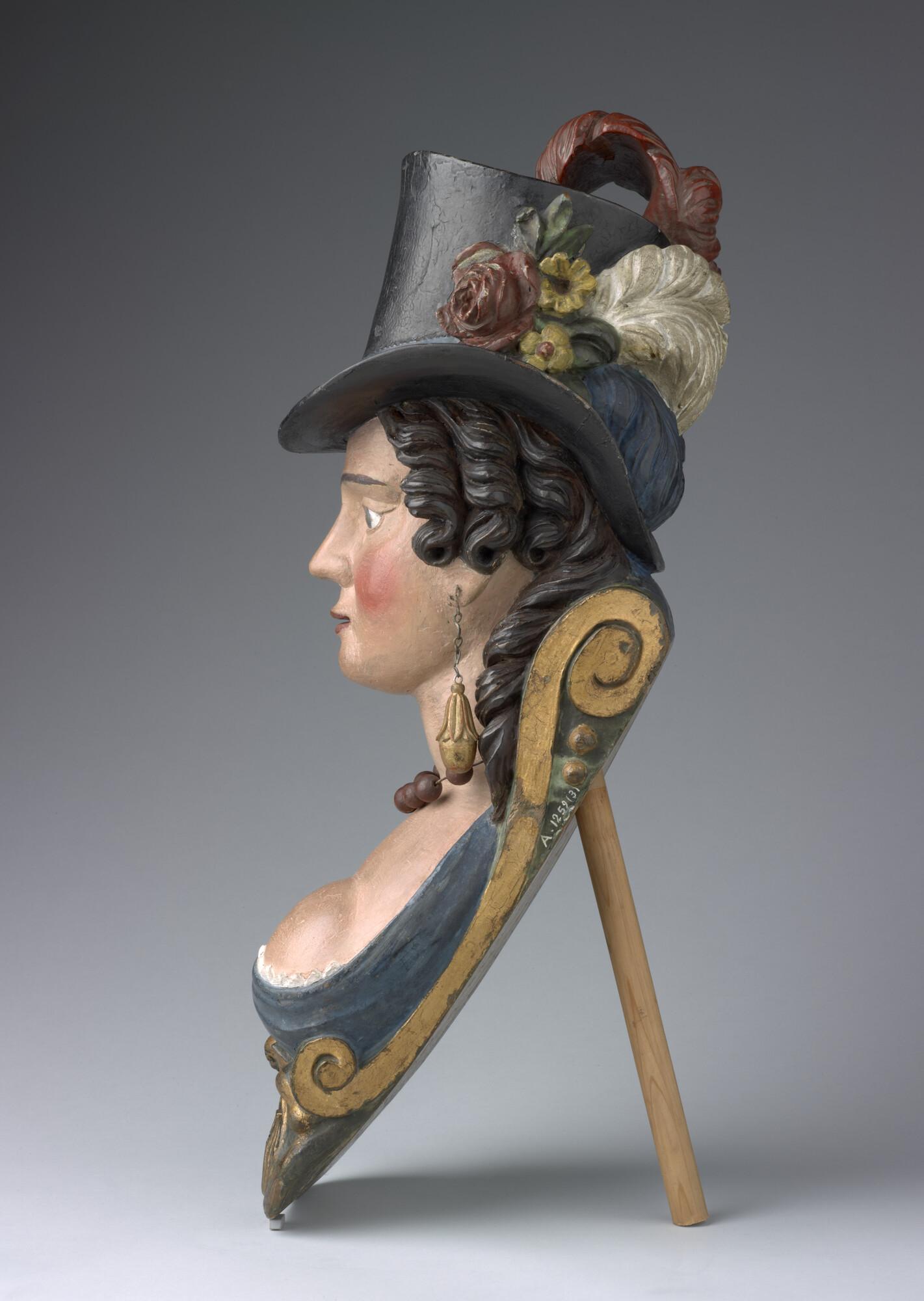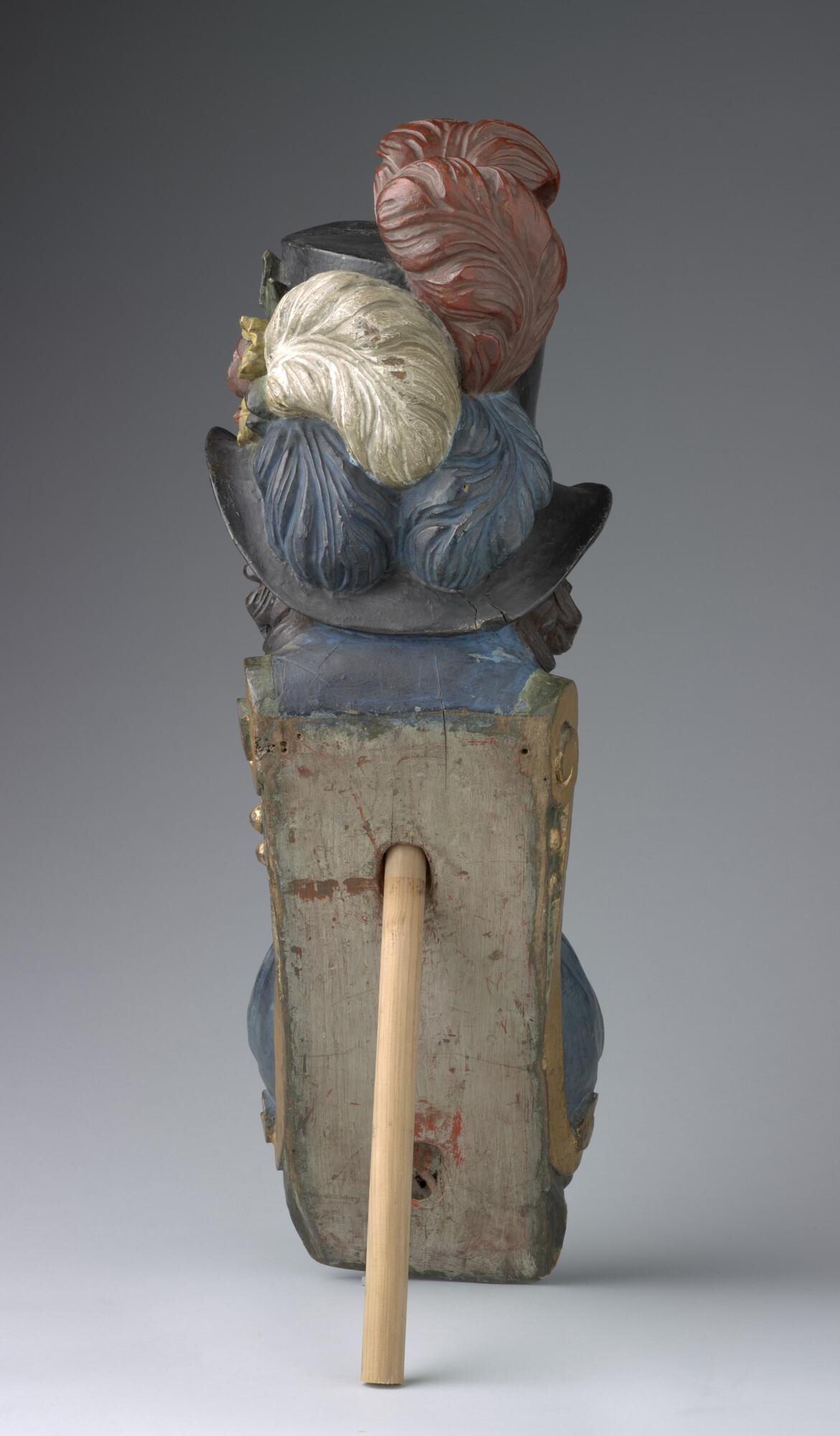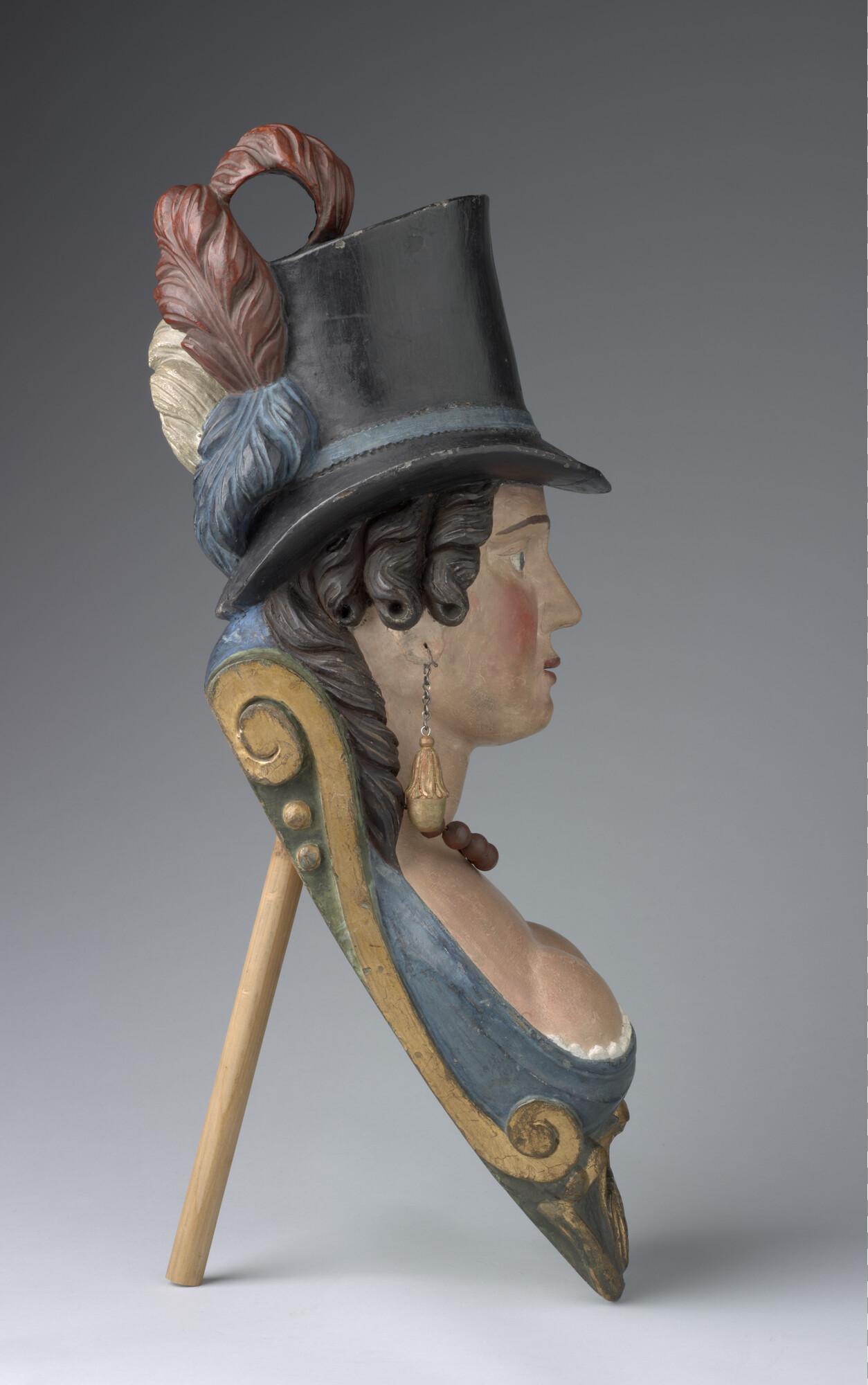 Roerkop in de vorm van een vrouwenhoofd met een zwarte hoge hoed met rood, wit, en blauw-zwarte veren en bloemen op blauwe gekartelde hoedband.