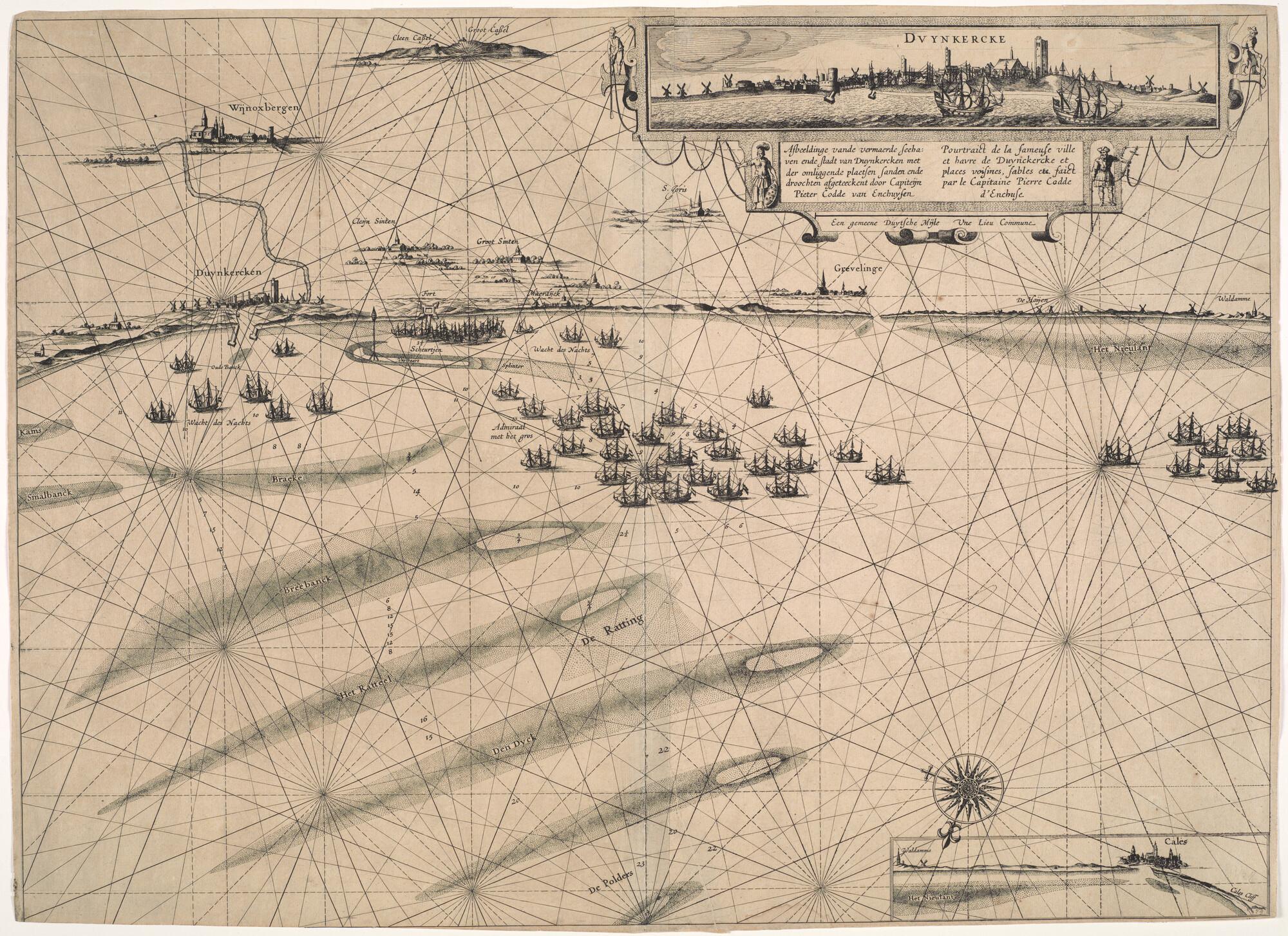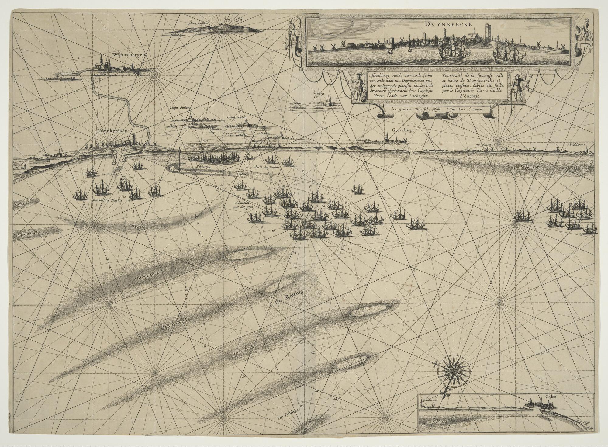 Kaart en aanzicht van Duinkerken, Calais en omliggende plaatsen, 1631 door Pieter Codde van Enkhuizen. Titel in Nederlands en Frans. Met aanzicht van Duinkerken en Calais (schaal 1 op 150.000).