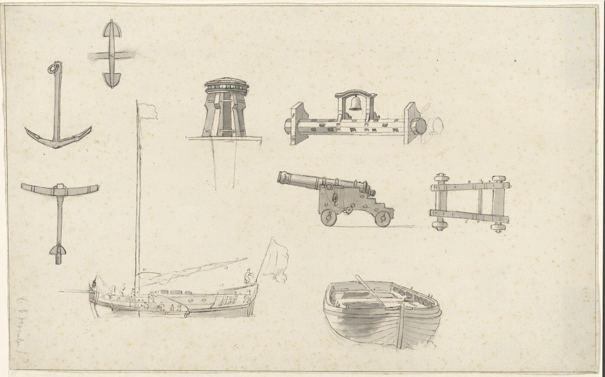 Een spiegelpaviljoenjacht; drie ankers; een kaapstander; twee rolpaarden waarvan een met kanon en een sloep.
