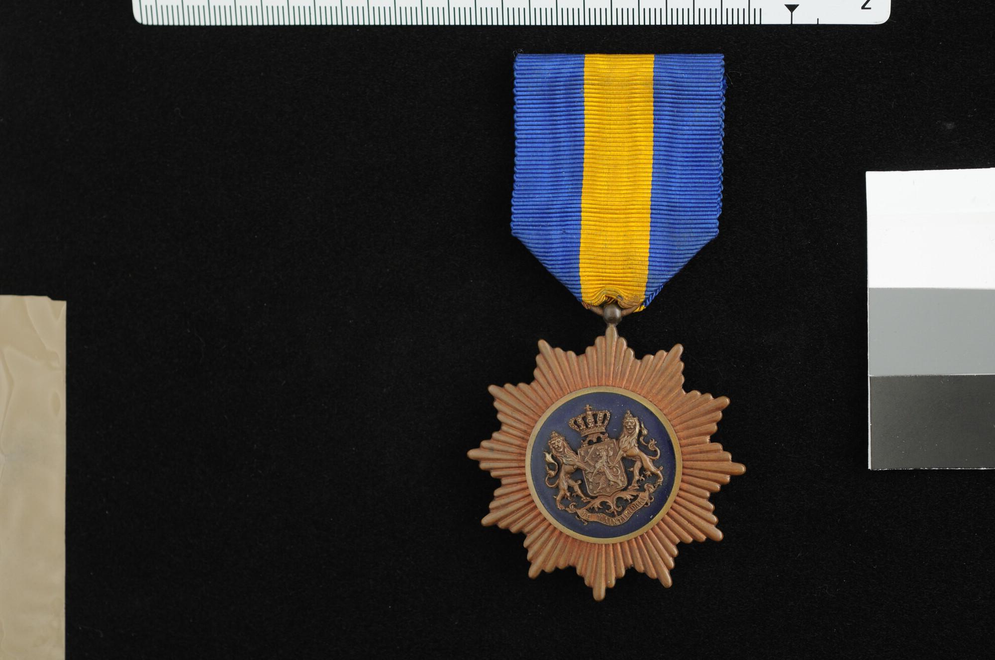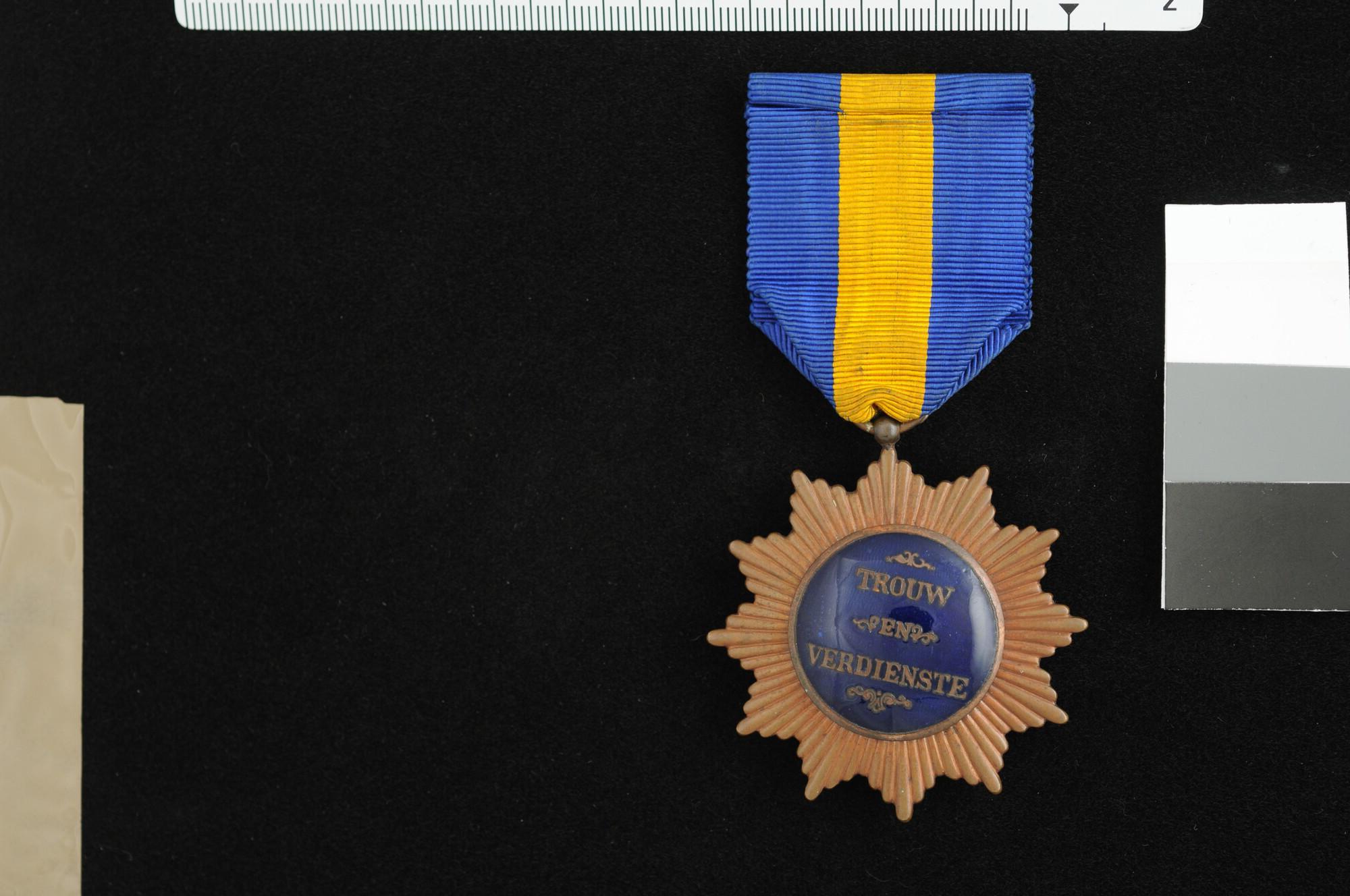 Bronzen Ster voor Trouw en Verdienste ingesteld in 1894, met blauworanje lint. Ingesteld als onderscheiding voor de Indonesische bevolking van Nederlands-Indë.