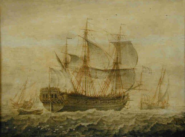 Grisaille van een driemaster van 14 stukken zeilend voor Brielle. Op de achtergrond een statenjacht.