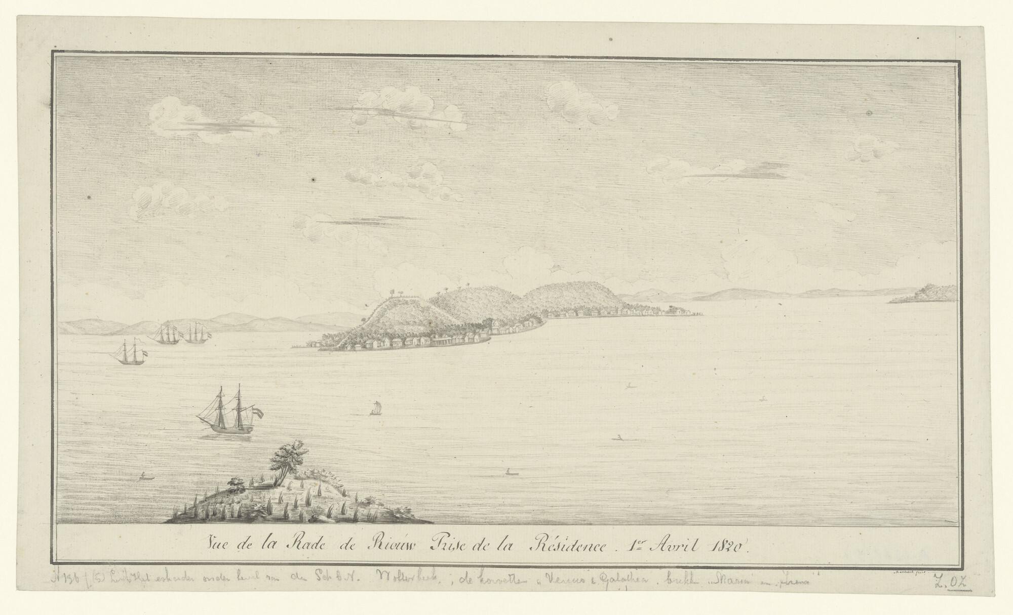 Het eskader onder bevel van Schout-bij-Nacht C.J. Wolterbeek op de rede van Riouw, 1 april 1820.