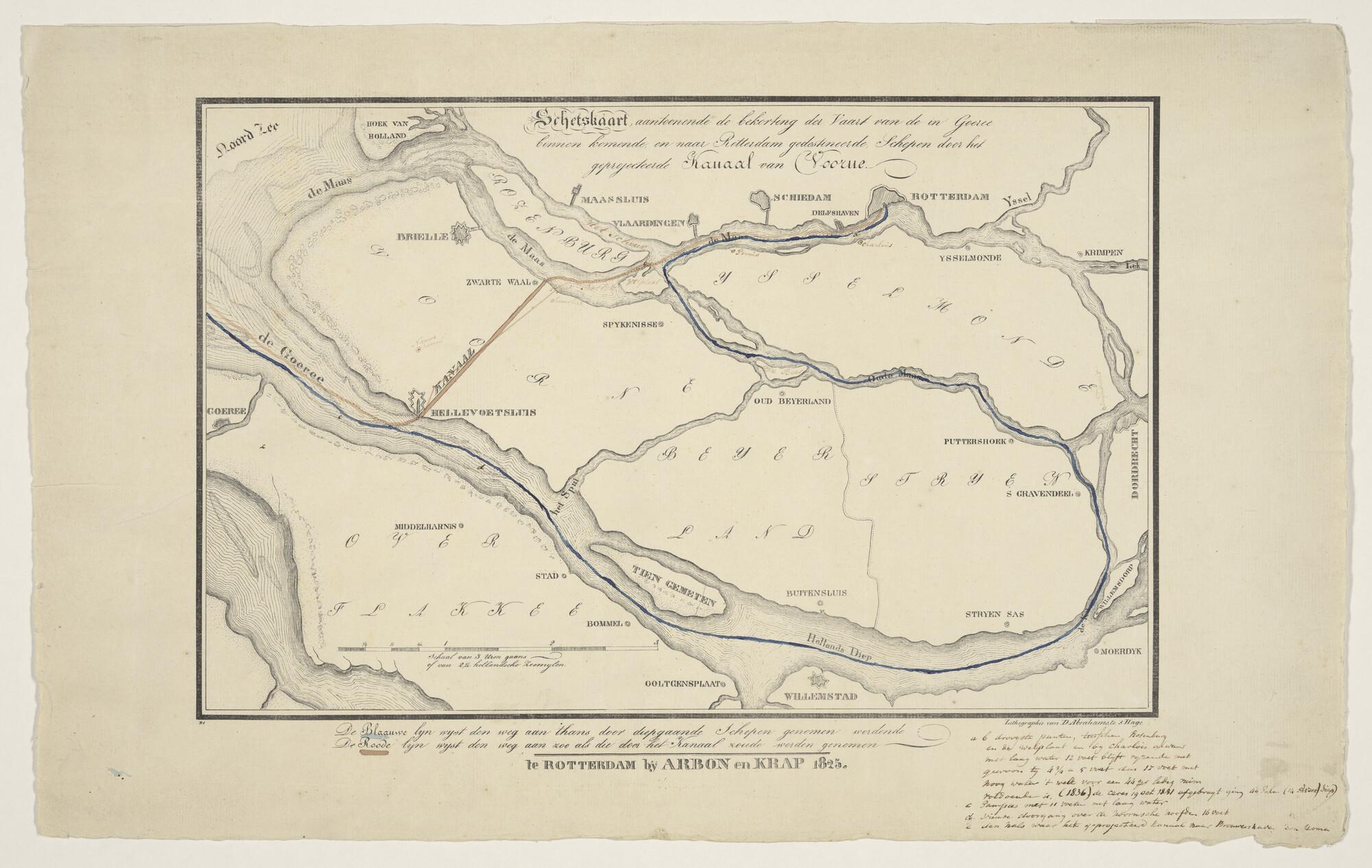 Kaartje met ingetekend (gekleurd) het traject van het Voornse Kanaal. Litho door D. Abrahamse, Den Haag, uitgave Arbon & Krap, [Rotterdam] 1825.